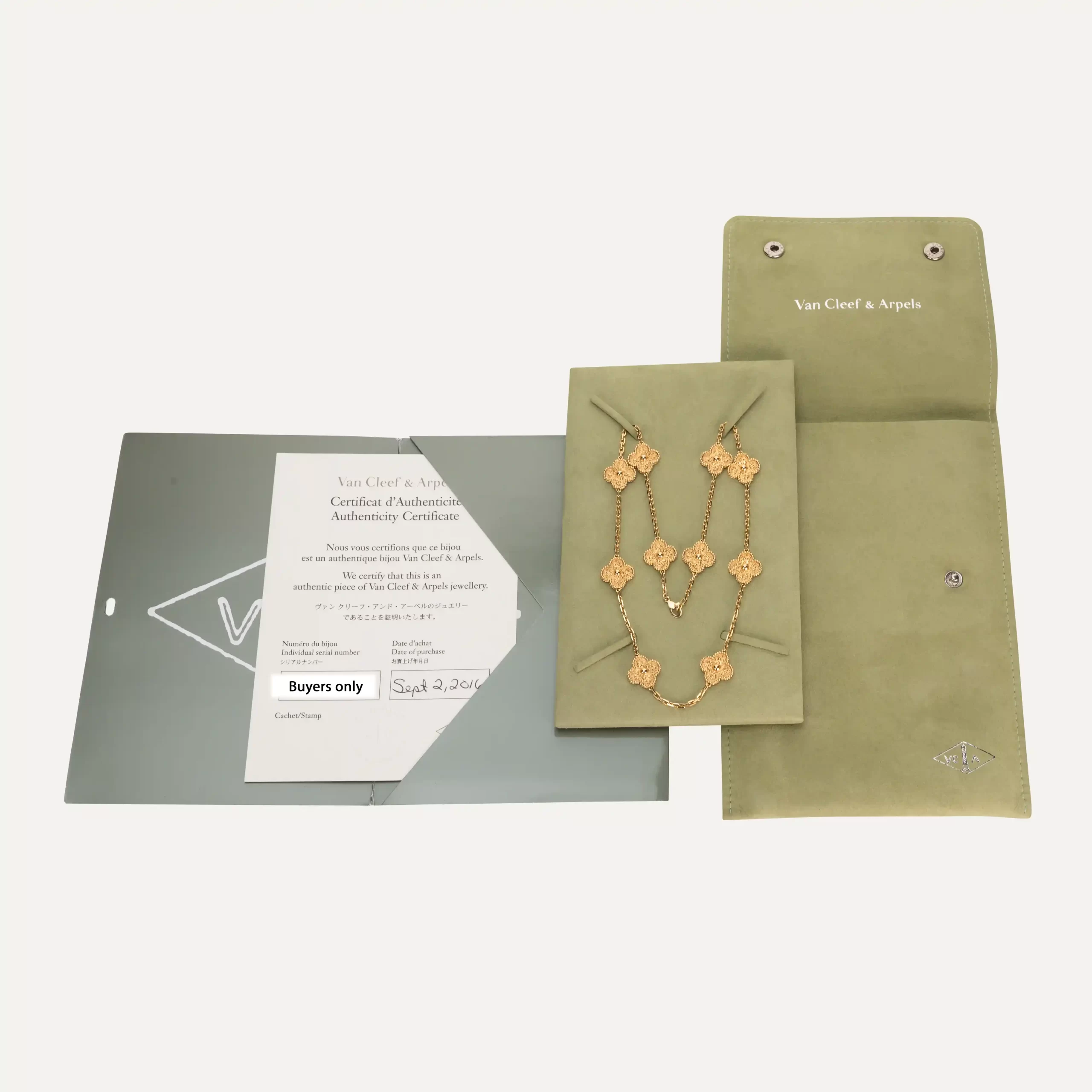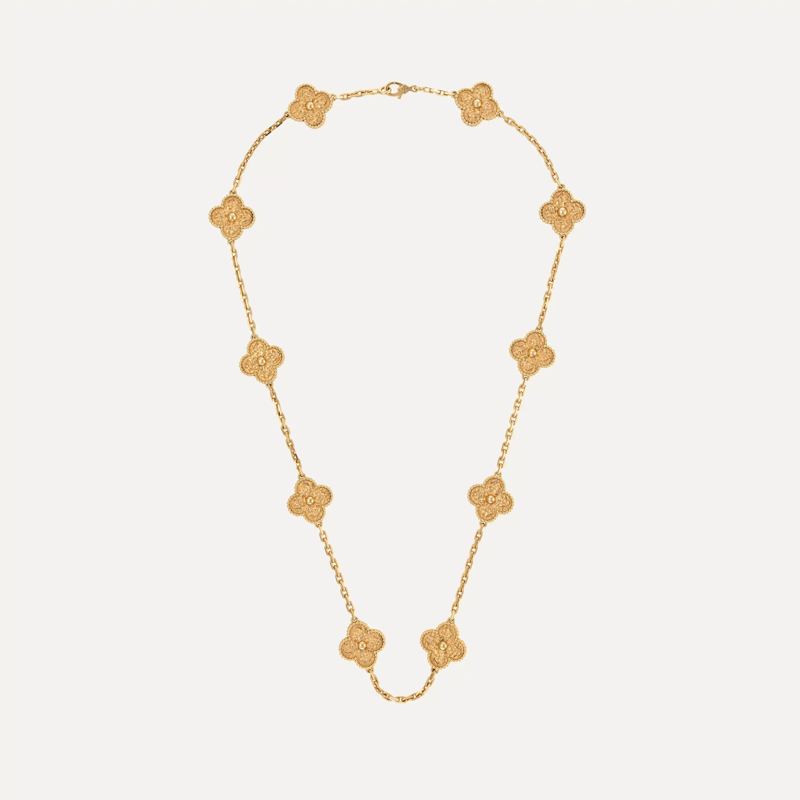 An absolute icon of French high jewelry, this Van Cleef & Arpels Alhambra necklace in yellow gold features 10 emblematic motifs, a timeless symbol of luck, elegance, and sophistication.