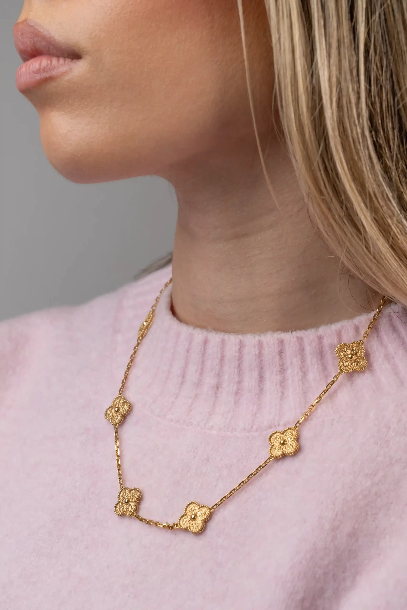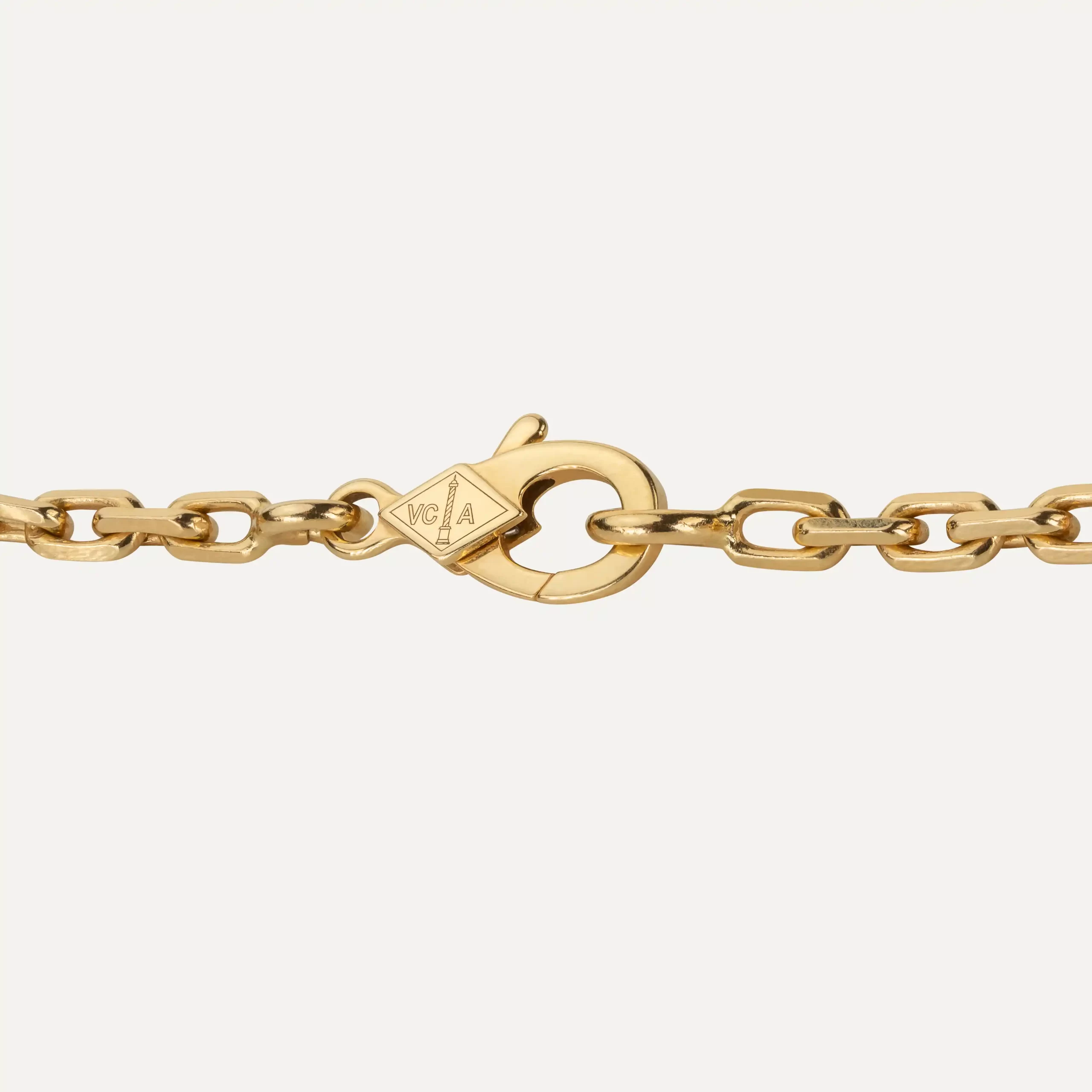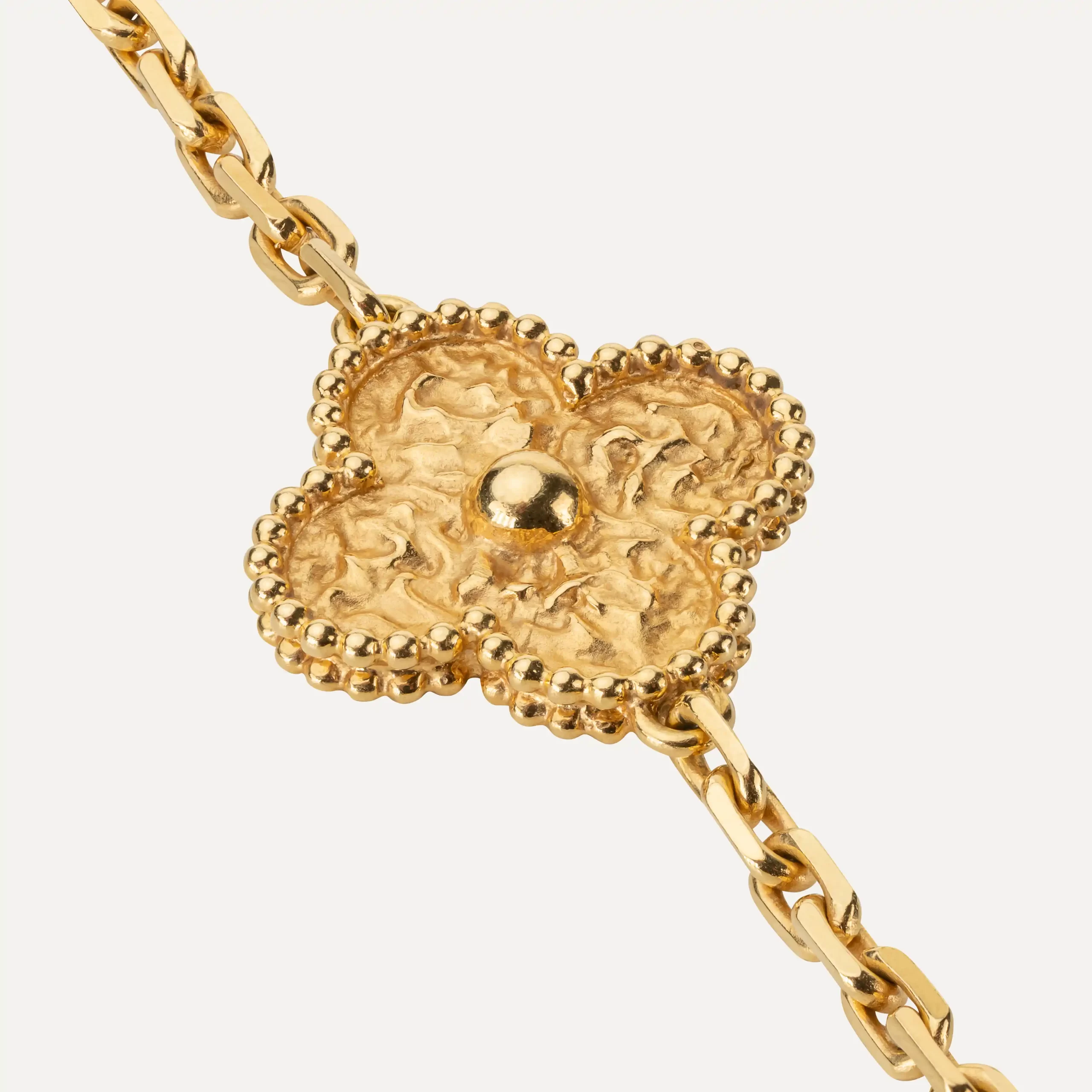 Created in keeping with the maison’s exceptional savoir-faire, each Alhambra motif is meticulously crafted, revealing a delicate textured finish that lends depth, brilliance, and character to the piece. The yellow gold chain harmoniously balances the design, offering an elegant and versatile drape.