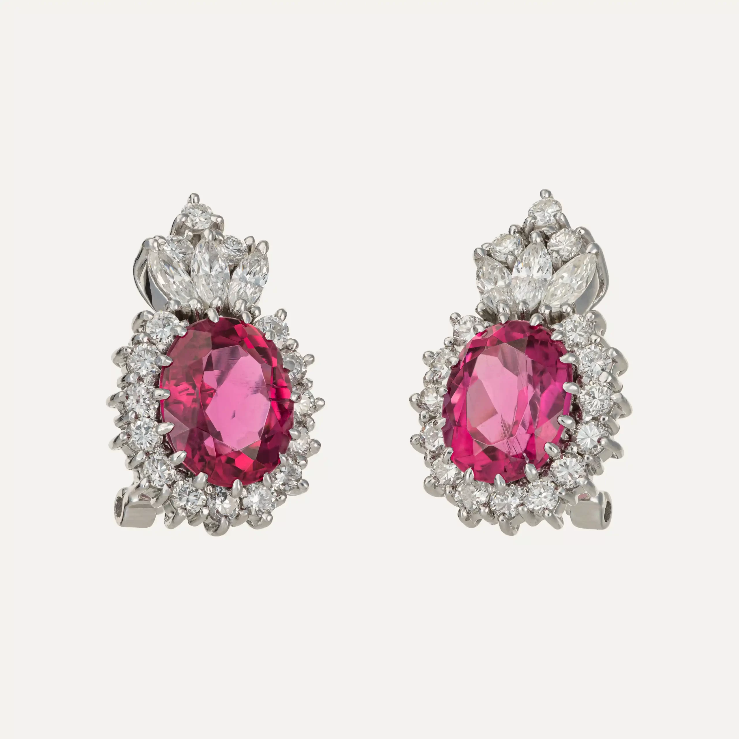 At the centre of each earring are vivid pink tourmalines, cut in an oval shape, surrounded by a delicate arrangement of diamonds that enhance the depth of colour of the central stones and lend exceptional brilliance to the overall design. The harmonious setting of the gemstones reflects craftsmanship of the highest precision, characteristic of fine jewellery.