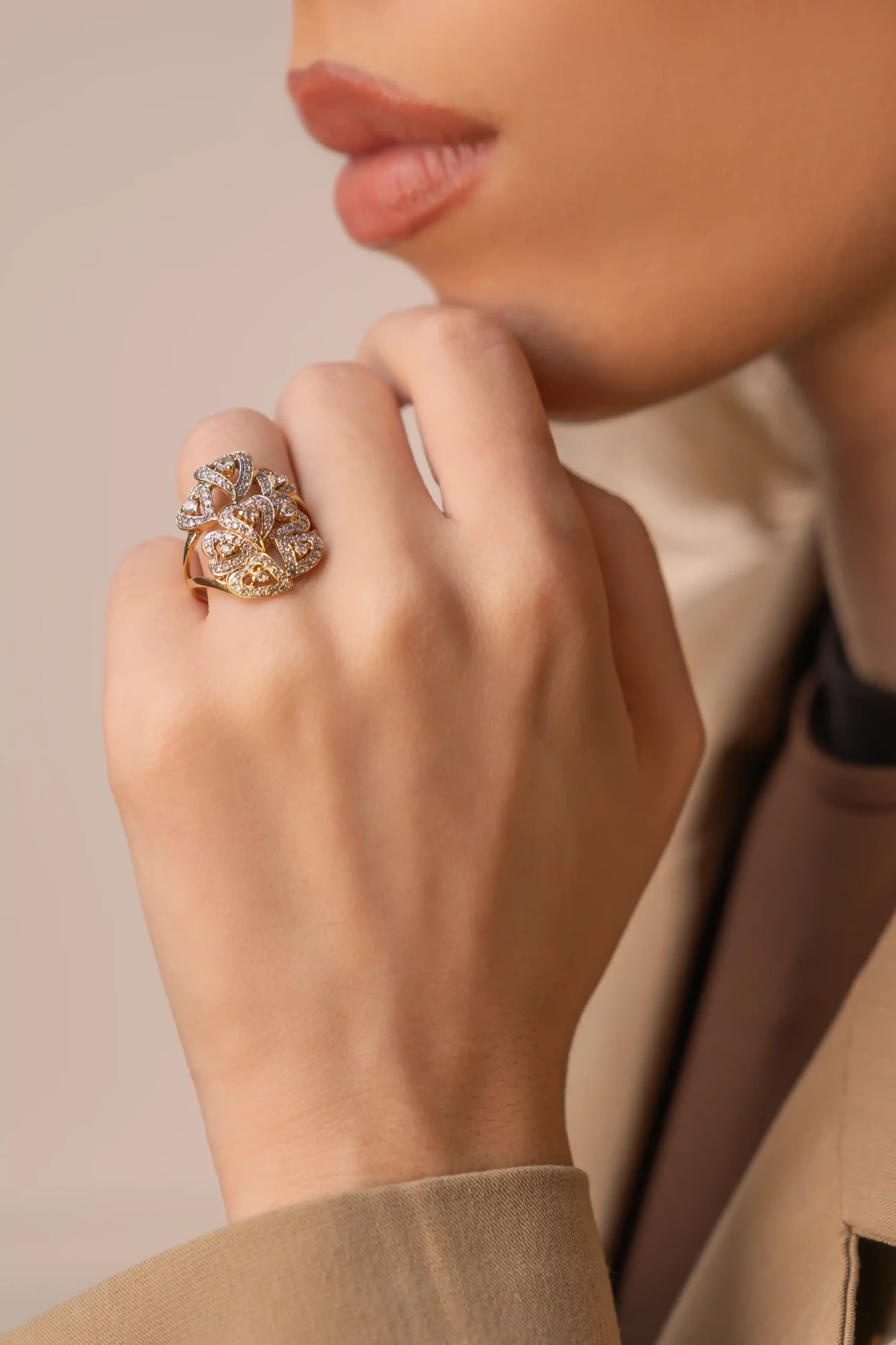 This 18 kt yellow gold ring, set with approximately 1.26 ct of brilliant-cut diamonds, is a captivating statement of elegance and artistry. The design features an intricate arrangement of openwork heart motifs, each delicately outlined with pavé-set diamonds that radiate an exceptional brilliance.