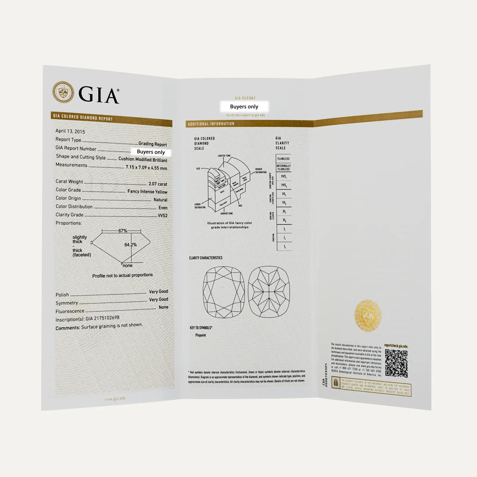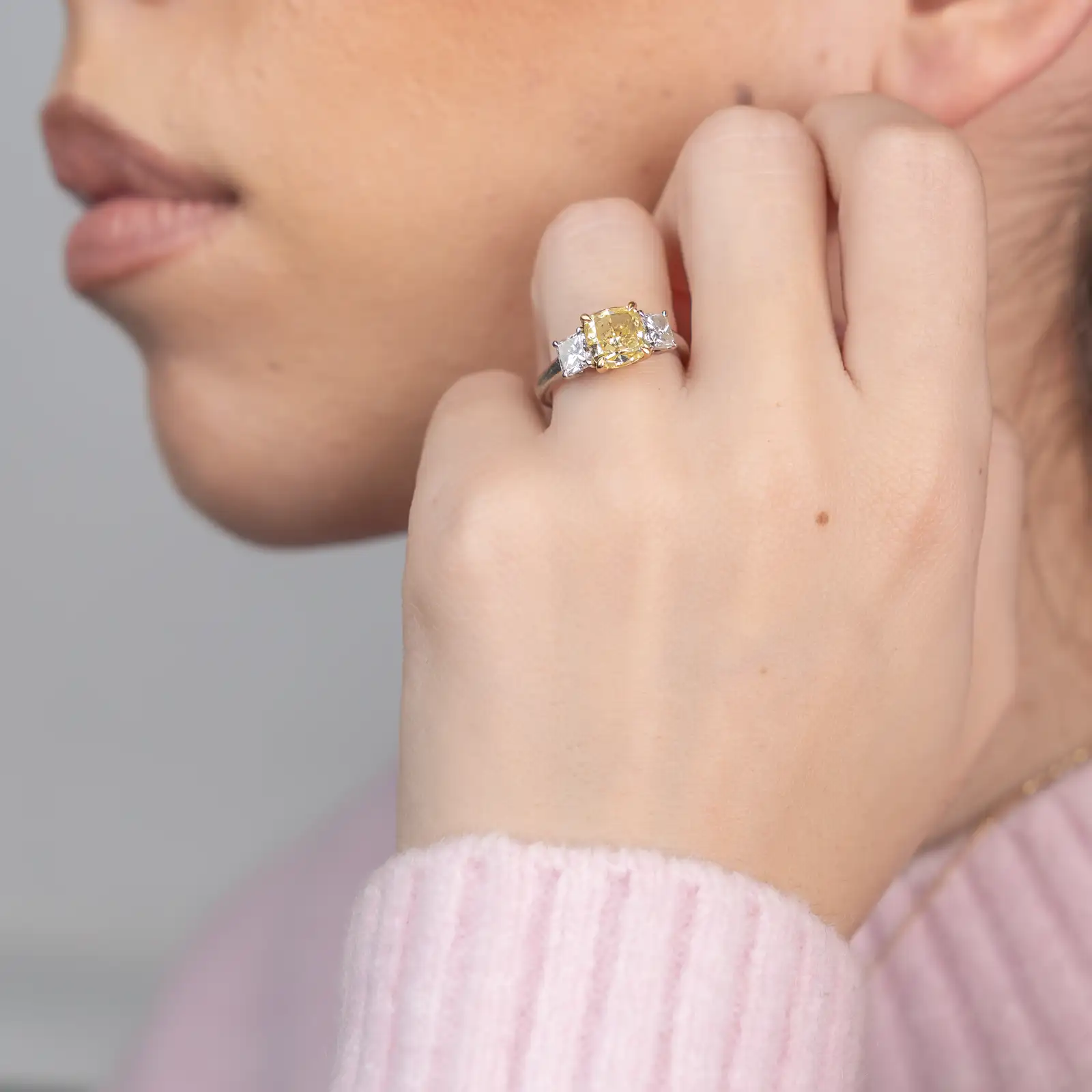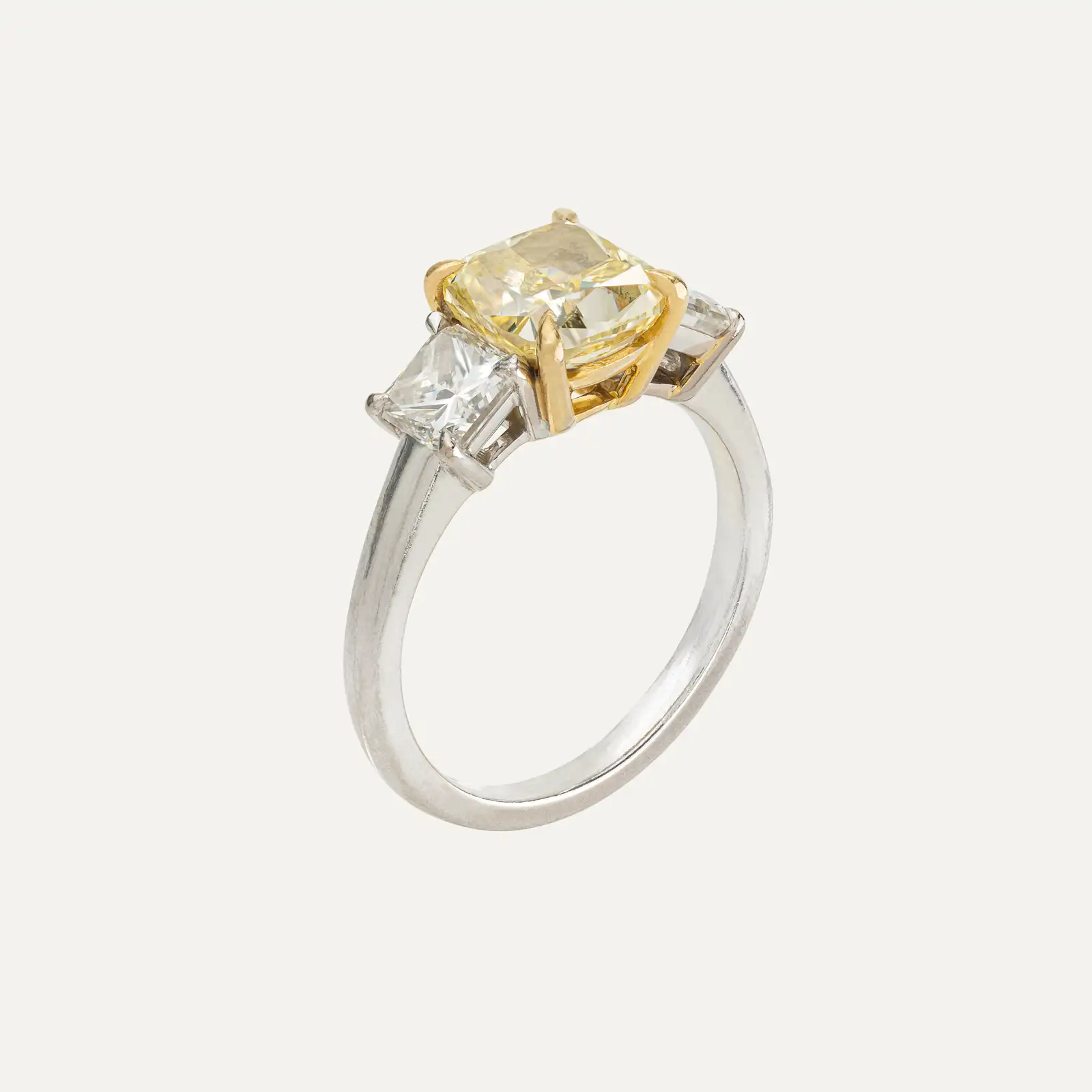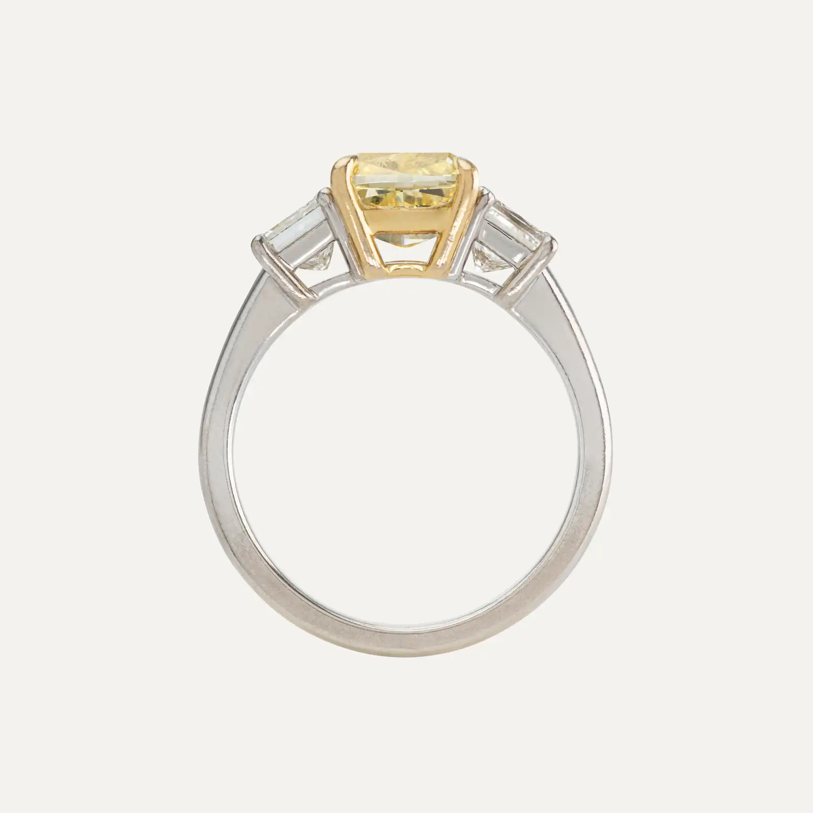 A ring that radiates distinction. Crafted in 18ct (750‰) white gold, it features at its centre a magnificent 2.07 ct Fancy Intense Yellow cushion-cut diamond, prized for its rare hue, flanked by two princess-cut diamonds of 1 ct, which enhance its brilliance and lend balance to the design.