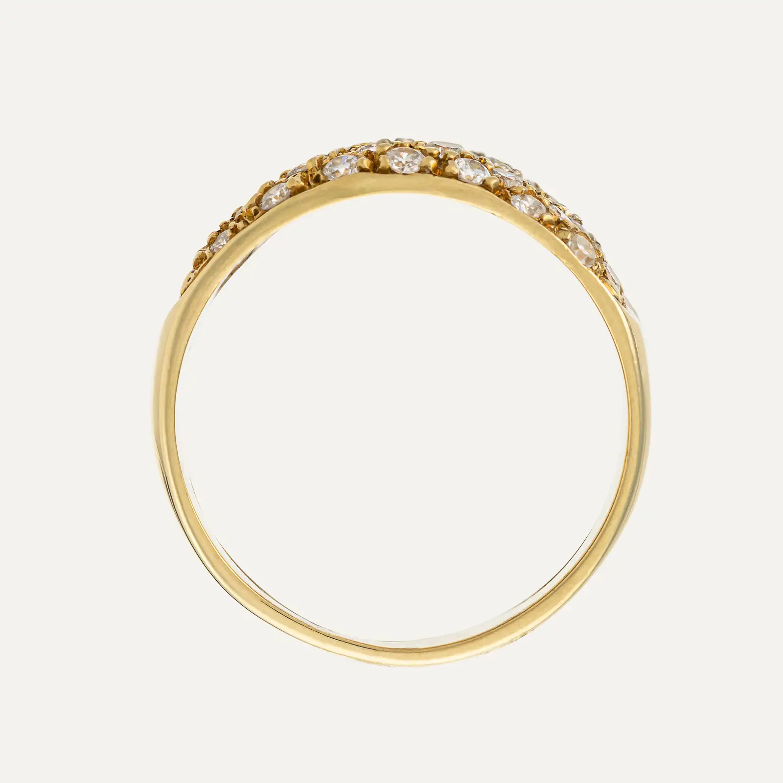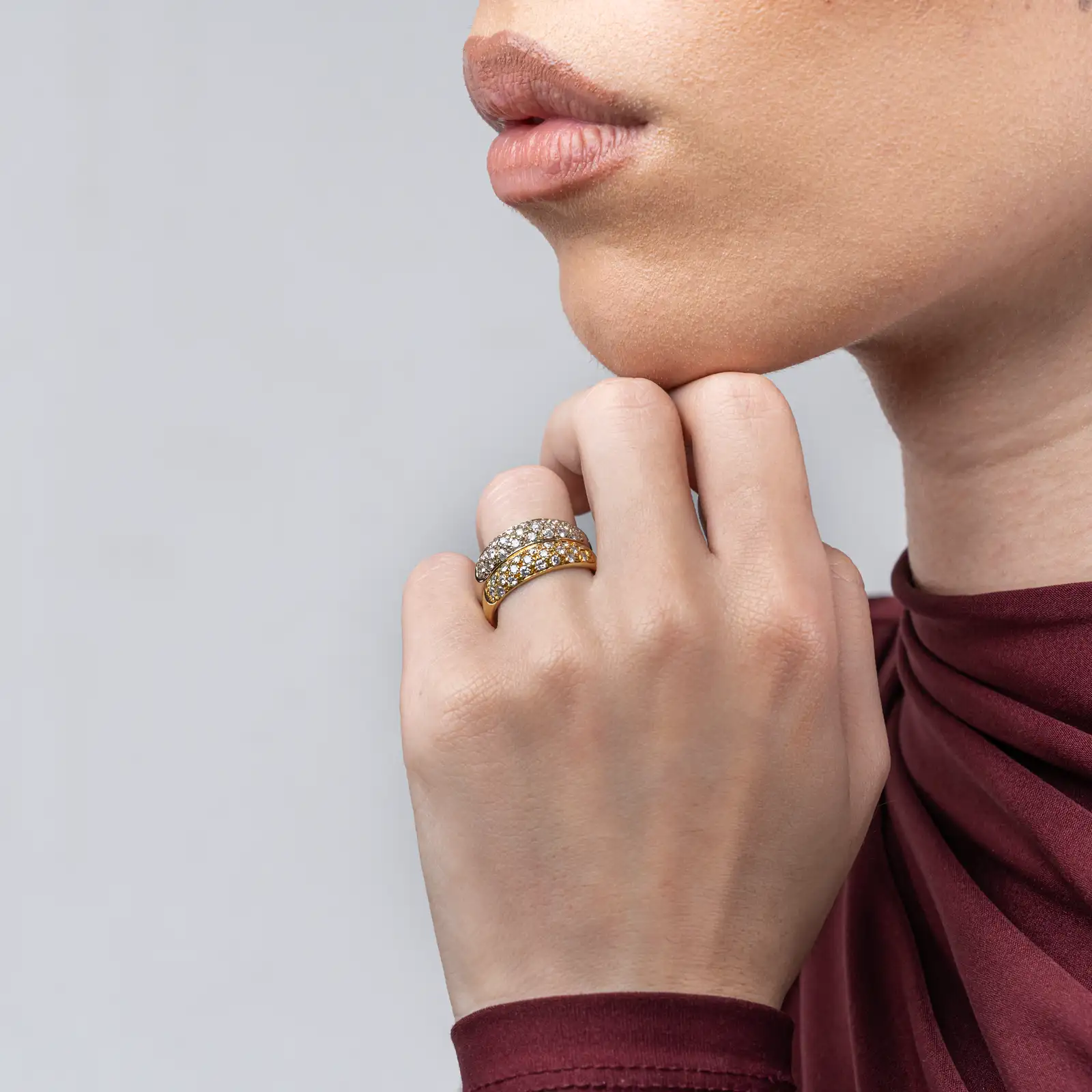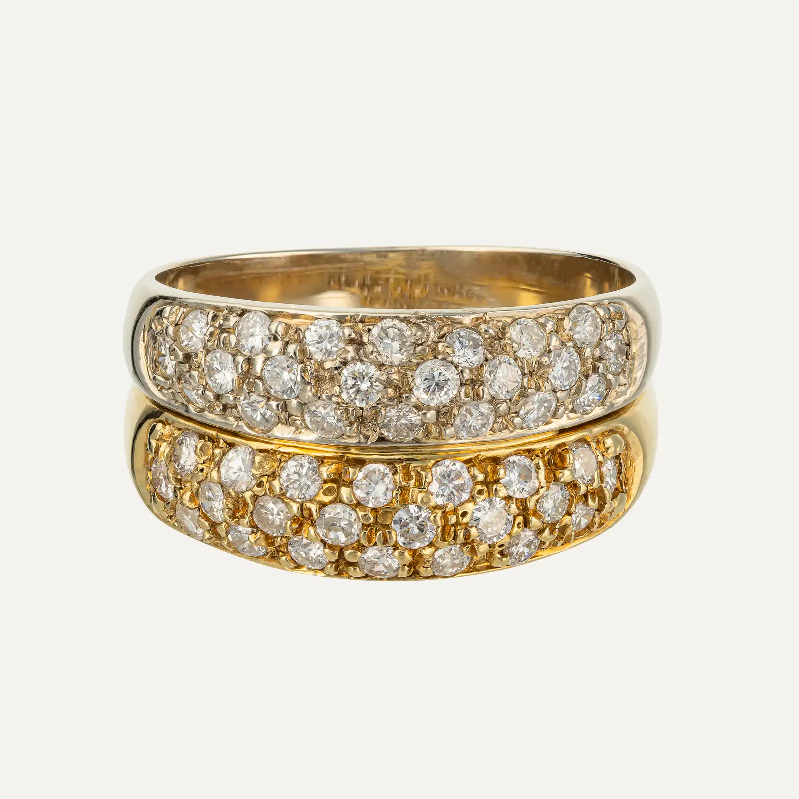 Both bands are fully set with a delicate pavé of 44 diamonds, totalling 0.88 ct, carefully mounted to offer continuous and even brilliance. The contrast between the warm tone of yellow gold and the luminosity of white gold lends depth and character to the jewel, making it both modern and timeless.