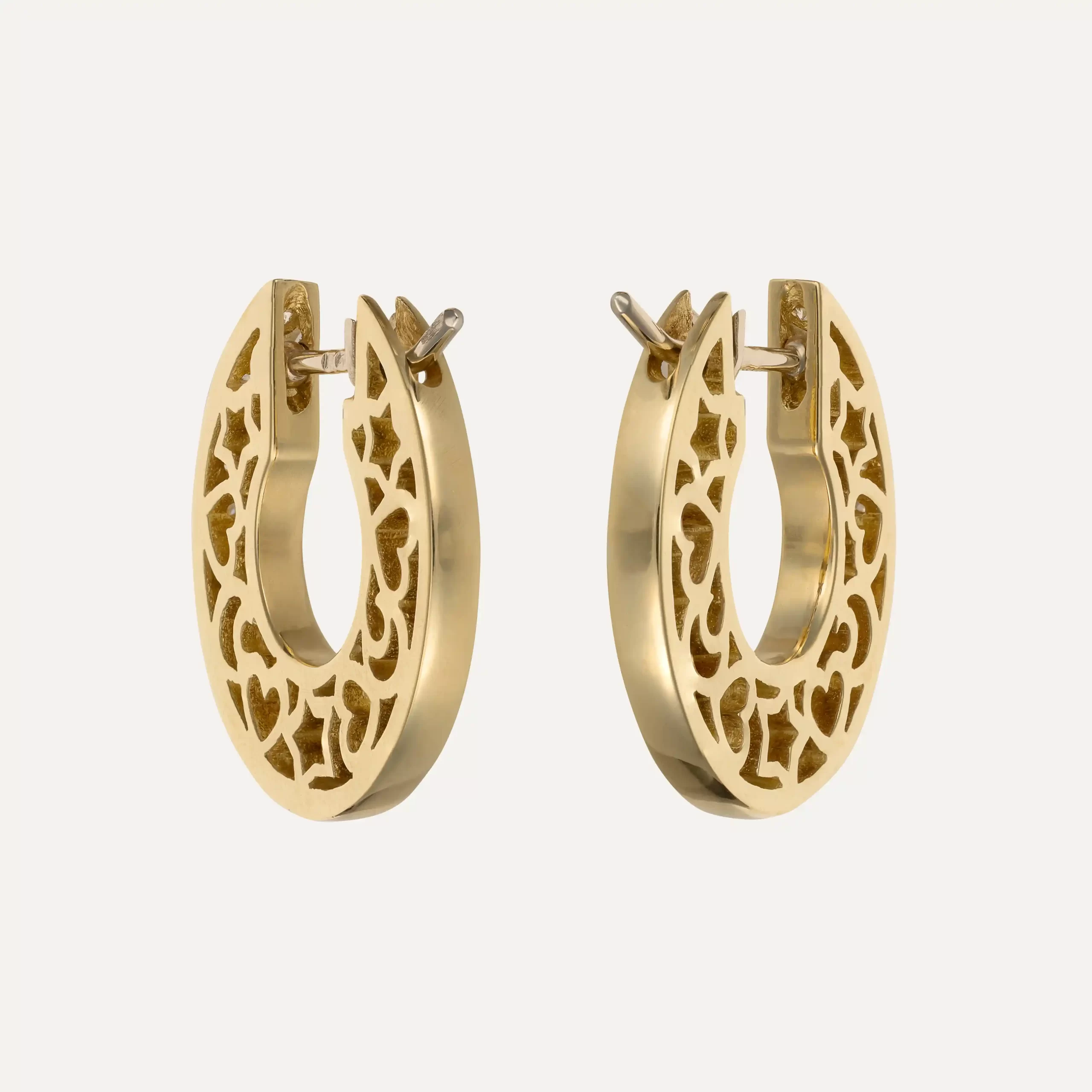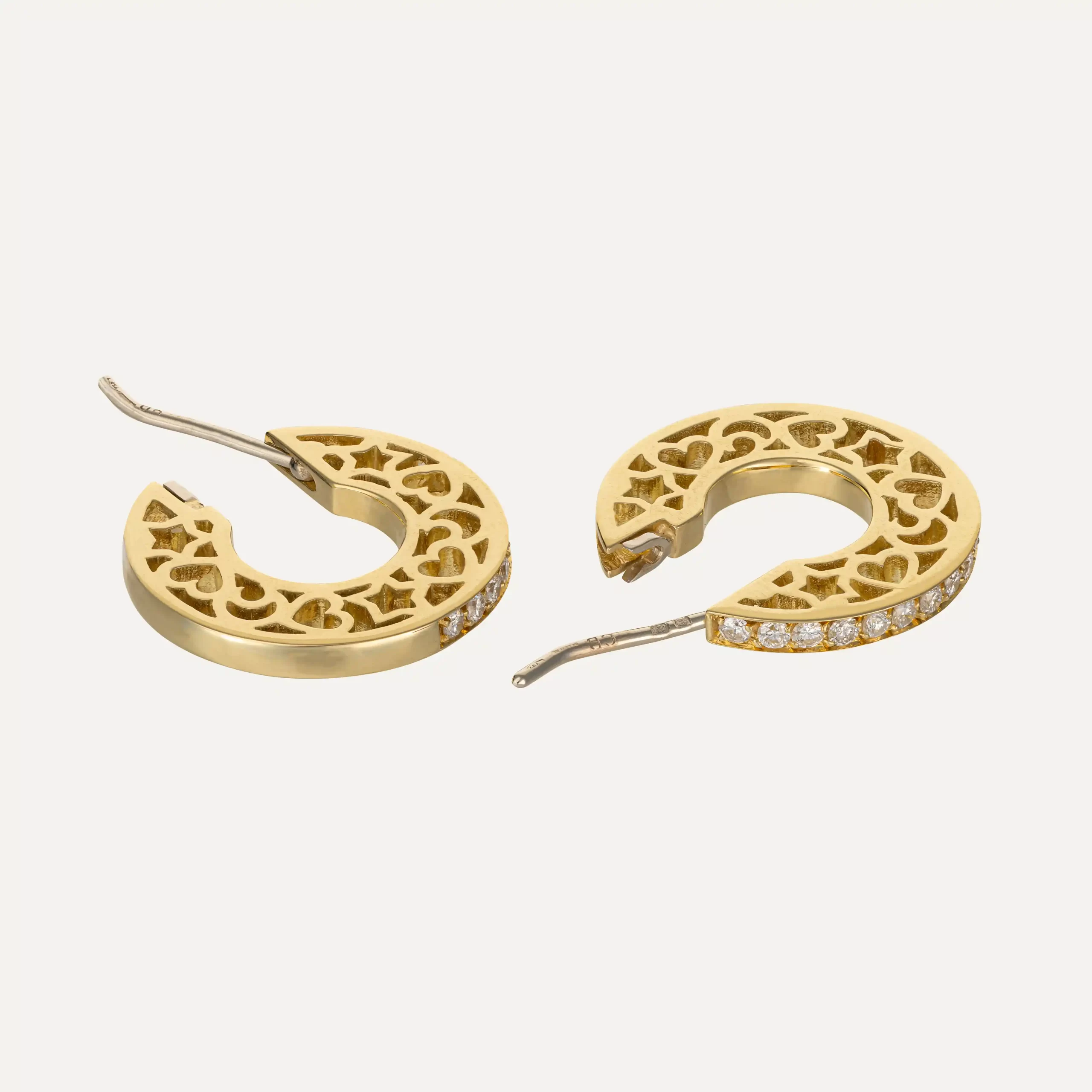 On the side, a delicate interplay of star, heart, and crescent-shaped cutouts adds depth, symbolism, and a poetic character to the design, revealing highly precise craftsmanship. The contrast between the brilliance of the diamonds and the openwork texture of the gold creates a contemporary aesthetic with classical inspiration.