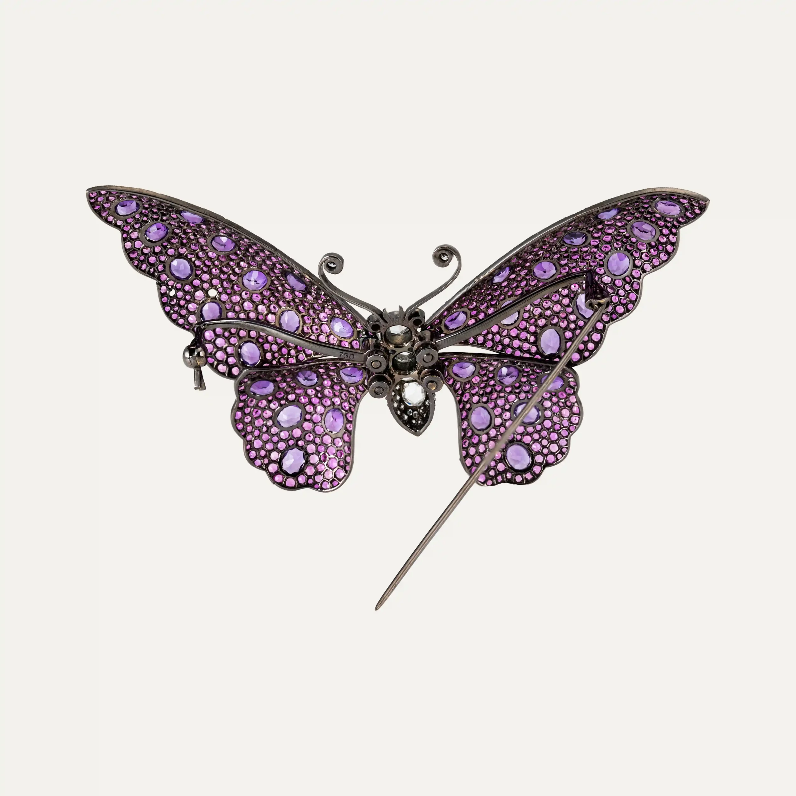 18 kt – 750 ‰ gold with black rhodium plating butterfly-shaped brooch. The wings, richly decorated with 900 sapphires and 34 pavé-set amethysts, are distinguished by the detail of the movable wings, which adds a surprising and delicate character, bringing the piece to life and evoking the natural lightness of a butterfly. The body is enhanced by 46 pavé-set diamonds and 4 centre diamonds, totalling arrond 2.30 ct.