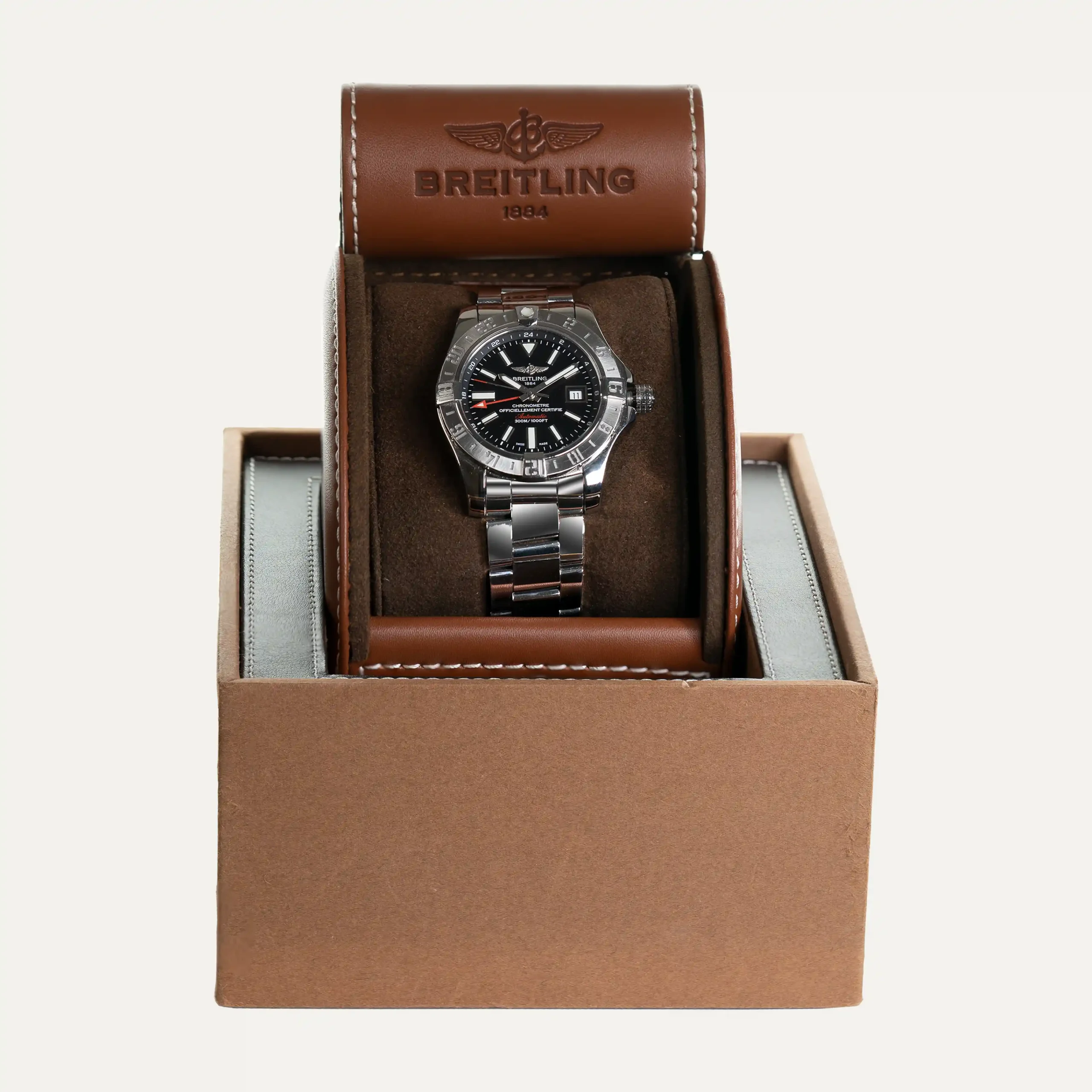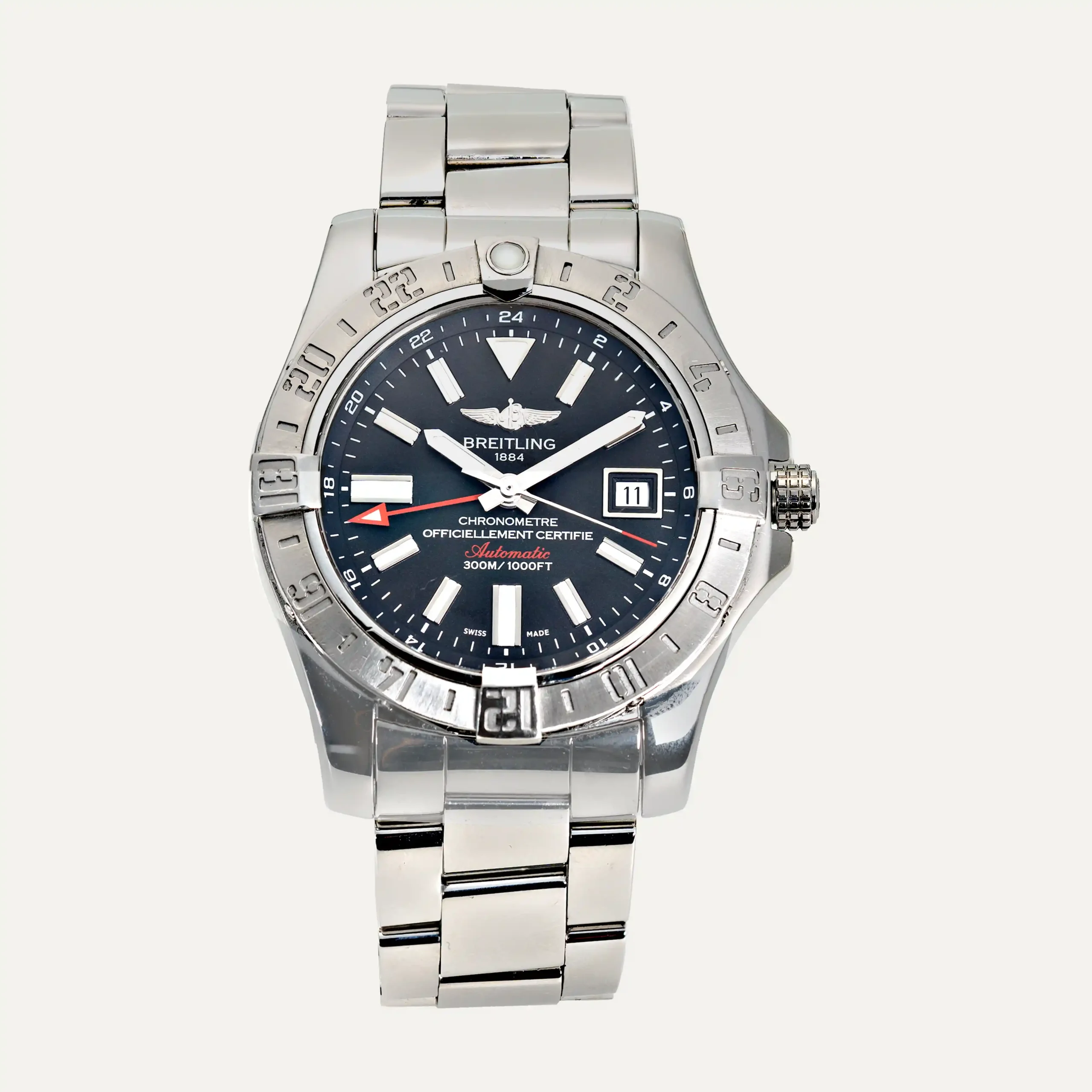 Breitling Avenger II GMT watch, automatic movement, steel case, 43mm diameter and 12mm thick. Black dial with index with date at 3 o’clock, luminescent hour, minute and GMT hands. Screw-down crown with 42-hour power reserve. Bidirectional rotating bezel with a 24-hour graduation used as a 3rd time zone. Sapphire crystal. Double folding steel bracelet. COSC certificate. Breitling box and documents. Includes 1 year in-house warranty.