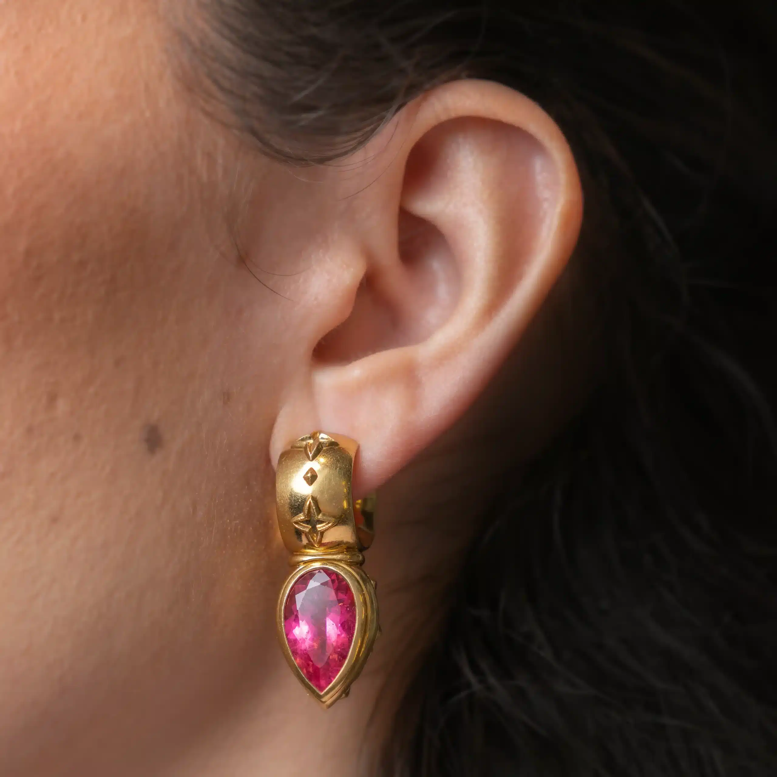 Intense elegance with an artistic touch. These earrings feature a striking structure in 18kt yellow gold – 750‰, enriched by sculptural details that evoke classic high jewelry. Each earring is suspended from a raspberry pink tourmaline, cut into a pear shape to maximize depth, color and luminosity.
