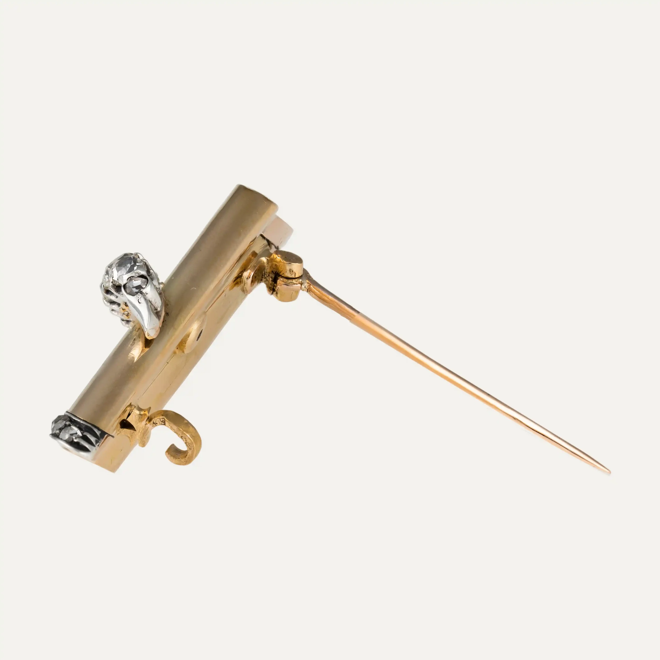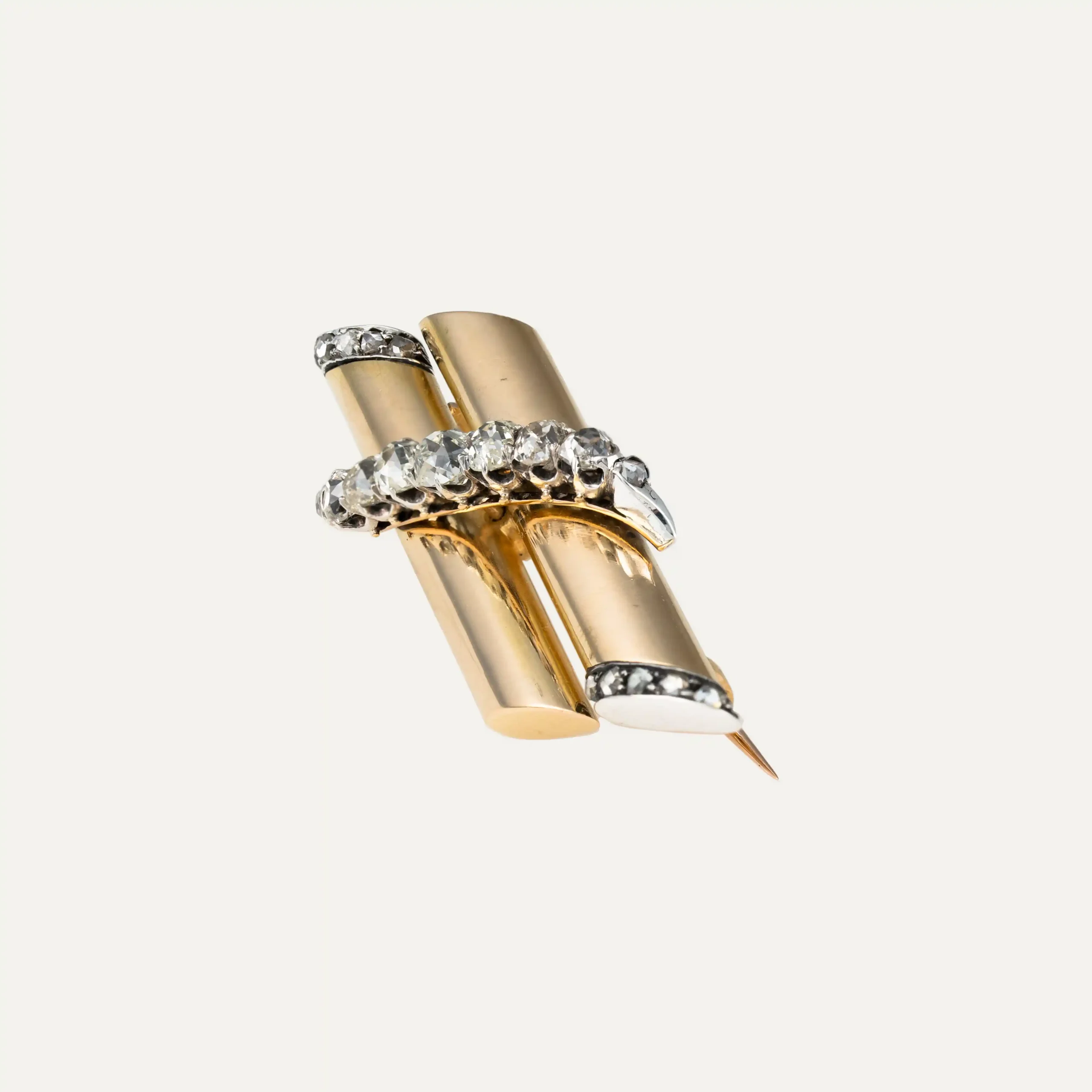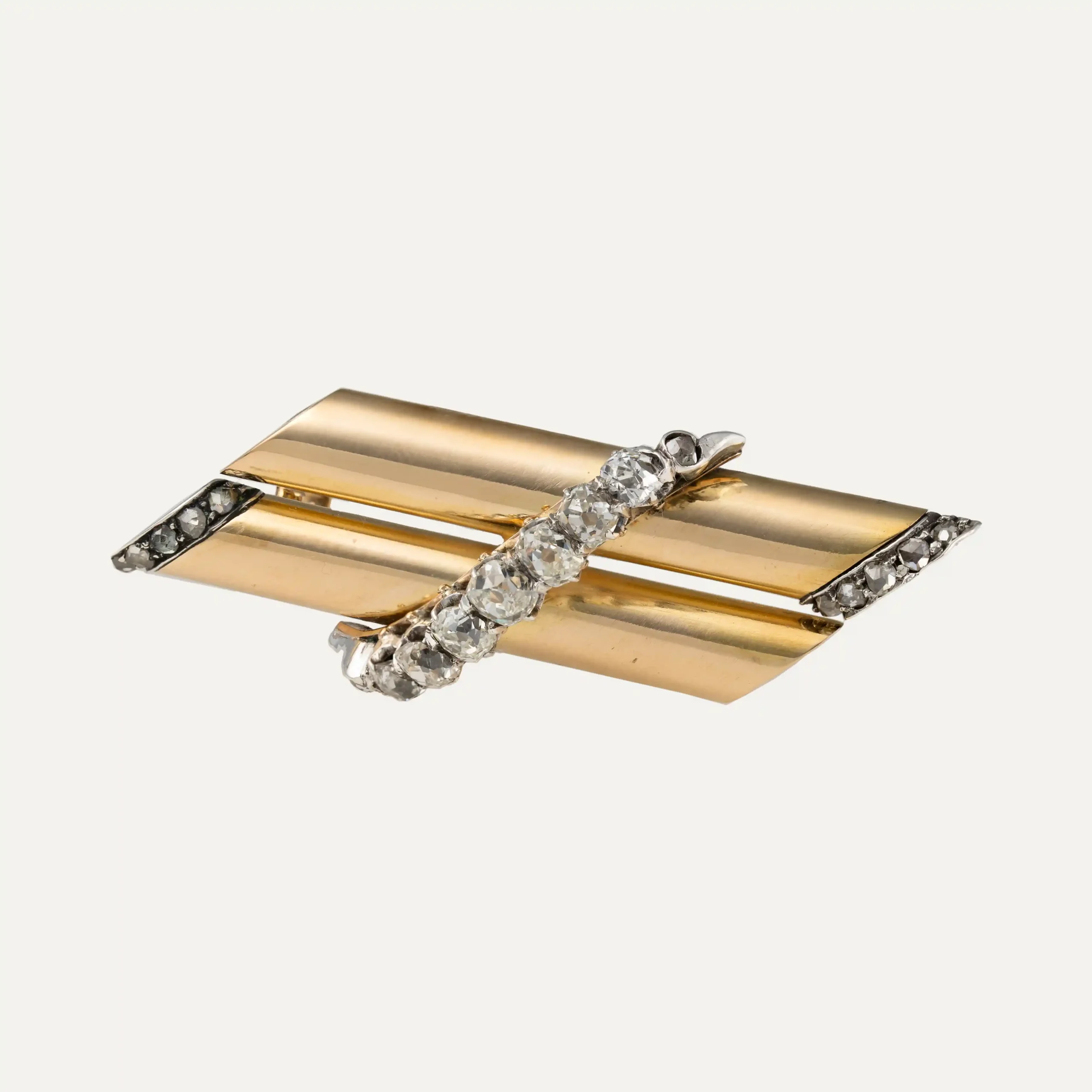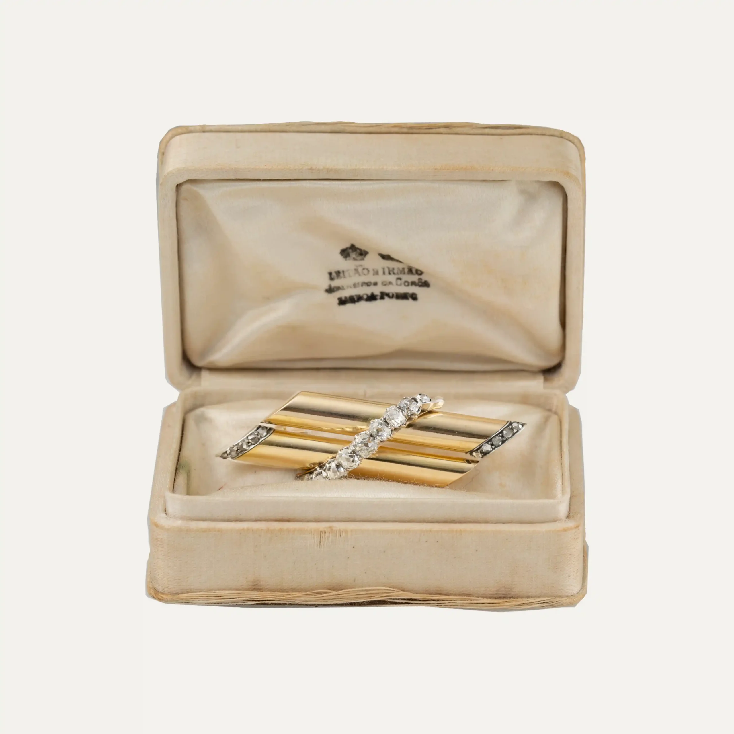 Brooch with two horizontal bars in 19.2 kt – 800 ‰ in yellow gold. In the centre, it has a diagonal silver application set, with 7 old cut diamonds and 2 rose-cut diamonds. Each end has a silver application set with 5 rose-cut diamonds. Portuguese with Lisbon hallmark (1887-1937) and Leitão & Irmão, Lisbon, goldsmith’s mark registered in 1887.