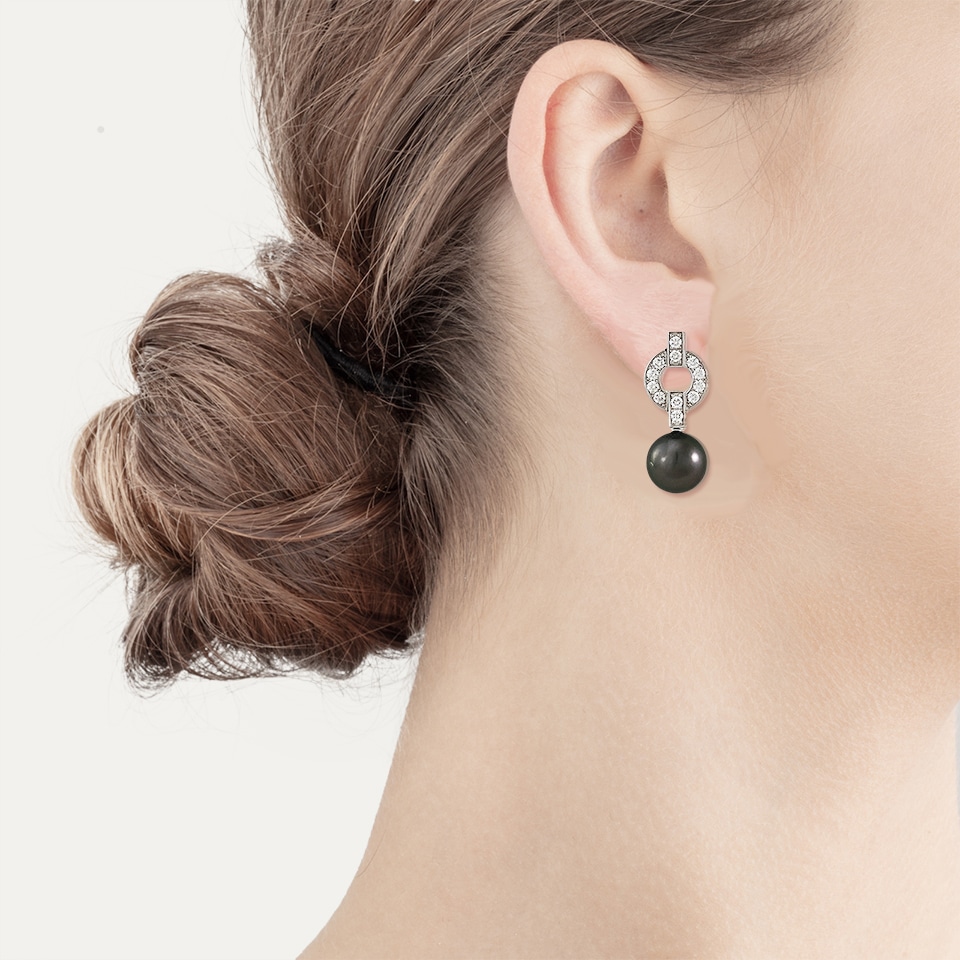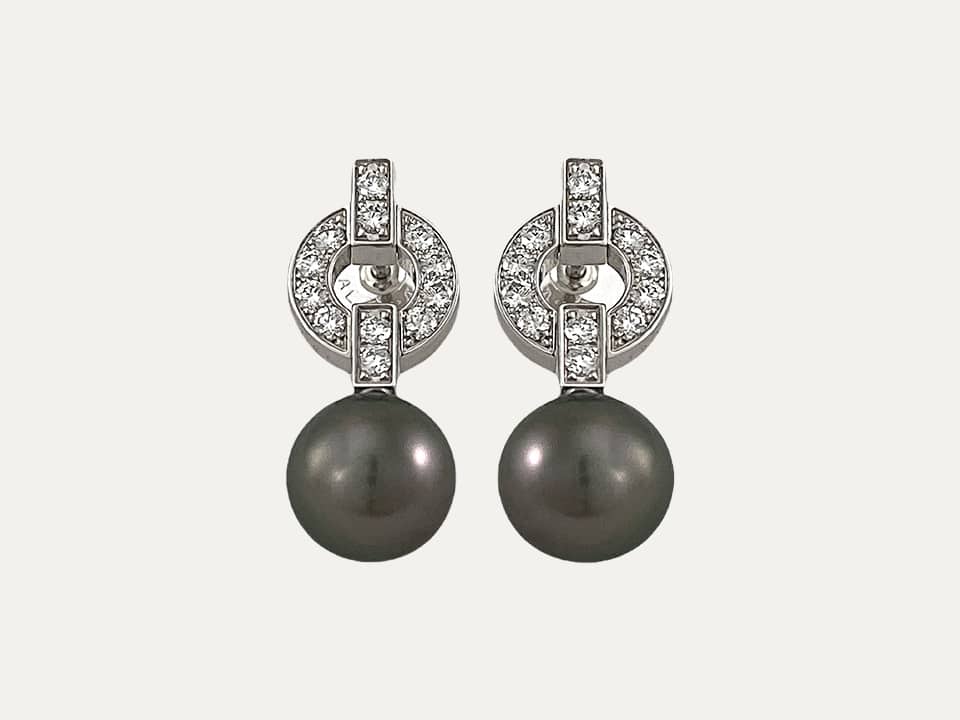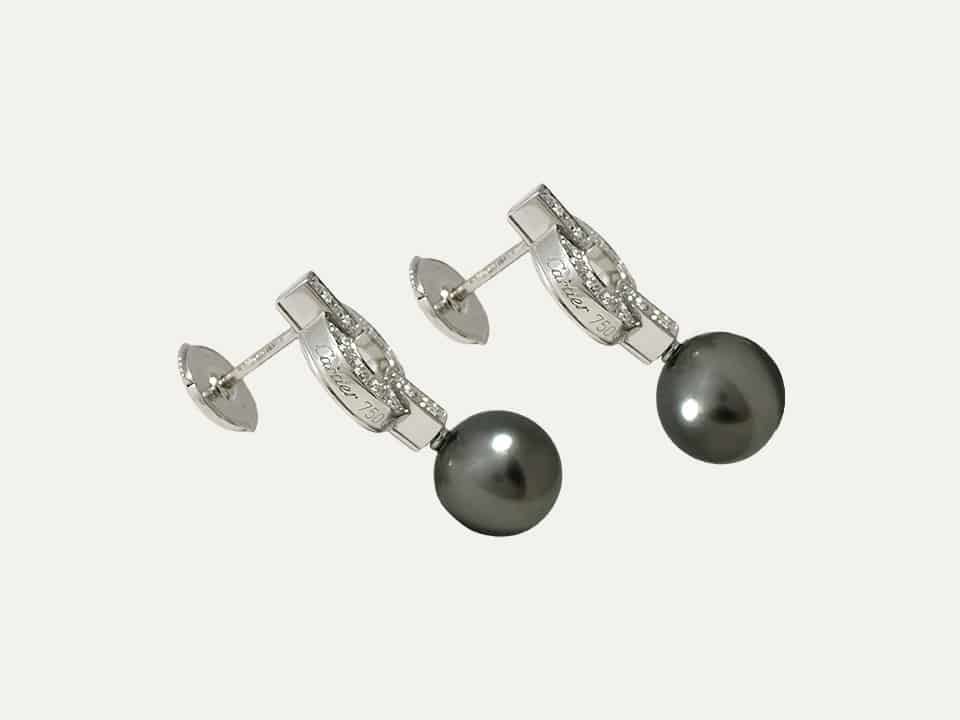 Cartier earrings, Himalia model, in 18 kt – 750 ‰ white gold with 2 round and gray Tahitian pearls and 24 diamonds brilliant cut. Signed Cartier and numbered.