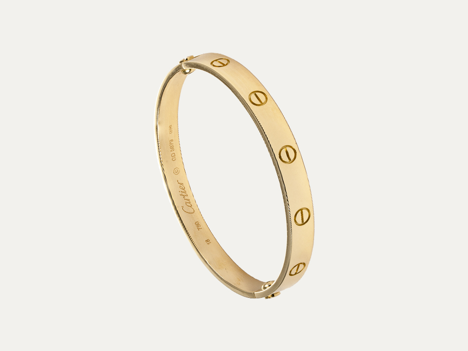 LOVE bracelet by Cartier, in 18kt – 750‰ yellow gold. The LOVE bracelet is an icon of jewellery design: a tight-fitting oval bracelet made up of two rigid arches that you wear on your wrist and remove with a specific screwdriver.