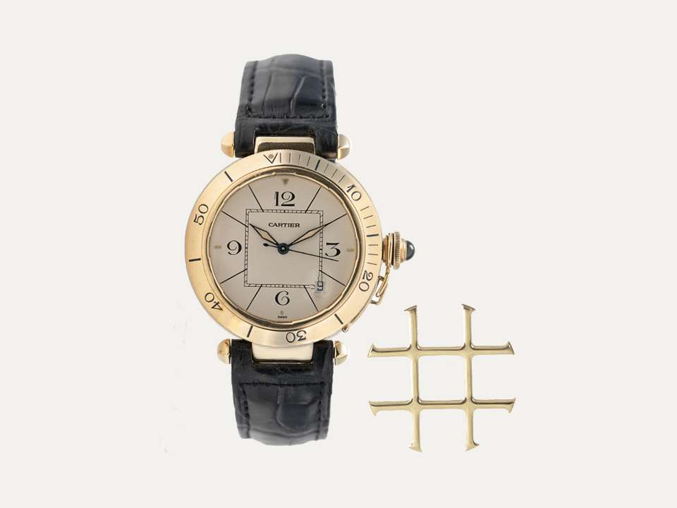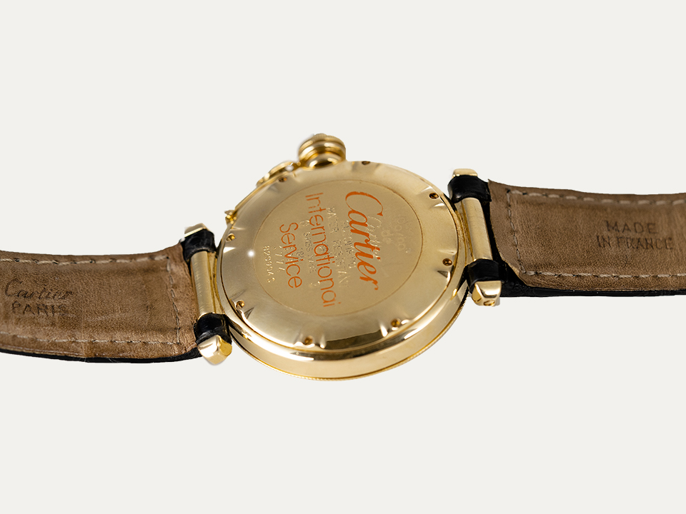 Cartier Pasha wristwatch with 18kt- 750‰ yellow gold with removable grille. Automatic winding movement in yellow gold round case 38mm diameter and a sapphire set in the crown. Scratch-resistant sapphire crystal over a champagne dial with Arabic numerals and diamond-shaped hands. Black crocodile bracelet with 18kt- 750‰ yellow gold buckle. Includes 1 year warranty.