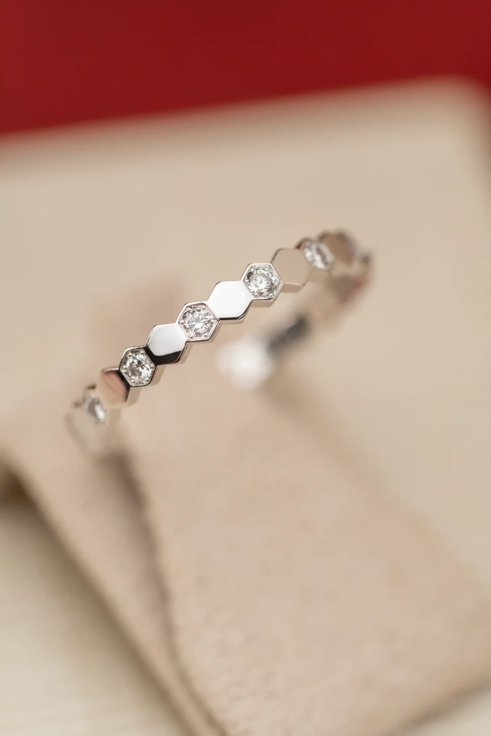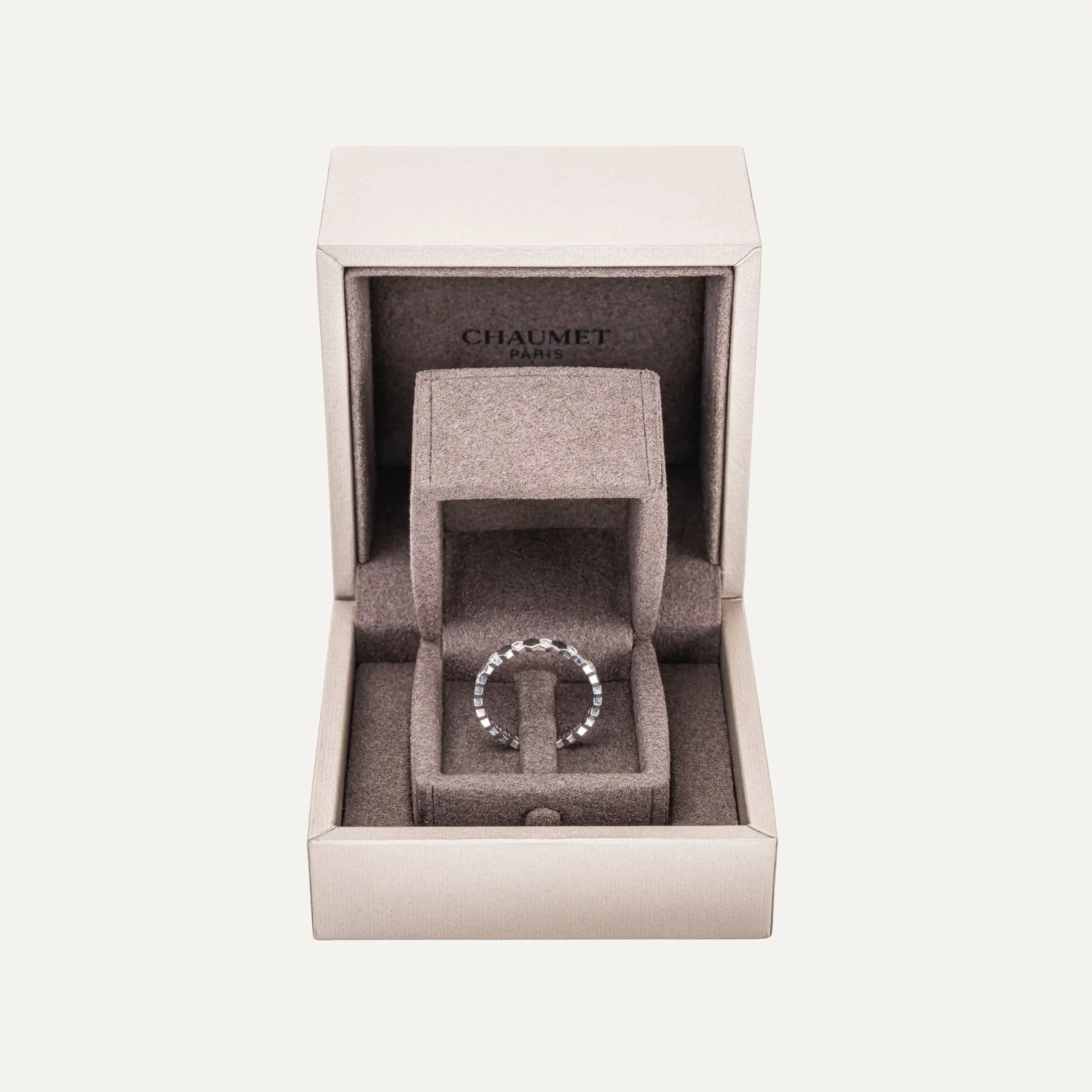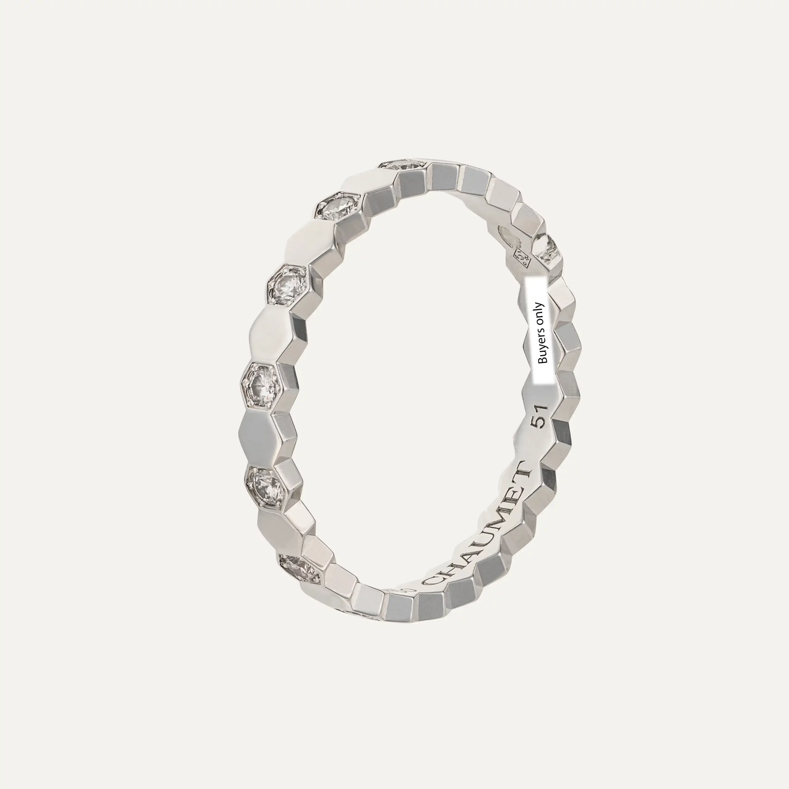 The Chaumet Bee My Love ring with 14 diamonds in white gold is an iconic expression of Parisian jewelry design. Crafted in 18 kt white gold, this Chaumet ring belongs to the celebrated Bee My Love collection, inspired by the honeycomb motif that has become one of the Maison’s contemporary signatures. The geometric structure reflects light from all angles, creating a refined architectural silhouette on the hand.