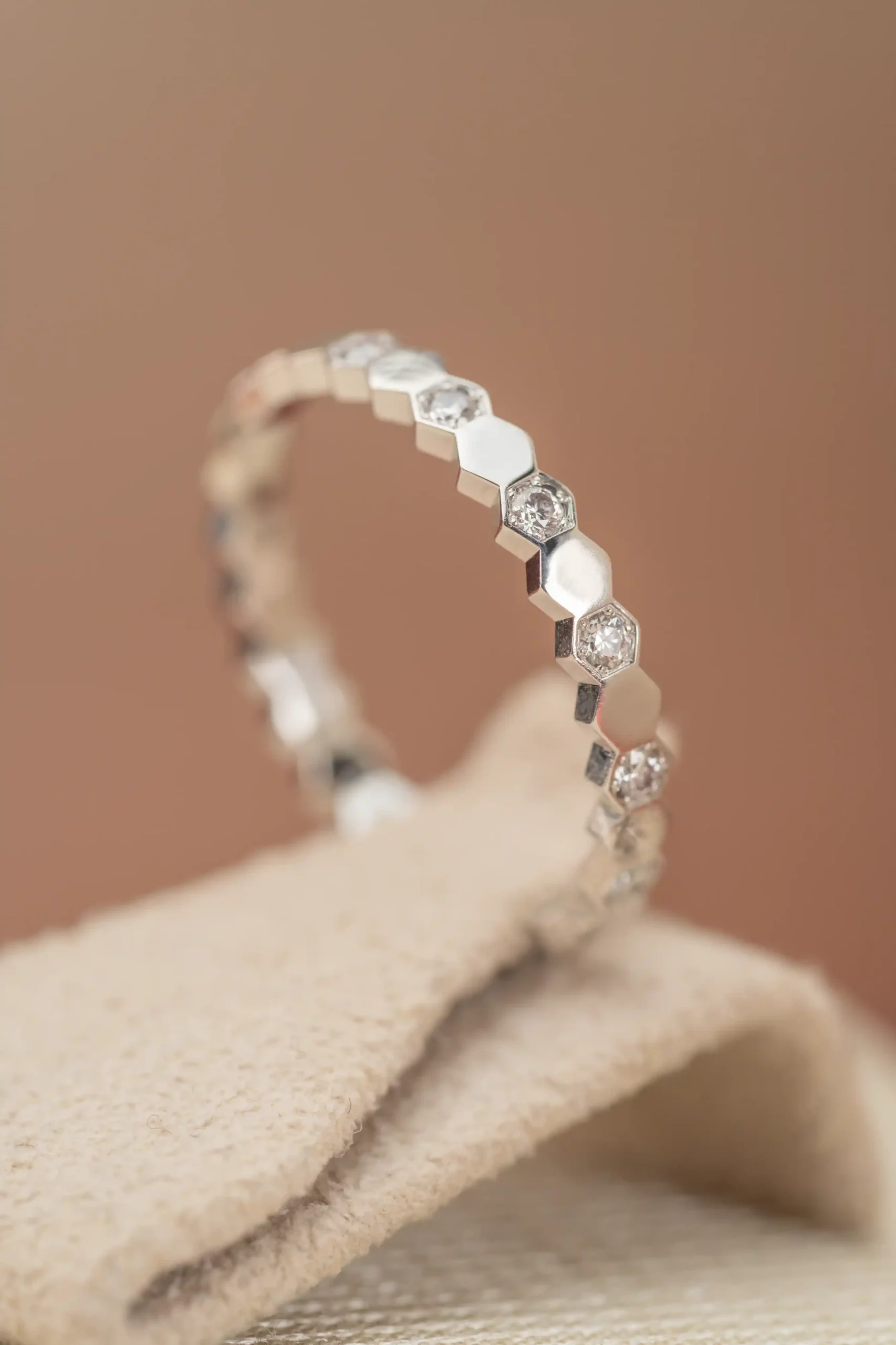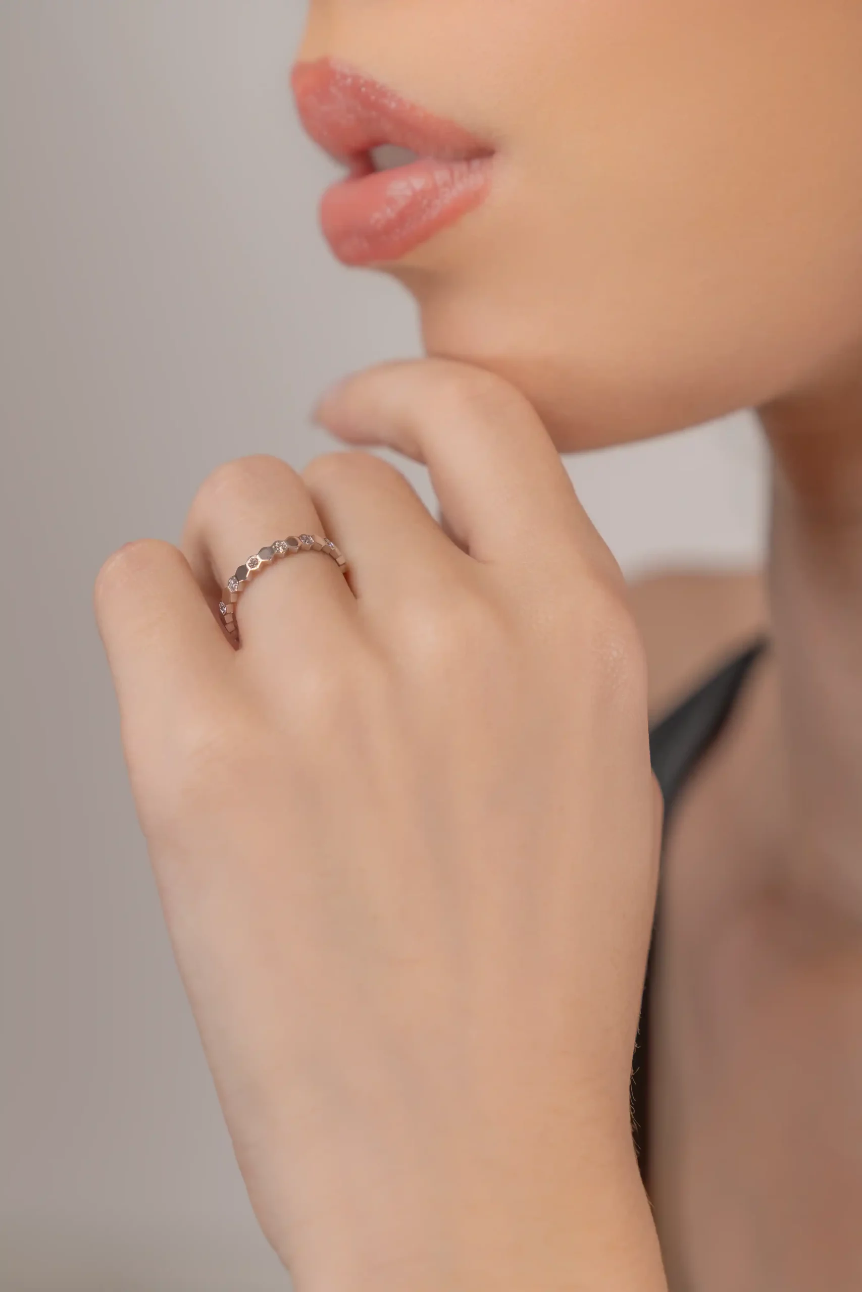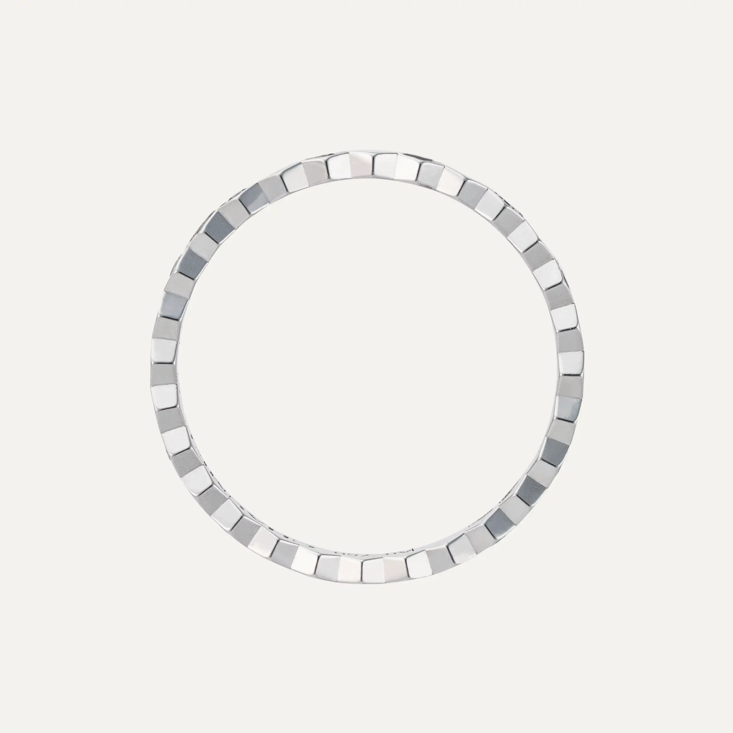 Set with 14 brilliant-cut diamonds, the ring offers a delicate yet luminous sparkle that enhances the clean lines of the white gold setting. The diamonds are carefully positioned within the honeycomb-inspired design, emphasizing both symmetry and brilliance. The contrast between the polished 18kt white gold and the sparkle of the diamonds gives this Bee My Love ring its distinctive presence, with a unisex design making it suitable as a wedding band, for wearing alongside other rings, or a striking luxury piece for everyday wear.