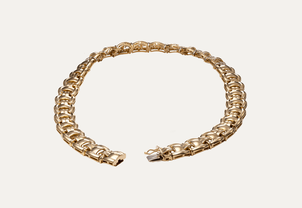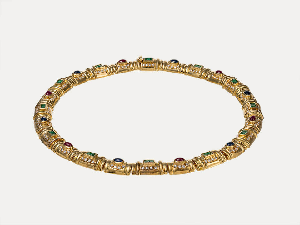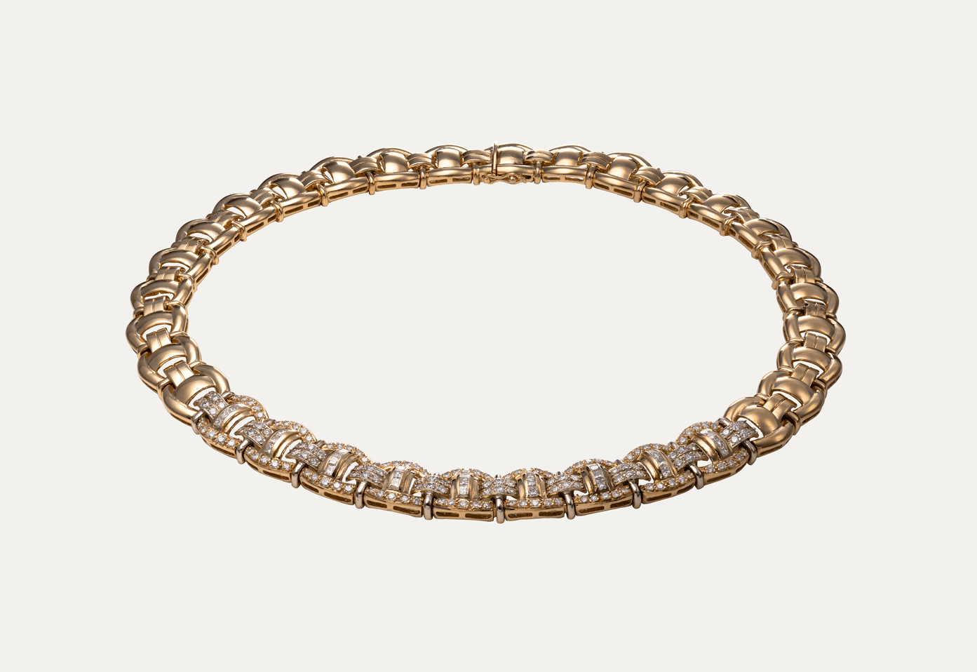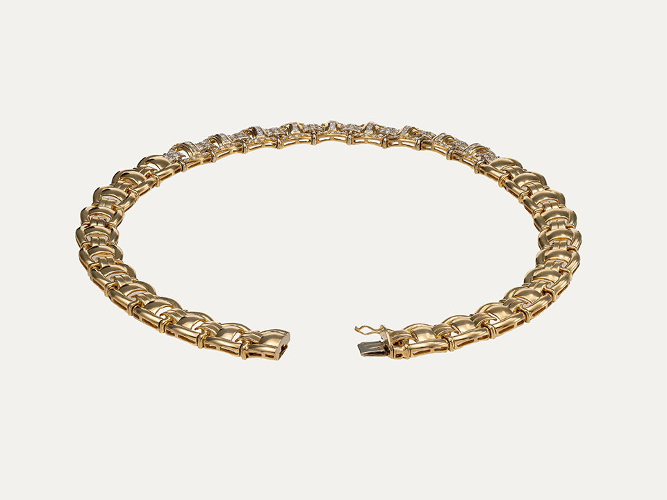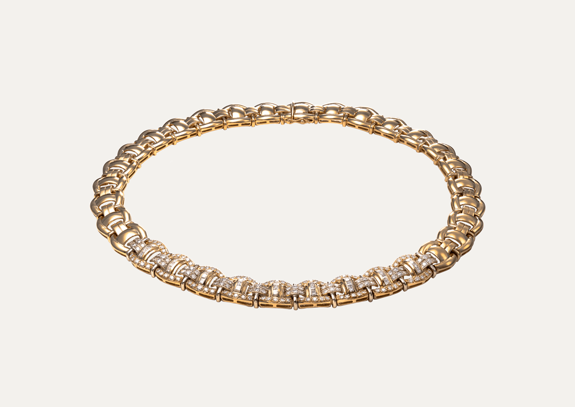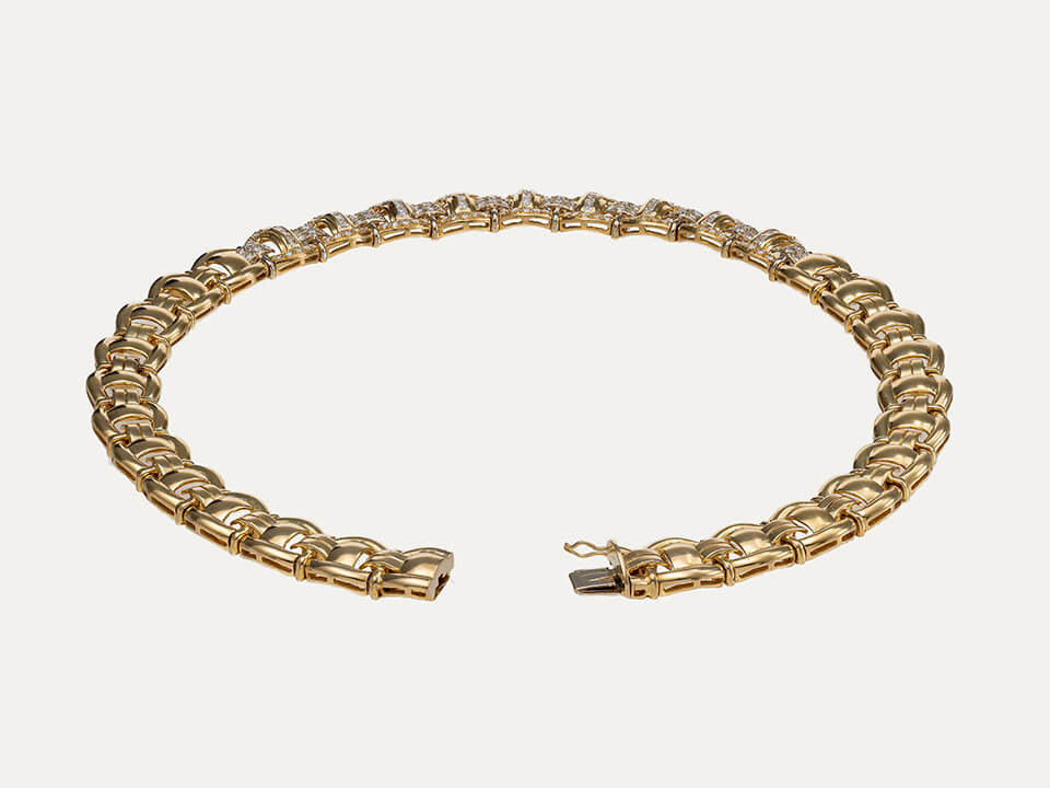 18kt – 750‰ yellow gold choker, set with 186 brilliant cut diamonds about 5.23ct in total. With reed closure and “8” safety.