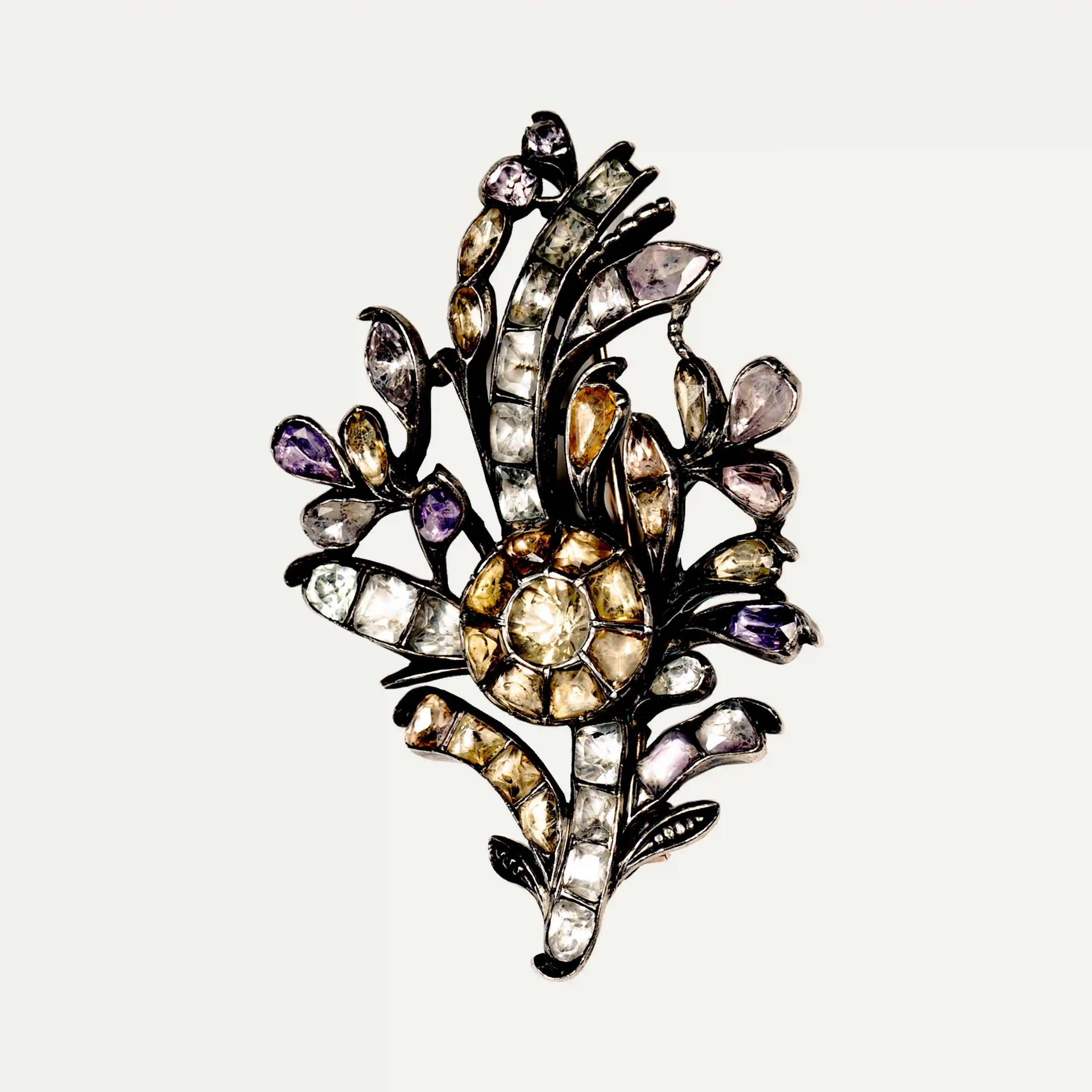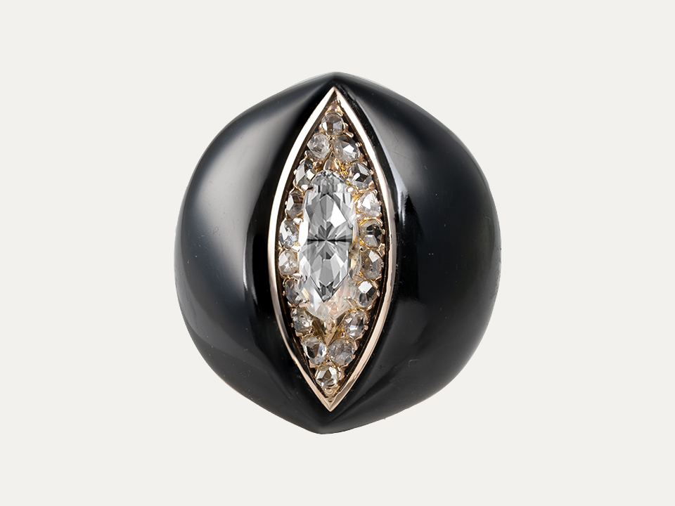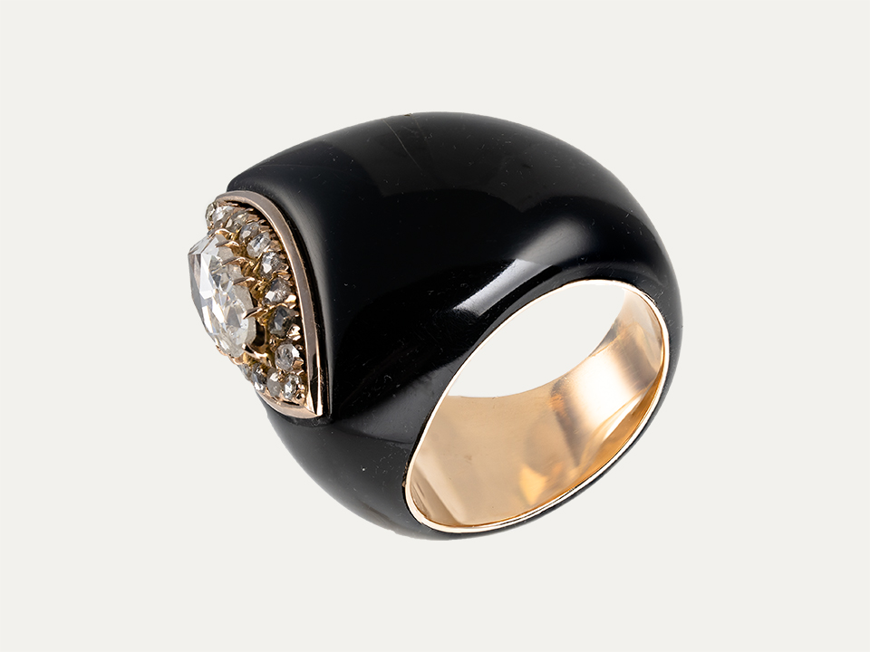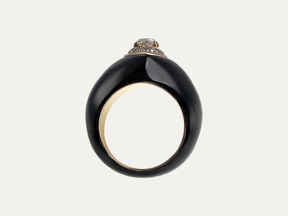 Ebonite and 19.2kt – 800‰ gold ring set with rose cut diamond around 1.50 ct surrounded by 18 diamonds. Not adjustable.