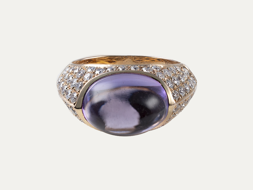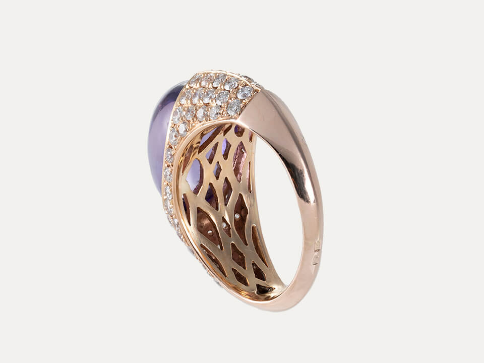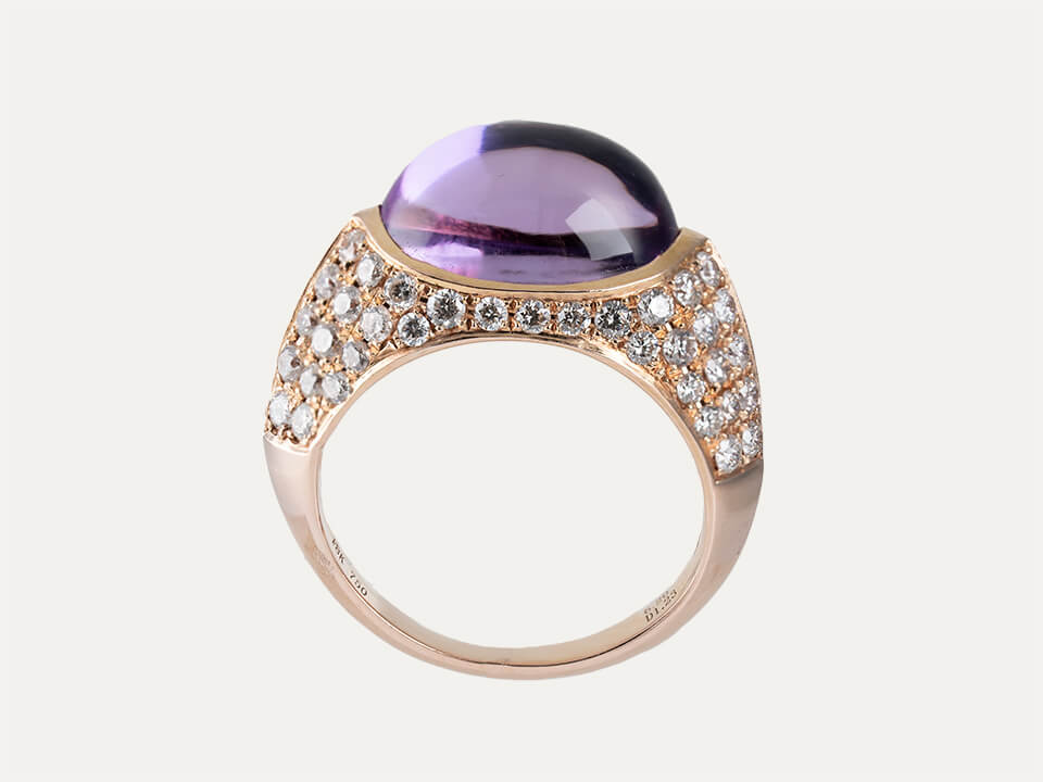 18kt – 750‰ rose gold ring with 1 cabochon amethyst in the center and set with 70 diamonds around
