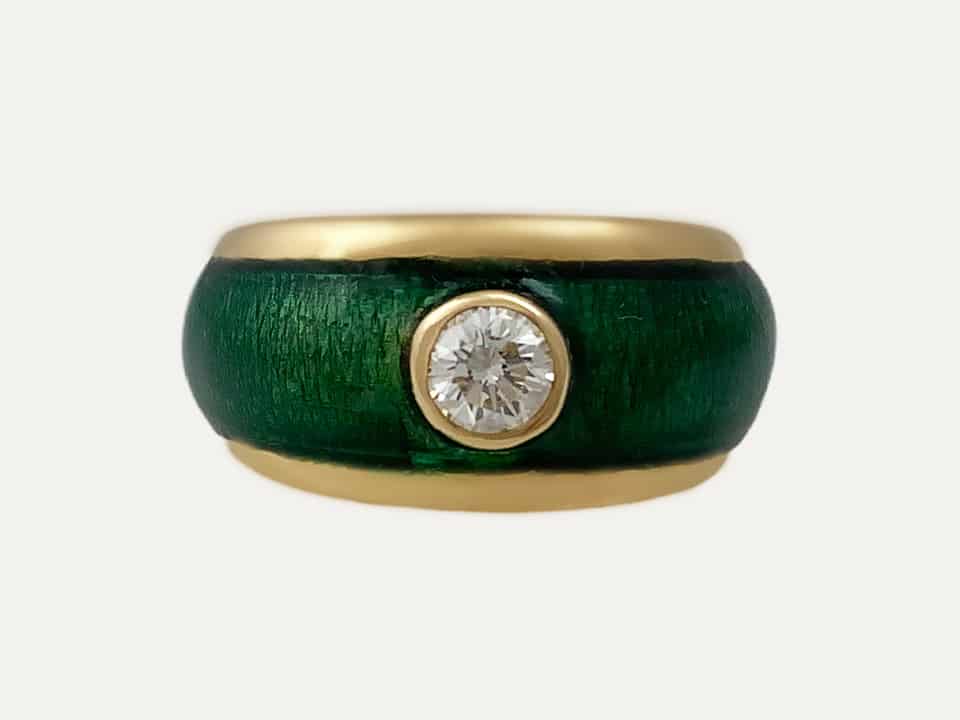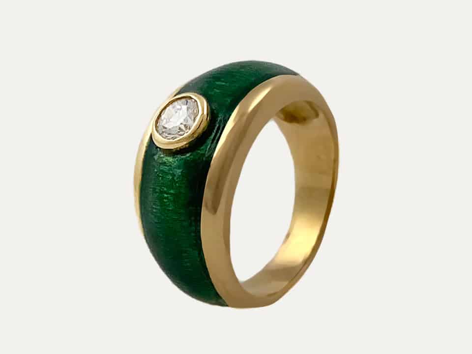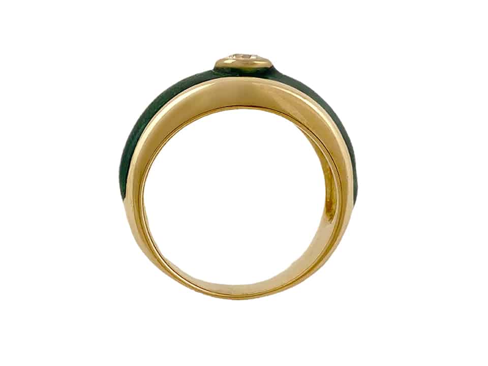 19,2 kt – 800 ‰ yellow gold ring with green enamel and one brilliant cut diamond with 0.25 ct. Size 53, not resizable.