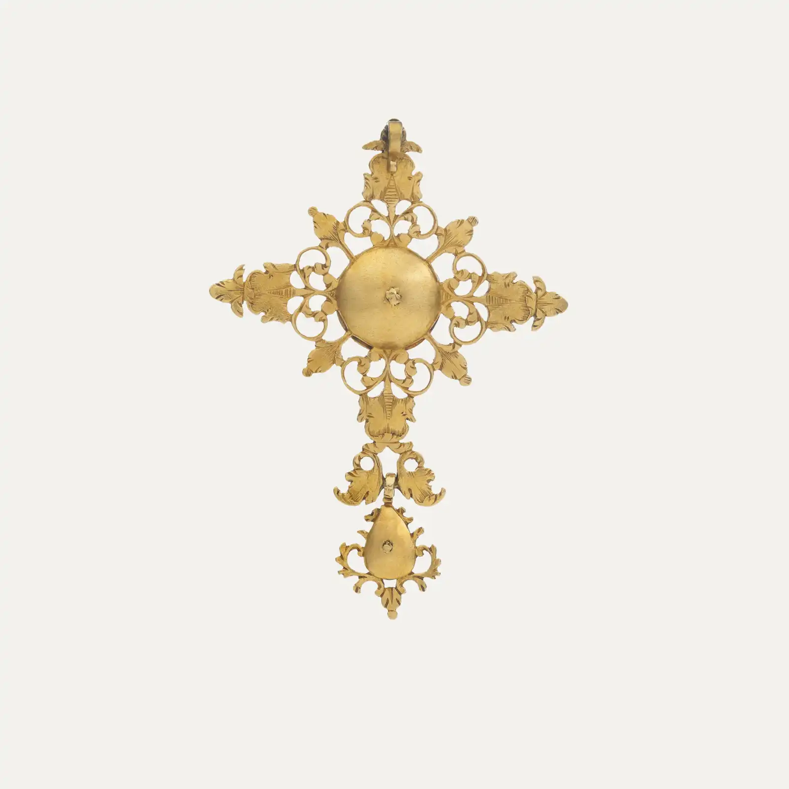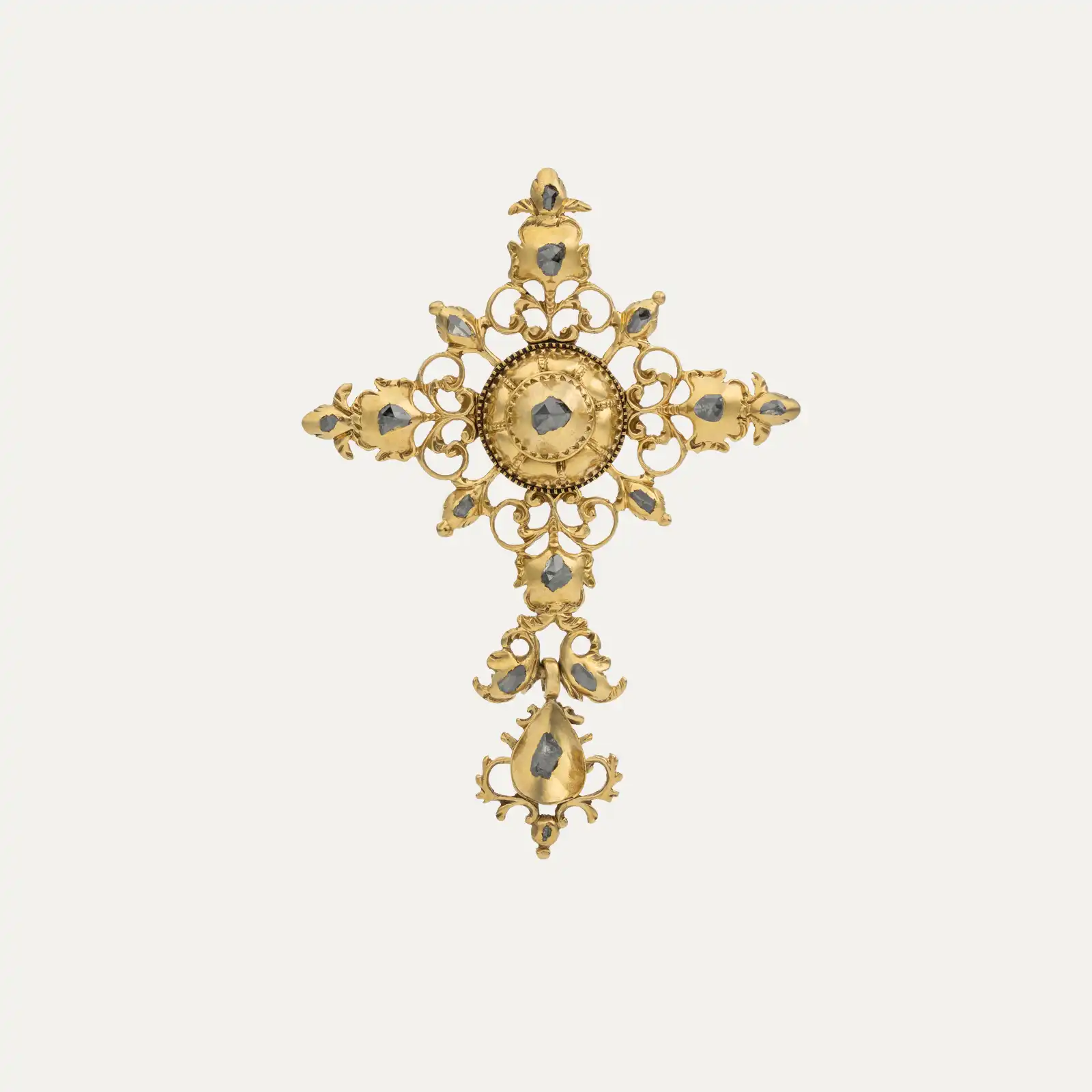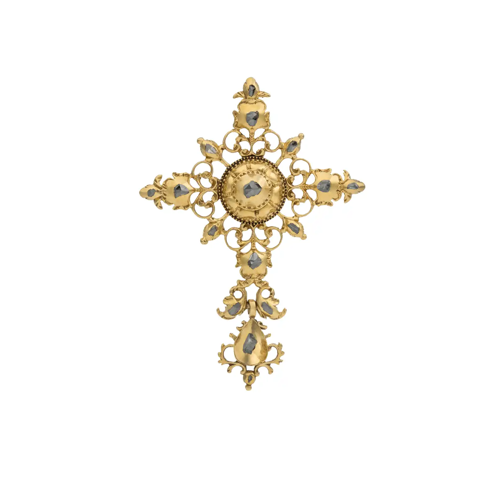 Pendant in yellow gold, crafted in openwork gold and set with 16 rose-cut diamonds. Featuring a central cross and a pear-shaped drop, both detachable elements. Portuguese, 17th/18th century. Unmarked, in accordance with Decree-Law no. 120/2017, of 15 September – Article 2, paragraph 2, point (c).