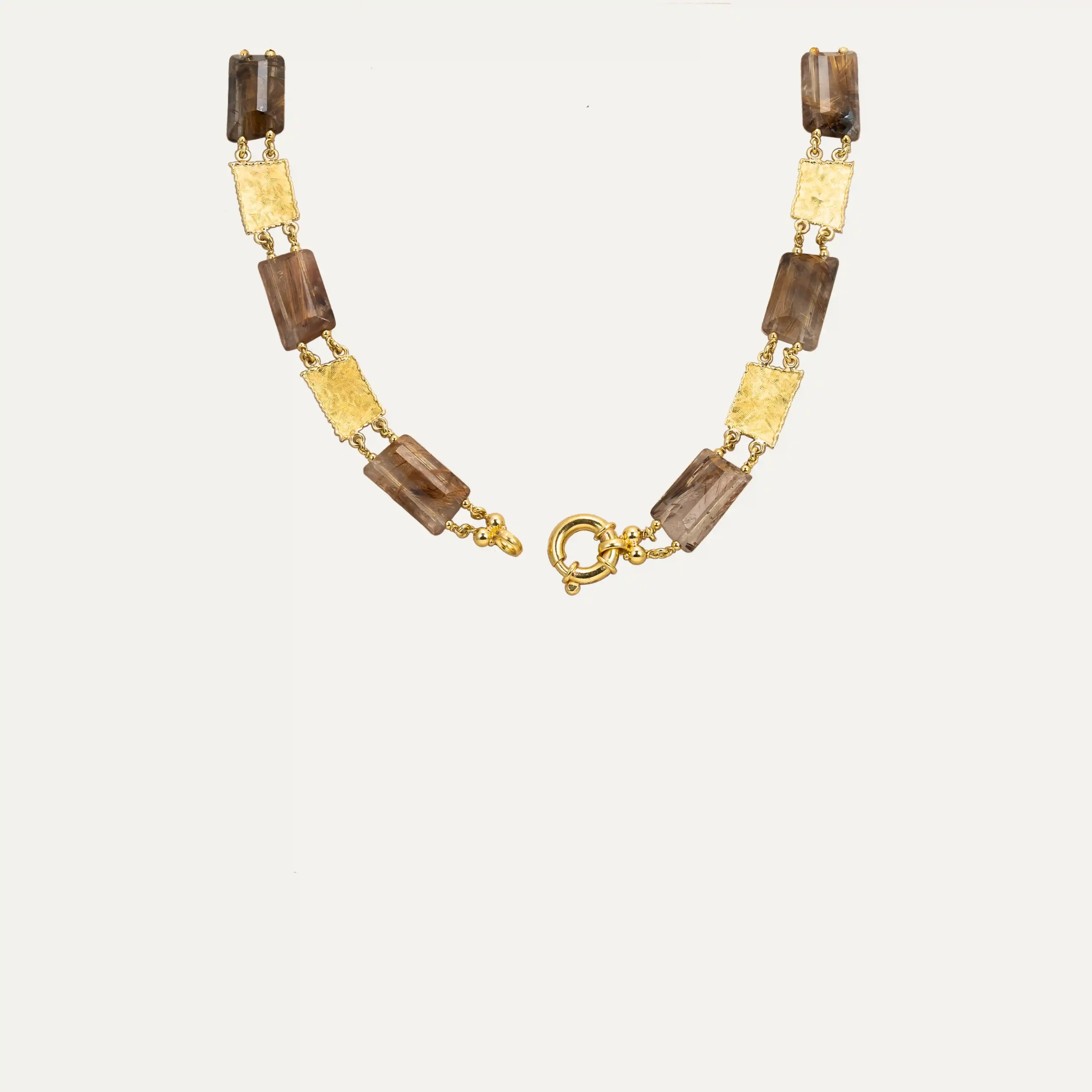 14 kt – 585 ‰ yellow gold necklace, combining the luminosity of gold with the natural elegance of rutilated quartz in a trapezoid shape. The carefully selected stones reveal delicate golden filaments that create unique reflections, emphasised by the simplicity of the yellow gold rectangles. A perfect balance between modernity and timelessness. Clasp with spring ring.