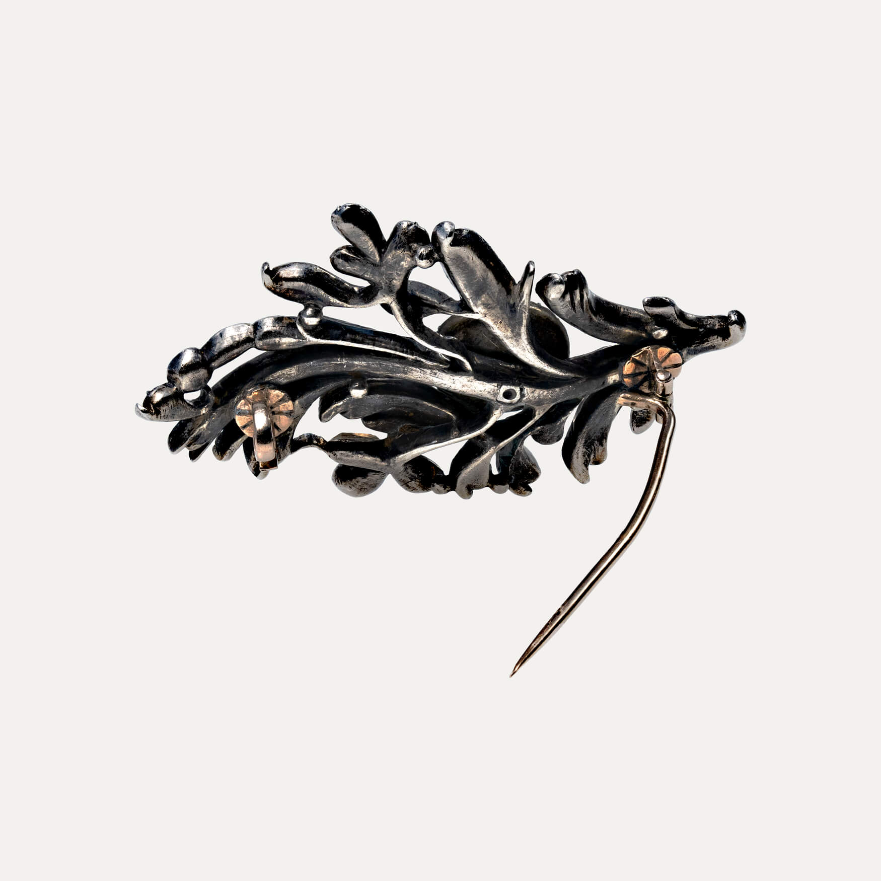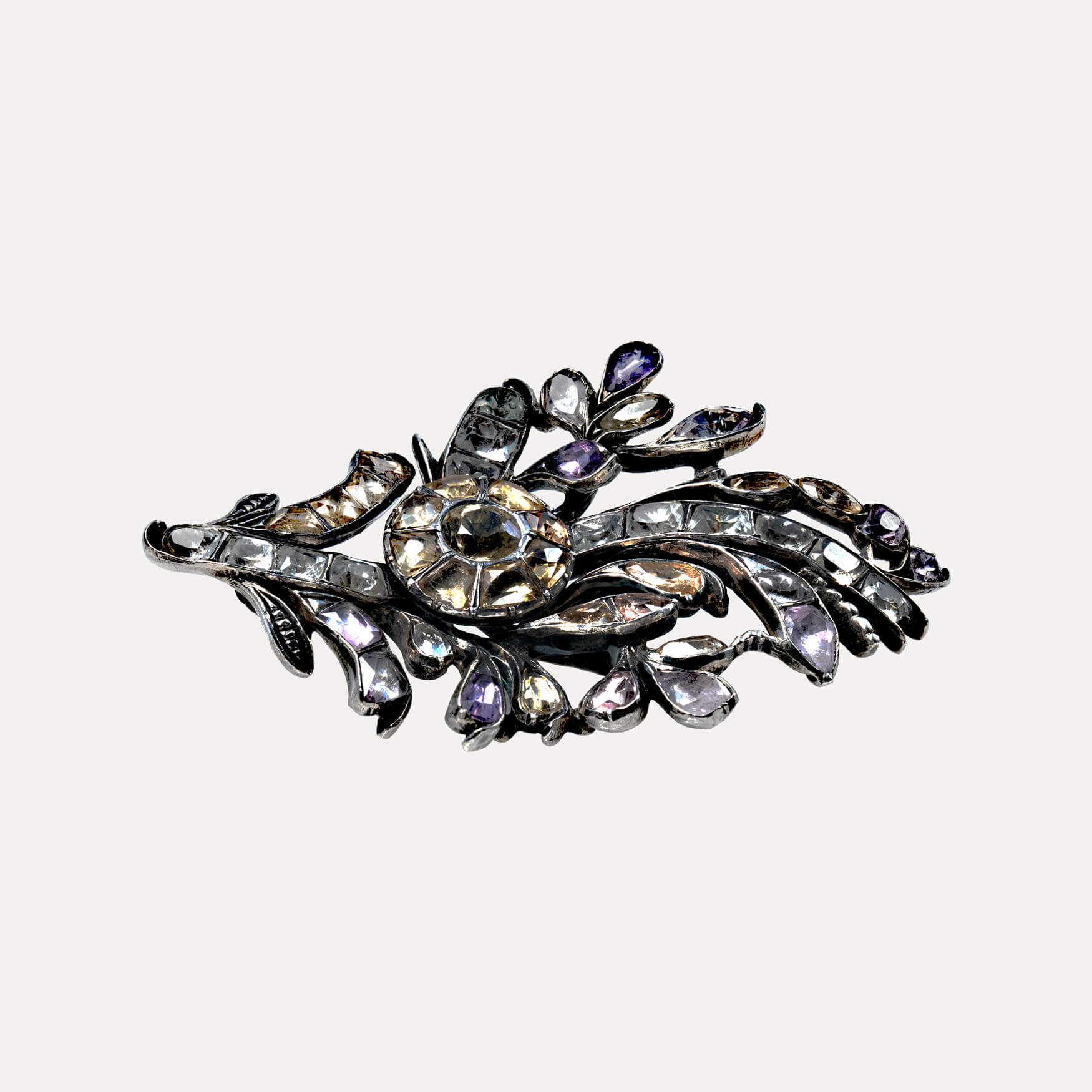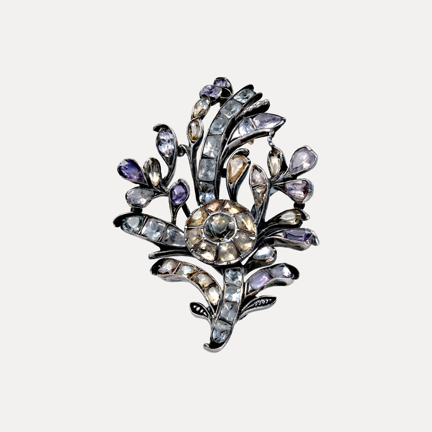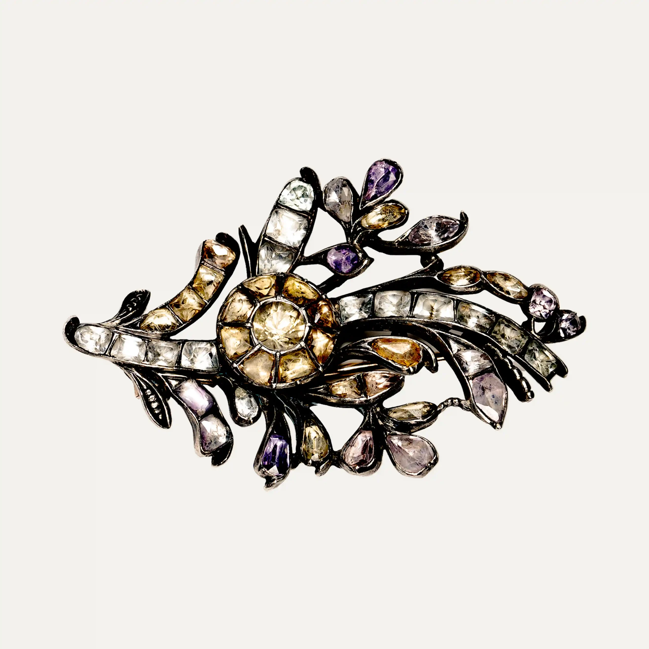 Branch brooch, in gold and silver set with “minas-novas” (quartz), topazes and amethysts, Portuguese 19th/20th century. Defects and restoration. Without hallmark, under Decree-Law n.º 120/2017, art. 2, paragraph 2, item C and art. 3.