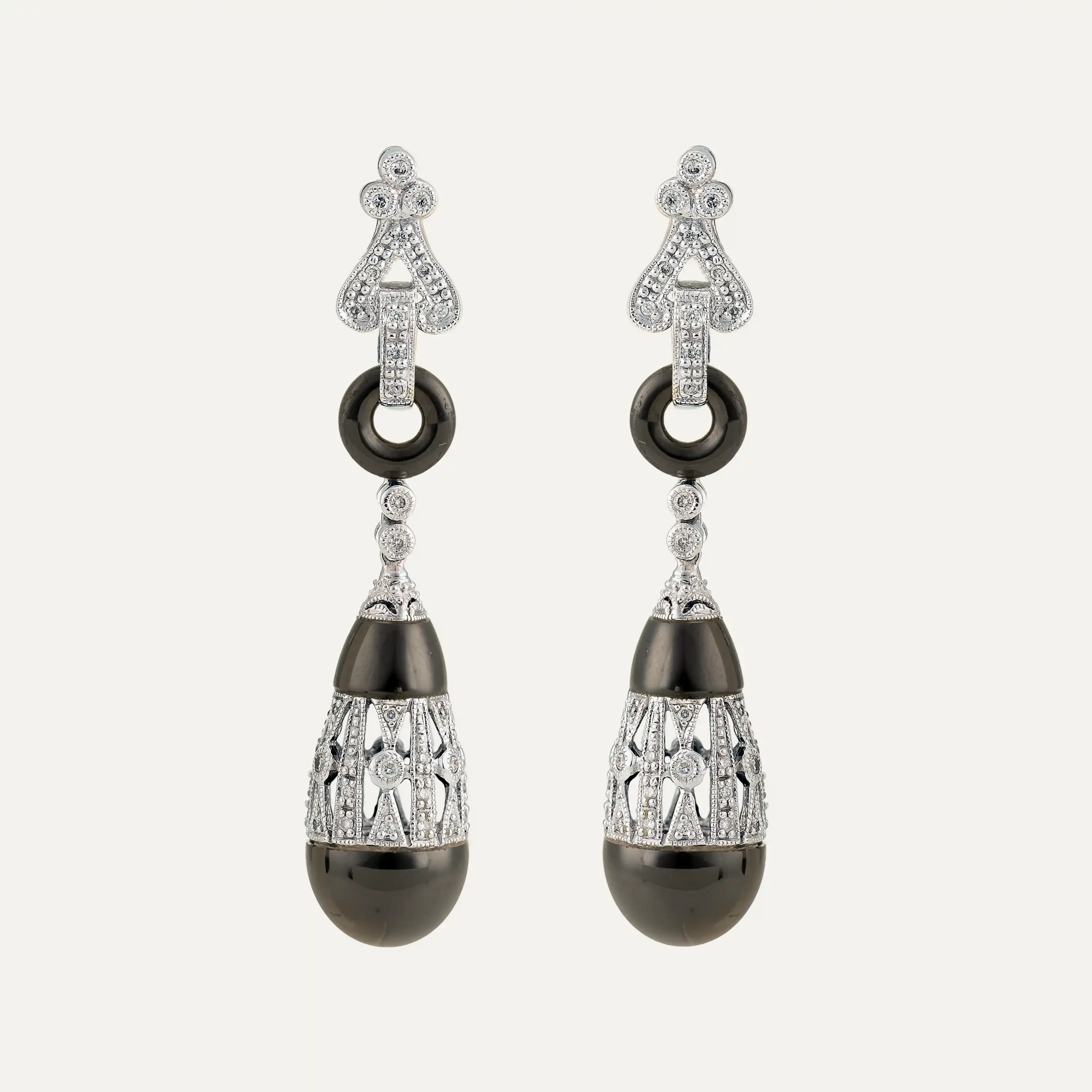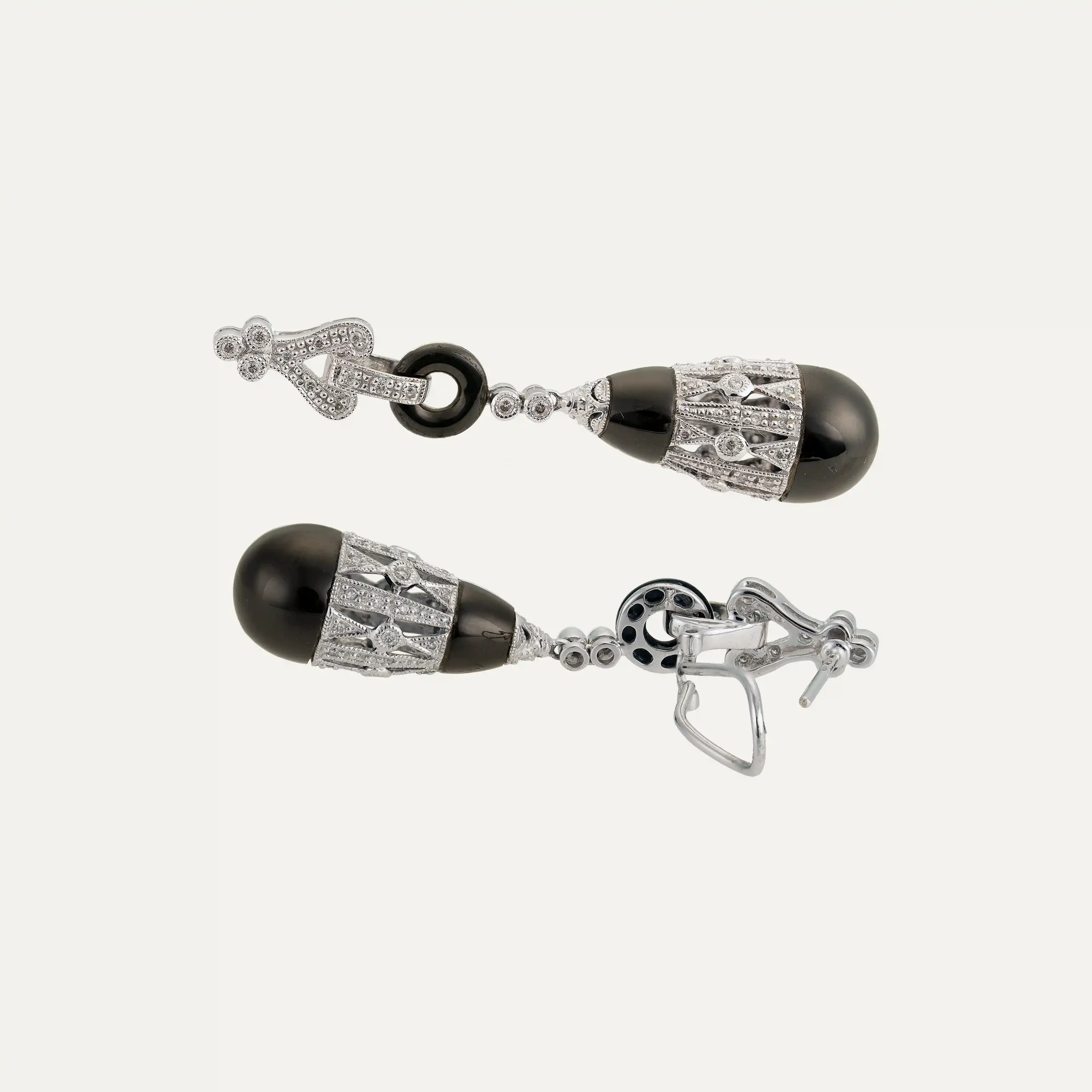 18kt – 750‰ white gold earrings, featuring 2 drop-shaped onyx stones with cabochon cut, adorned with white gold details, 98 brilliant-cut diamonds, pavé-set, totalling approximately 0.392ct. Omega spring system with post.