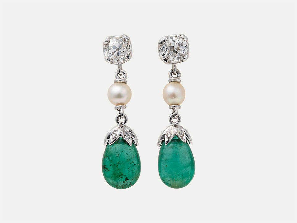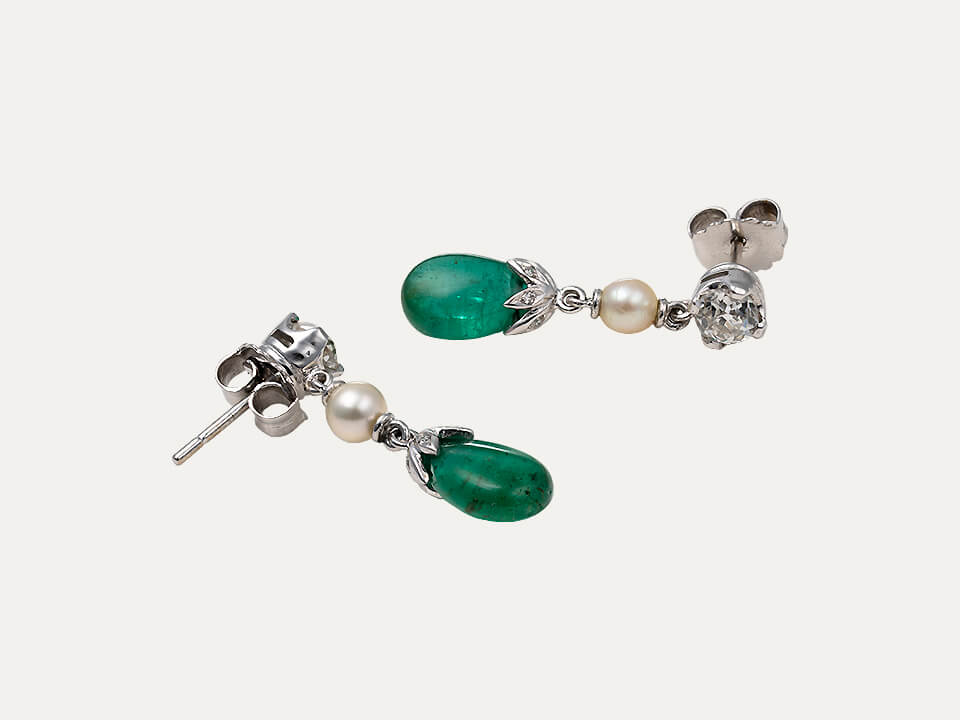 White gold and silver earrings, with 14 diamonds, 2 pearls and 2 emeralds in a drop cabochon shape. Butterfly spring system with spikes. Without hallmark, under Decree-Law n.º 120/2017, art. 2, paragraph 2, item C and art. 3.