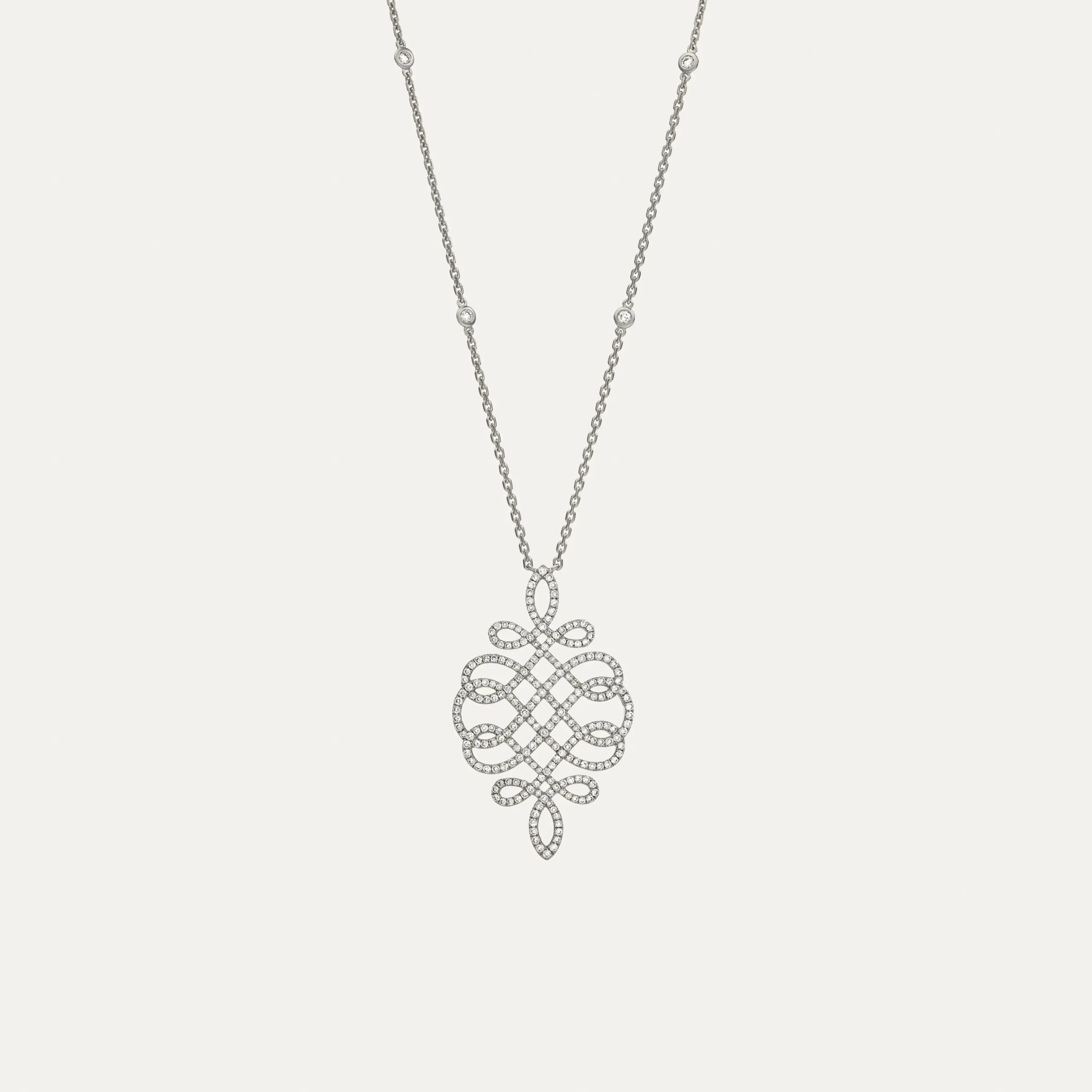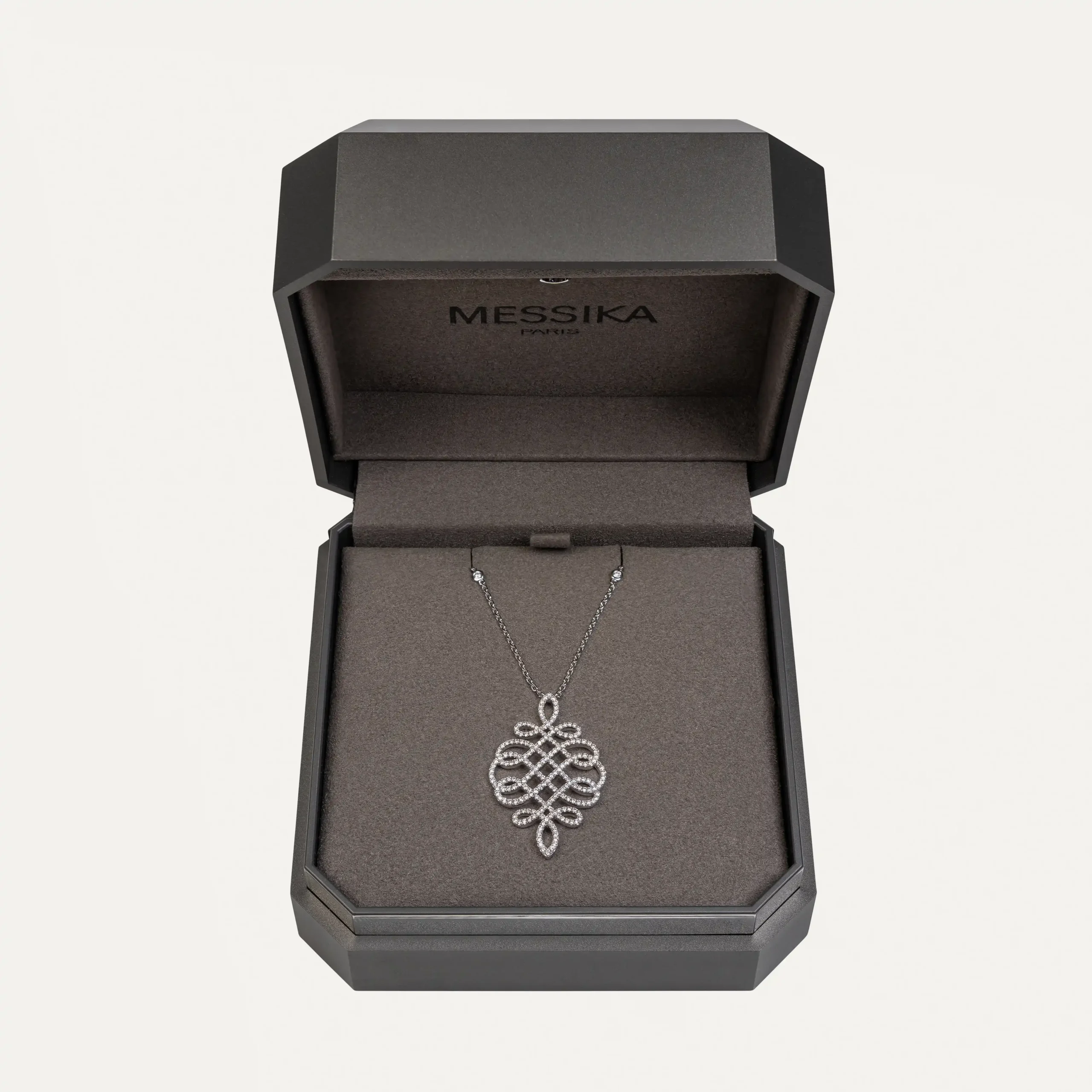 18 kt – 750 ‰ white gold Messika necklace, Promise model, with a wave design pendant set entirely with brilliant-cut diamonds. The chain is set with four brilliant-cut diamonds. With a small plate set with a brilliant-cut diamond, signed Messika Paris, with an inscription D0.95 and marked with Portuguese hallmarks post-2021. With original box. France, early 21st century.