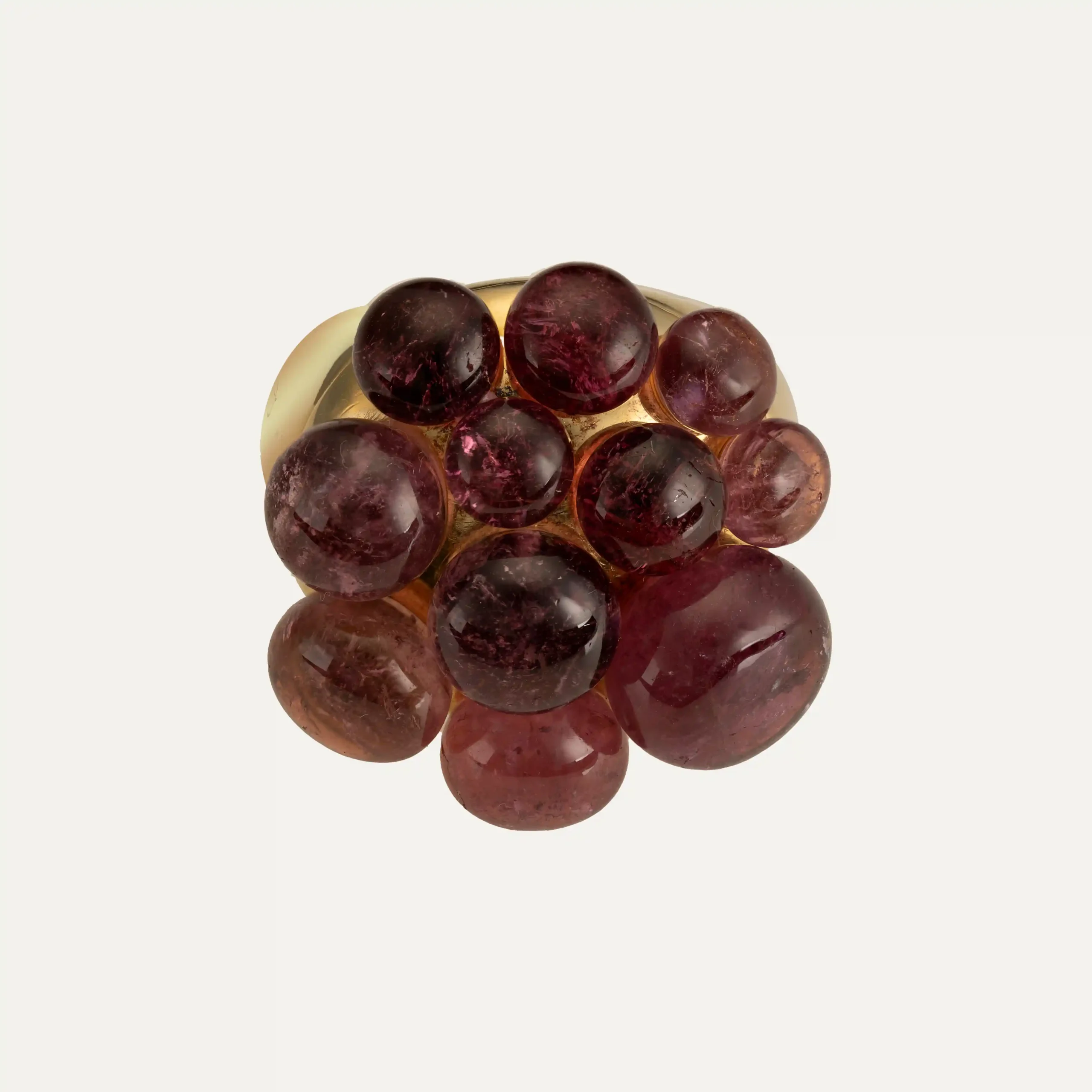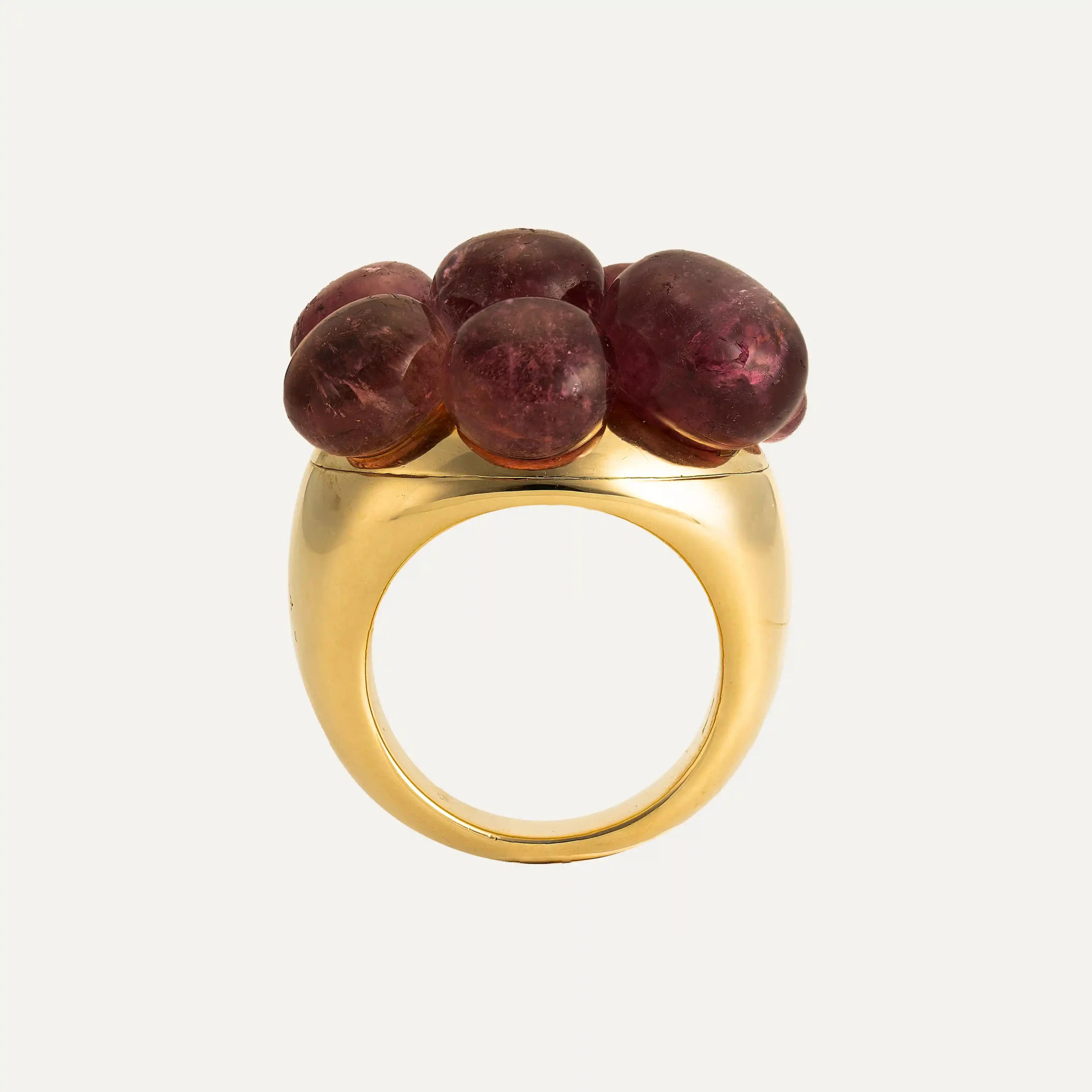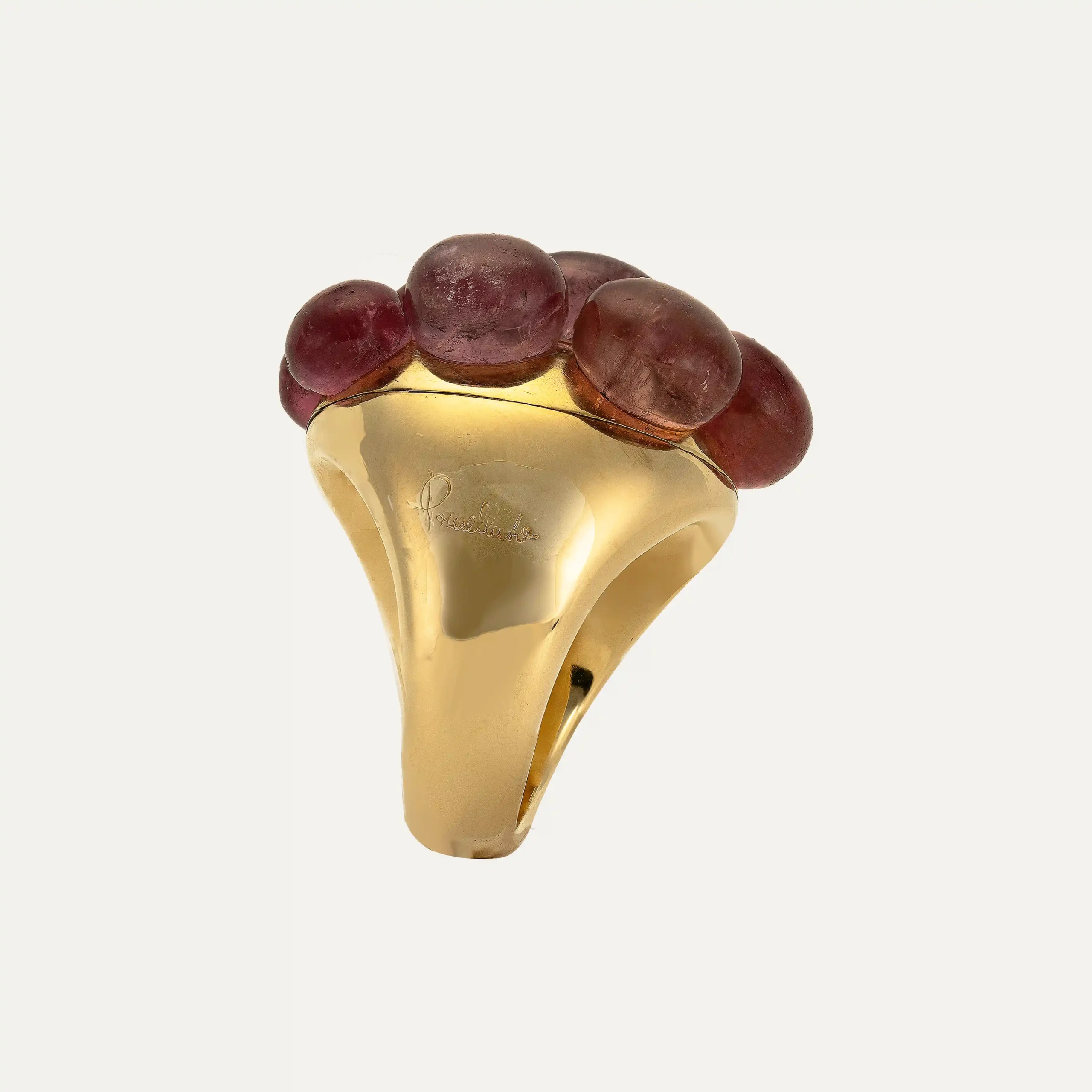 Pomellato ring in 18kt – 750‰ yellow gold, from the Mora collection. Dome-shaped ring featuring 11 round purple tourmaline cabochons. Comes with the original box.