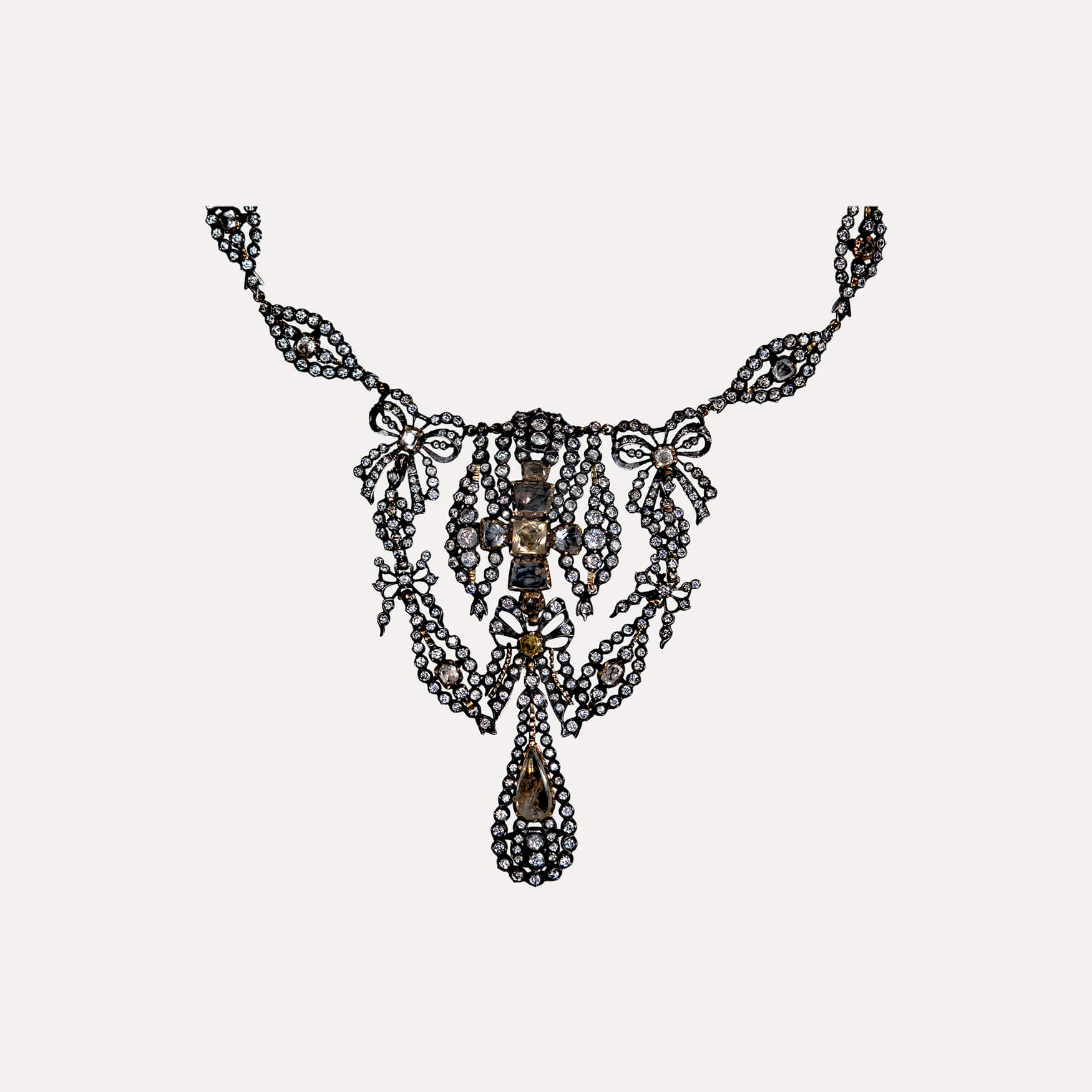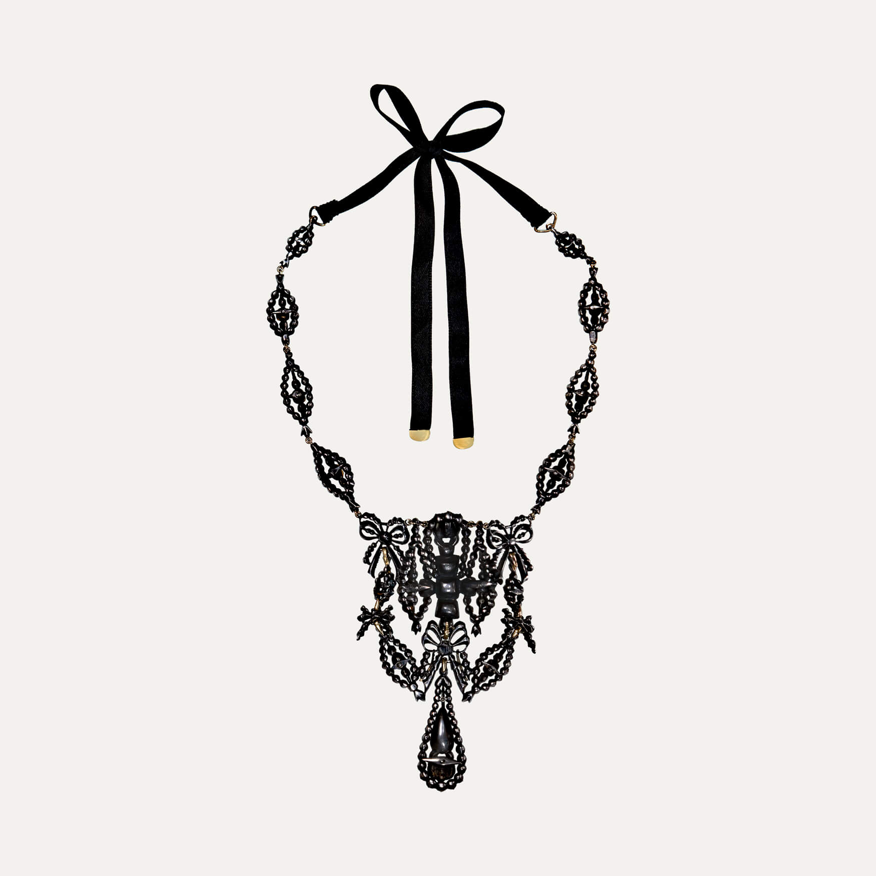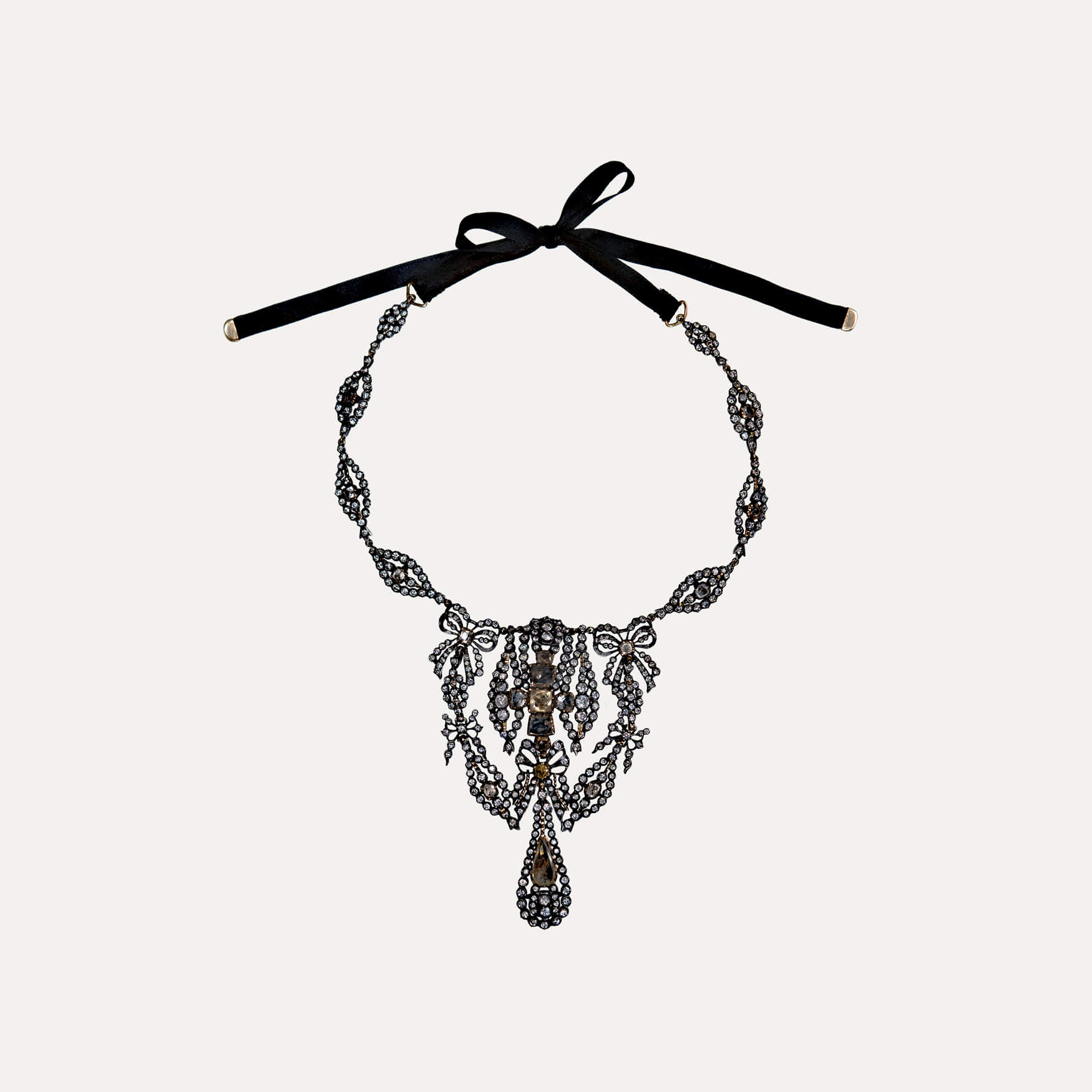 Gold and silver necklace set with quartz, citrines and strass. Cross flanked by lacings with drop pendant and satin ribbon with gold terminals. Necklace length 31.5cm, total length with satin ribbon 80.5cm. Restorations. Portuguese, Without hallmark, under Decree-Law n.º 120/2017, art. 2, paragraph 2, item C and art. 3.