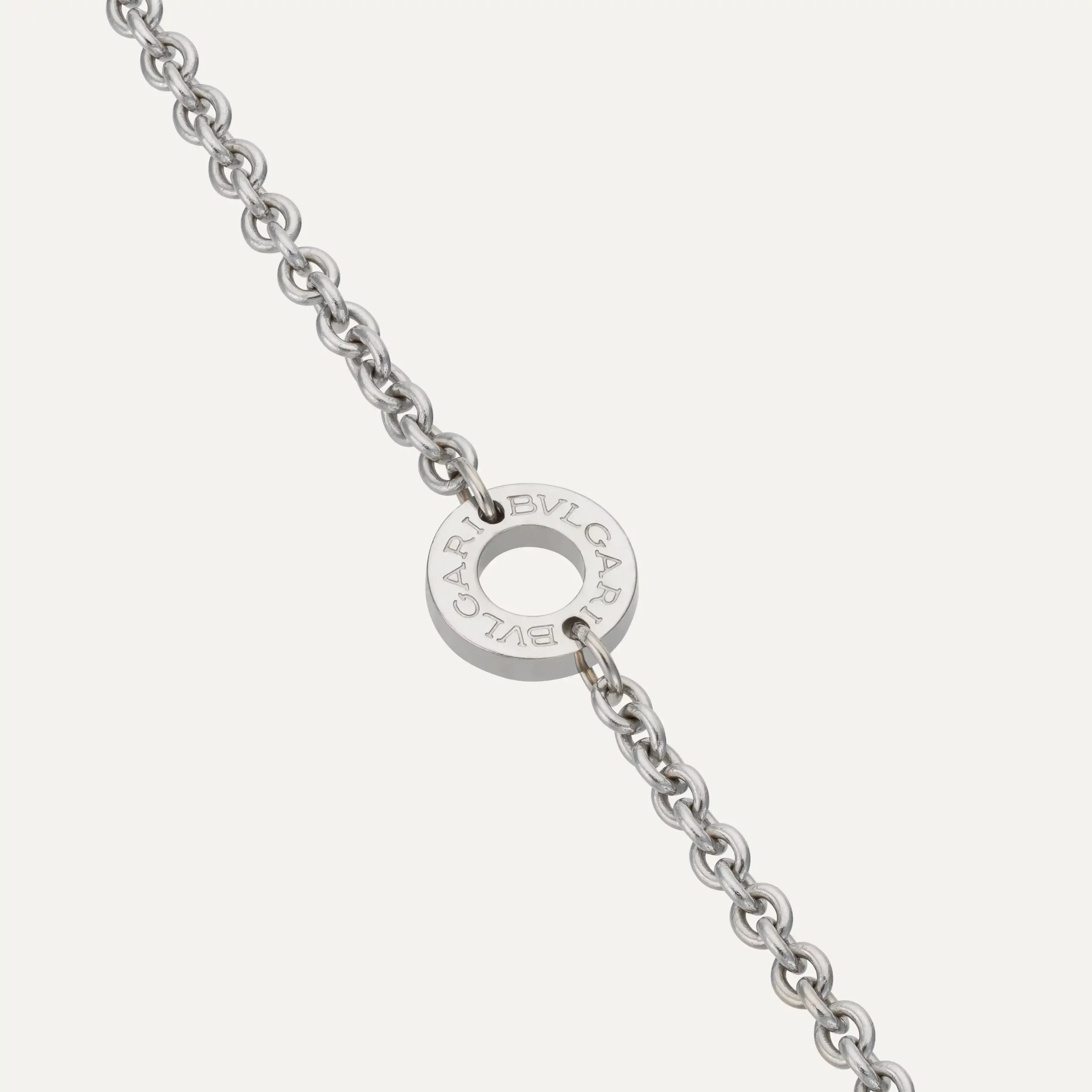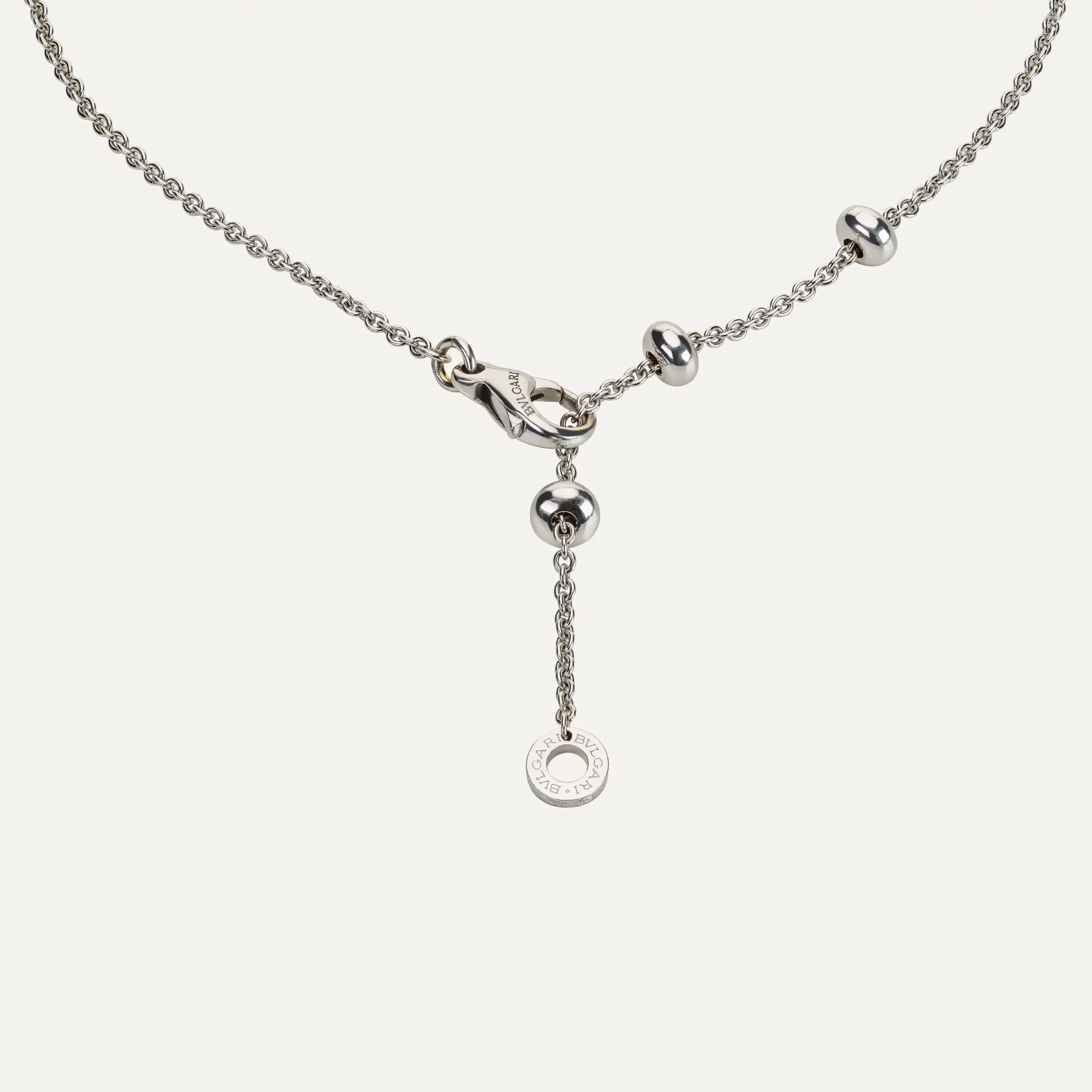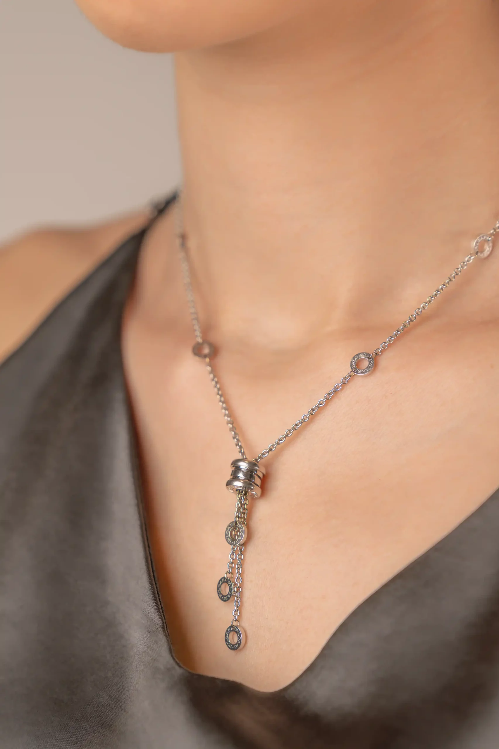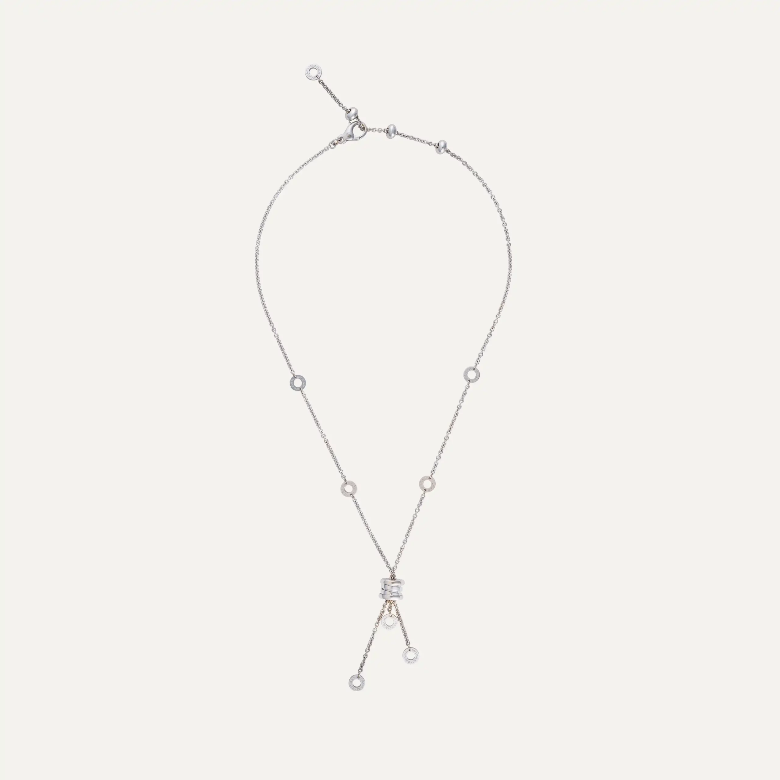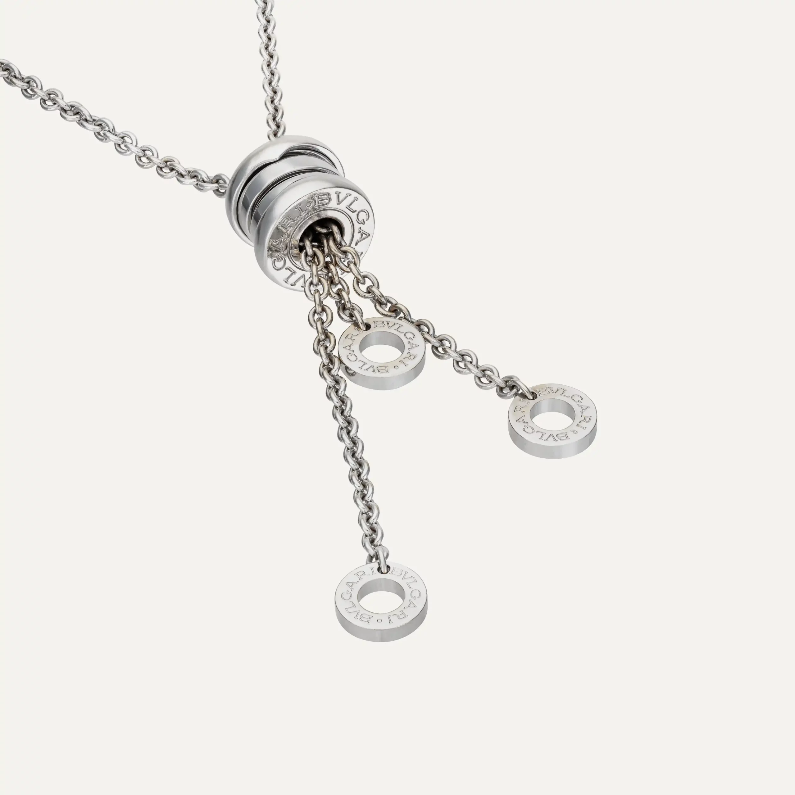 Crafted in 18 ct white gold, this B.Zero1 necklace features the signature cylindrical pendant engraved with the Bvlgari logo, suspended from a delicate white gold chain. The pendant design is enhanced by circular discs bearing the Bvlgari logo at the ends, creating movement and a distinctive contemporary profile. The polished white gold finish highlights the pendant’s architectural structure while maintaining a versatile and minimalist aesthetic.
