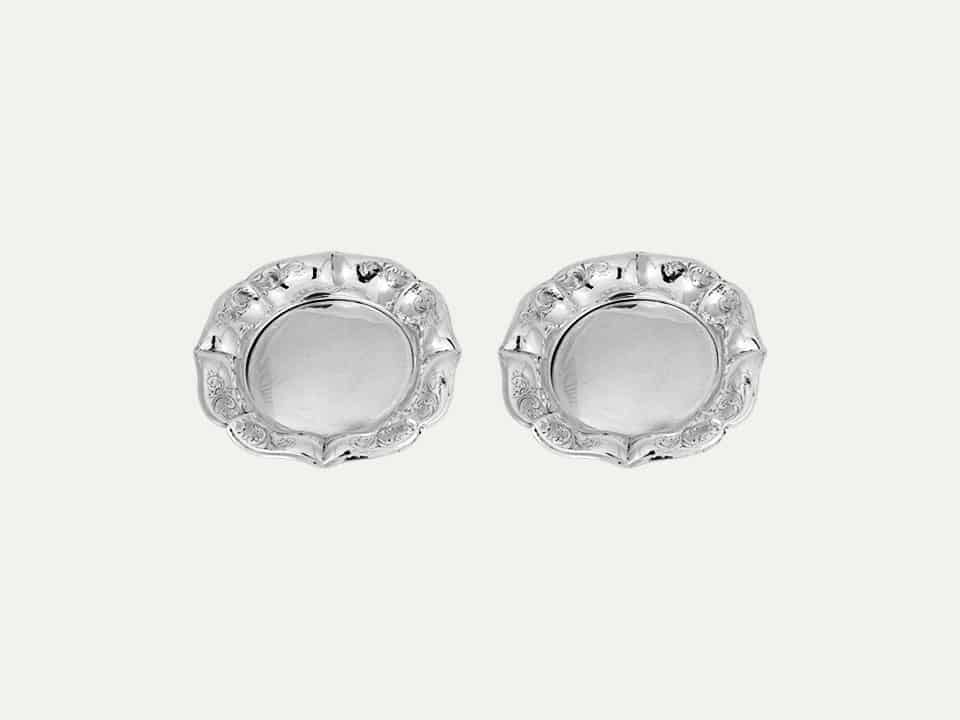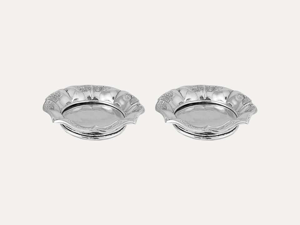 Pair of silver wine bottle coasters decorated with floral engraving
