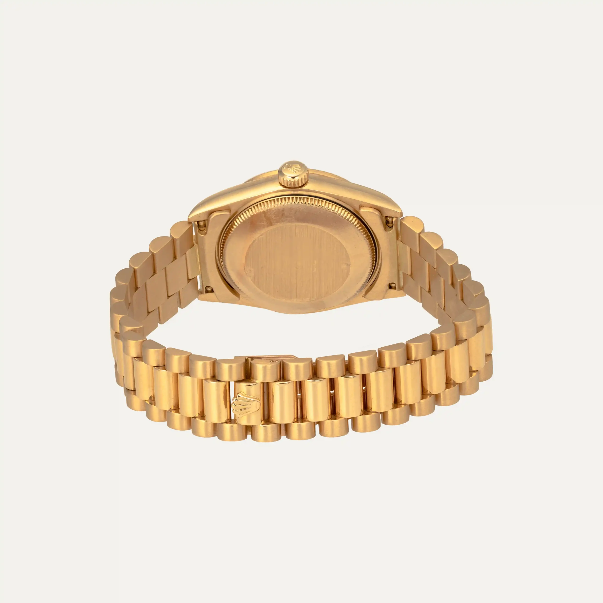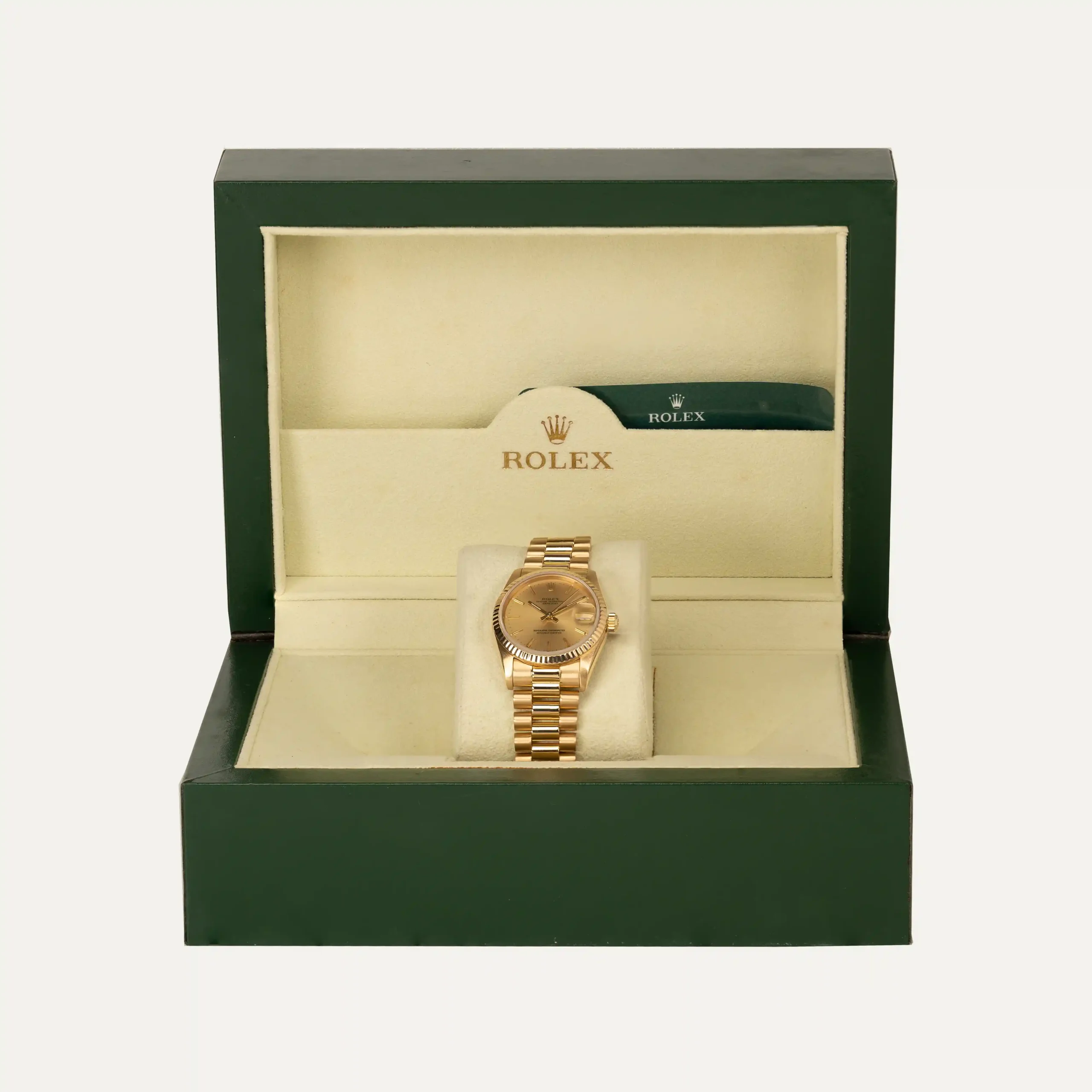 Rolex Datejust watch, automatic movement, 31mm in diameter and 11mm thick. 18kt– 750‰ yellow gold case, fluted gold bezel, gold dial with index, hour, minute and seconds hands, date at 3 o’clock. Screw-down crown with Rolex logo. Sapphire crystal. Gold bracelet with folding clasp. Rolex case. “The Watch Register” certificate and “International Service Guarantee”. Includes 1 year in-house warranty.