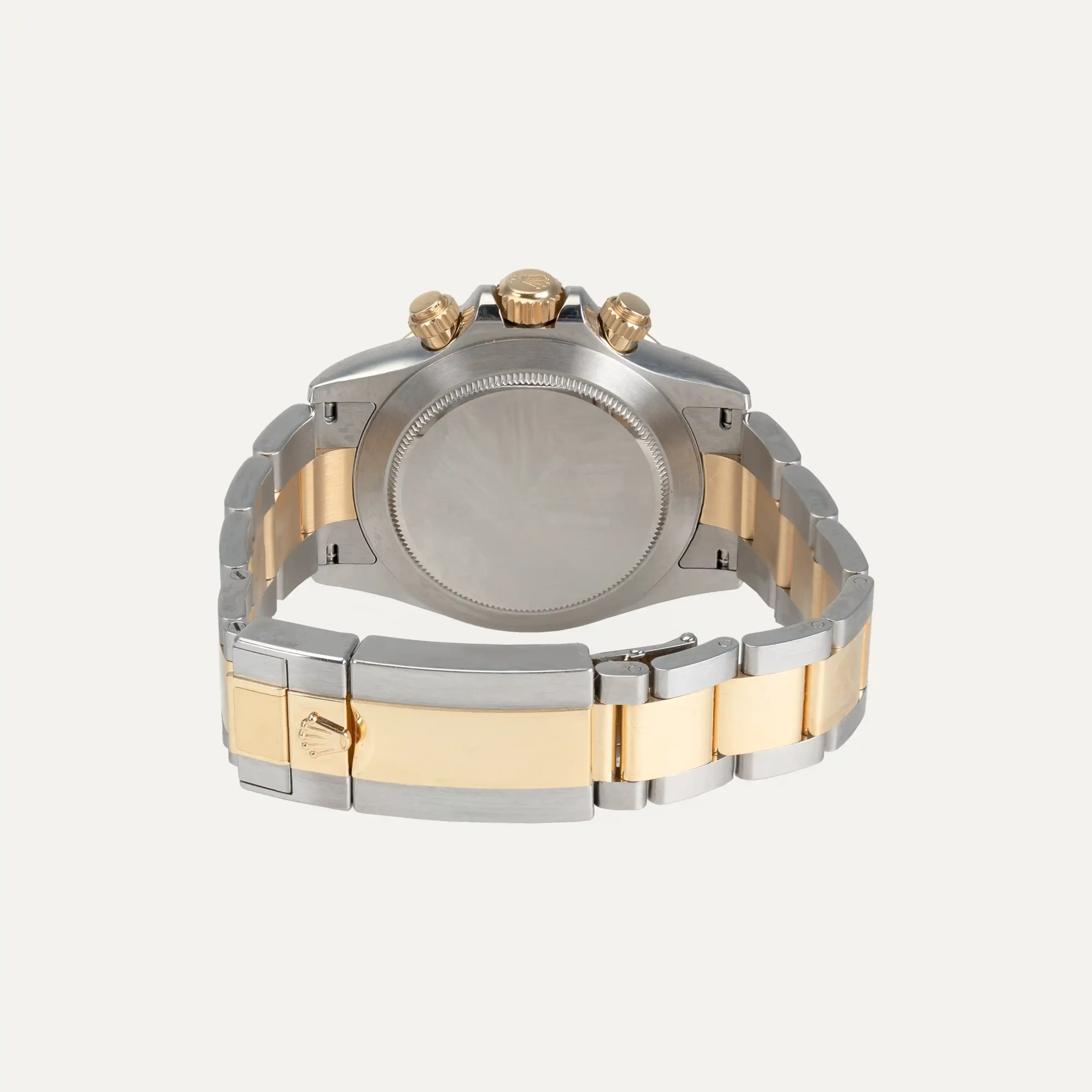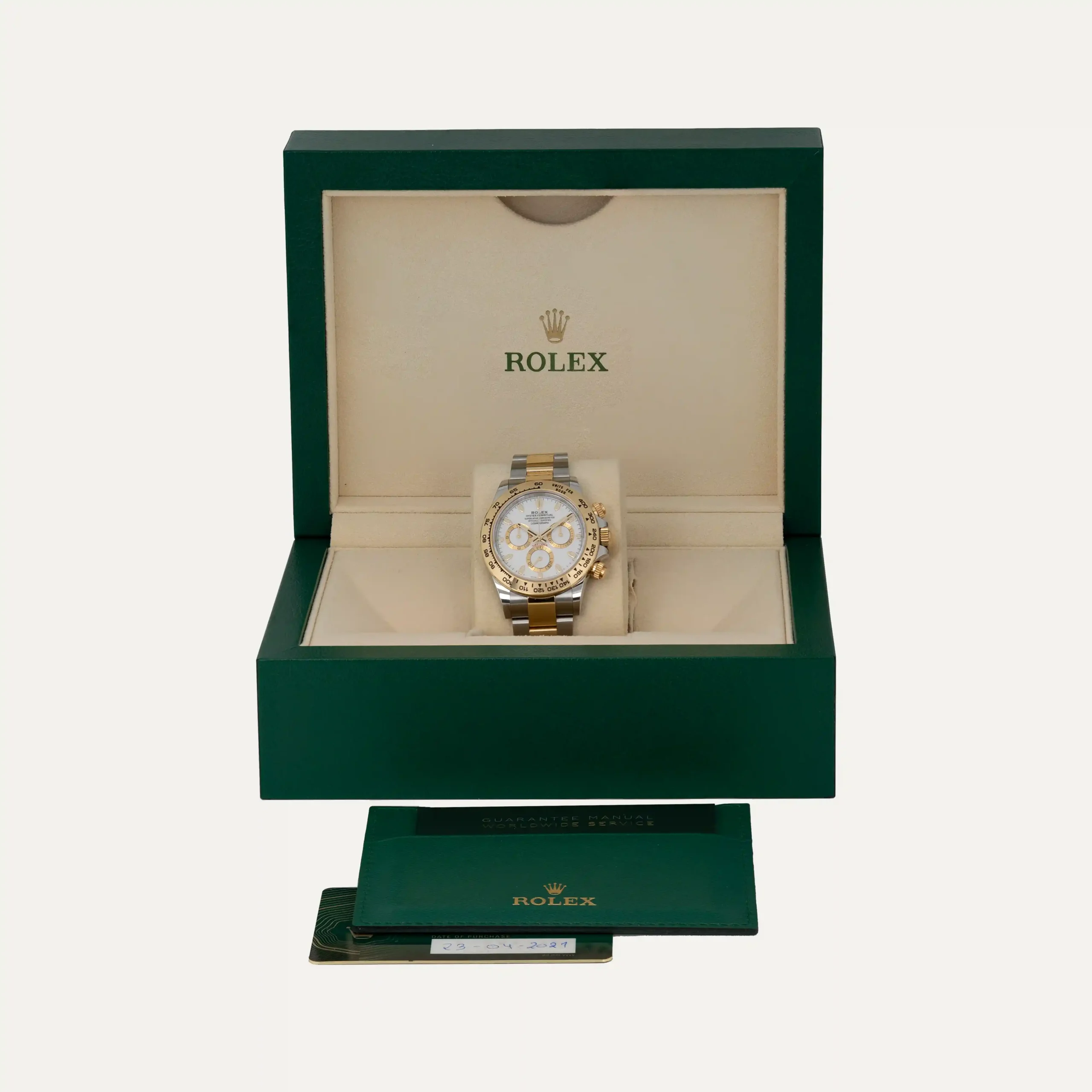 Rolex Daytona chronograph watch, automatic movement, steel and gold case, 40mm in diameter and 12.4 mm thick. White dial with luminescent index. Luminescent hour and minute hands. Chronograph and tachymeter scale. Screw-down crown with 72-hour power reserve. Sapphire crystal. Steel and gold bracelete with folding clasp. Contain two replacement links. COSC certificate and ‘The Watch Register’ certificate. Rolex box and documents. With Rolex guarantee valid until 2026.