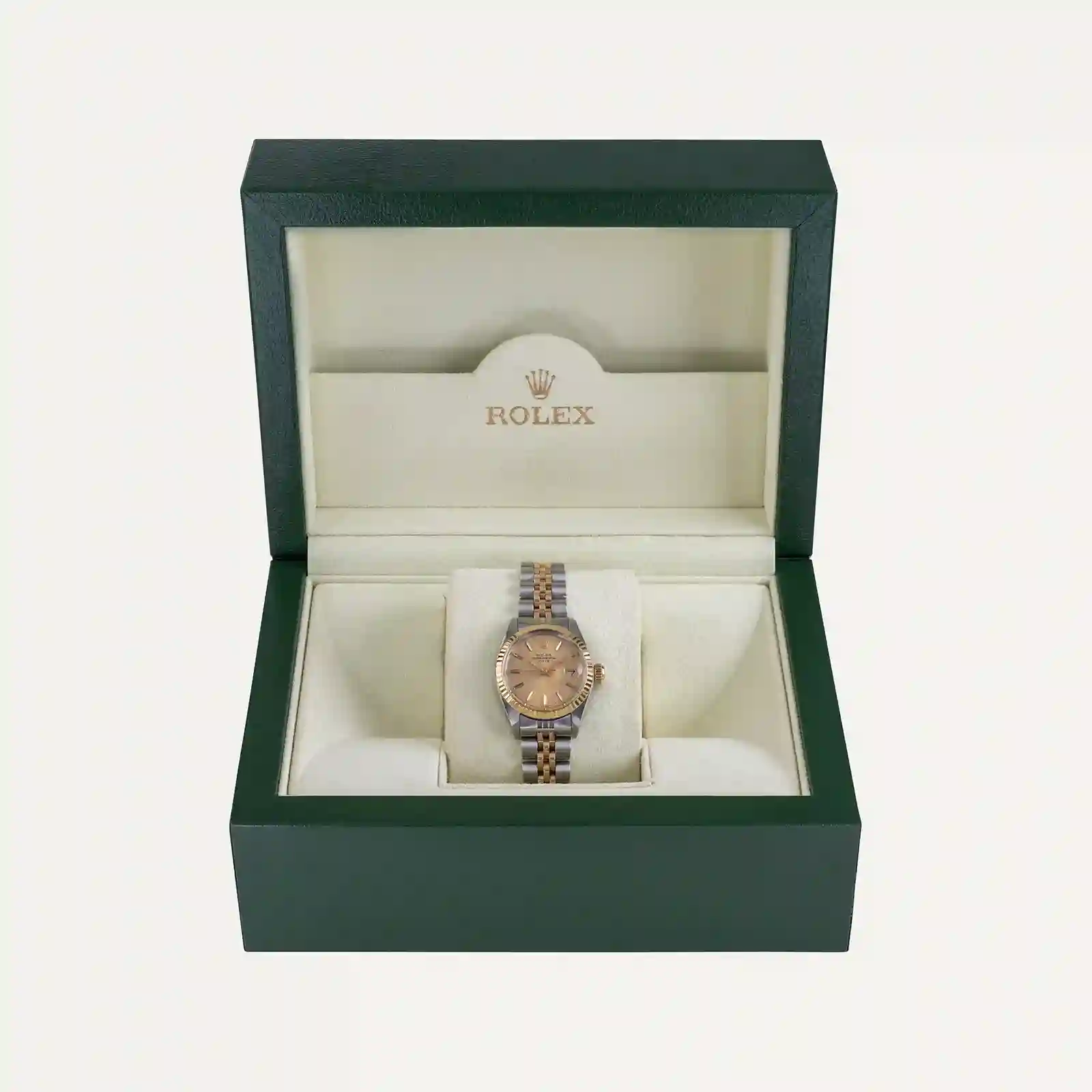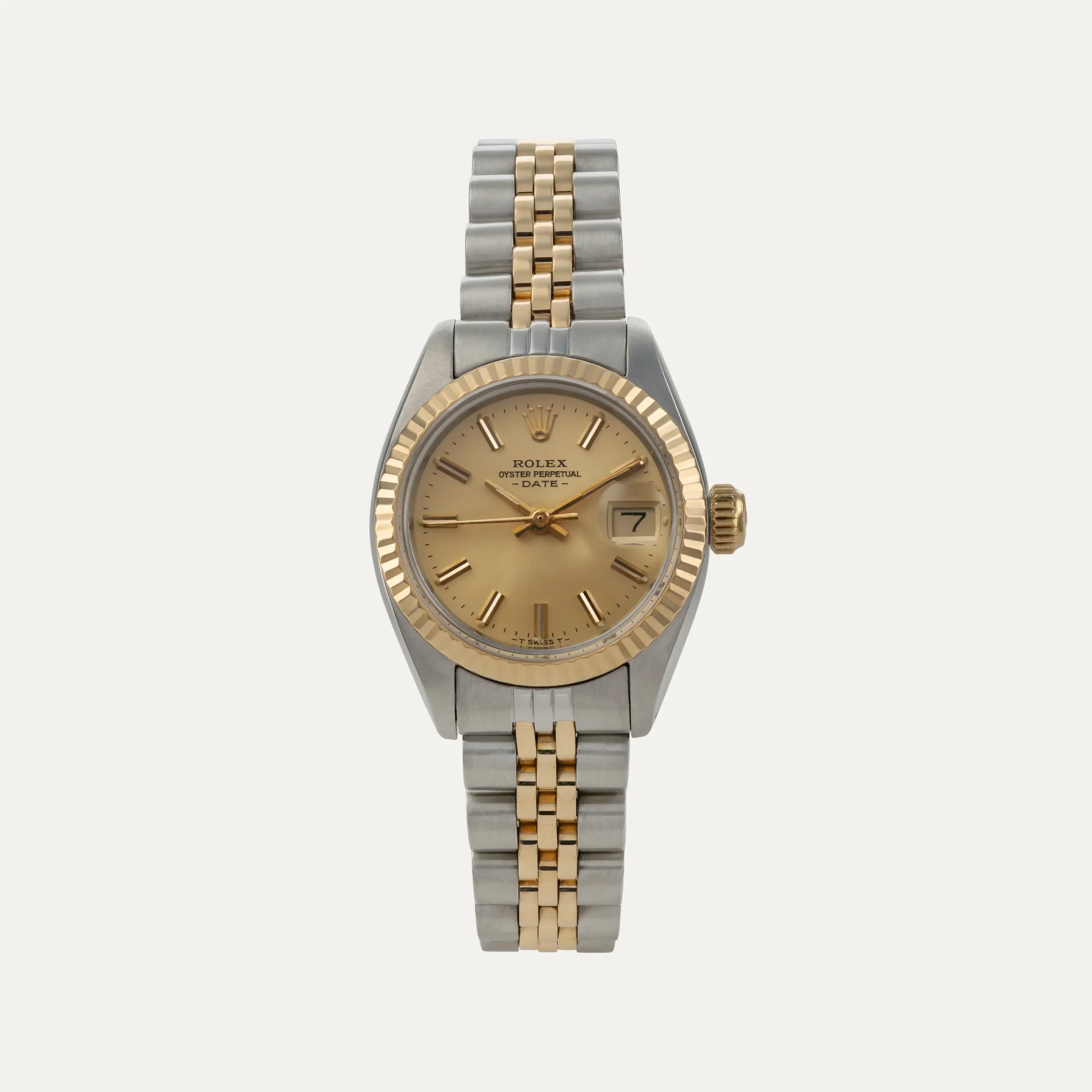 Rolex Oyster Perpetual Date watch, automatic movement, with a 26mm diameter and 11.5 mm thickness. Stainless steel and yellow gold 18kt – 750‰ case, fluted gold bezel, gold dial with index, hour, minute, and second hands, date at 3 o’clock. Screw-down crown with Rolex logo, 42-hour power reserve. Acrylic “plexiglass”. Stainless steel bracelet with folding clasp. Comes with the original Rolex box. “The Watch Register” certified. This watch is supported by our one-year guarantee.