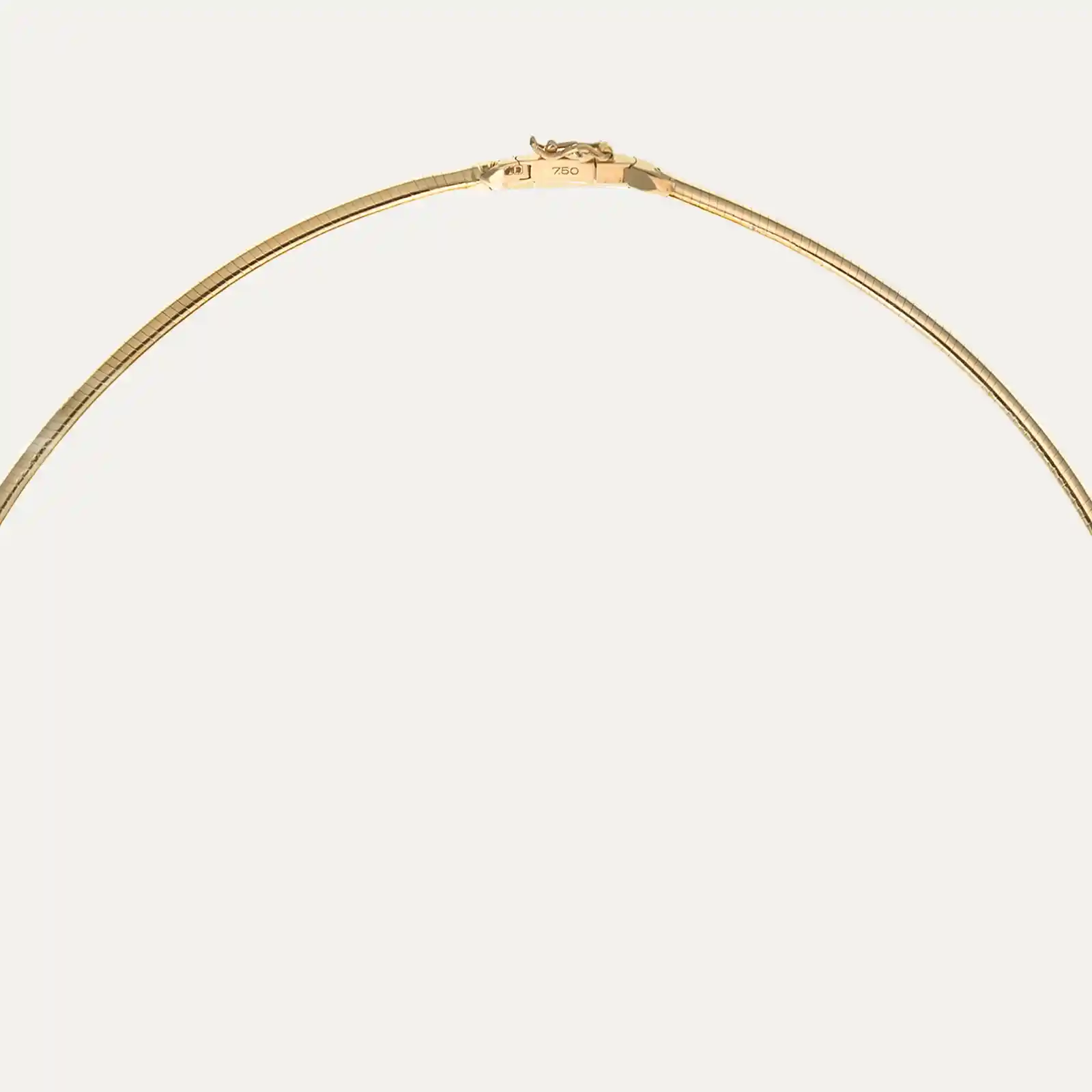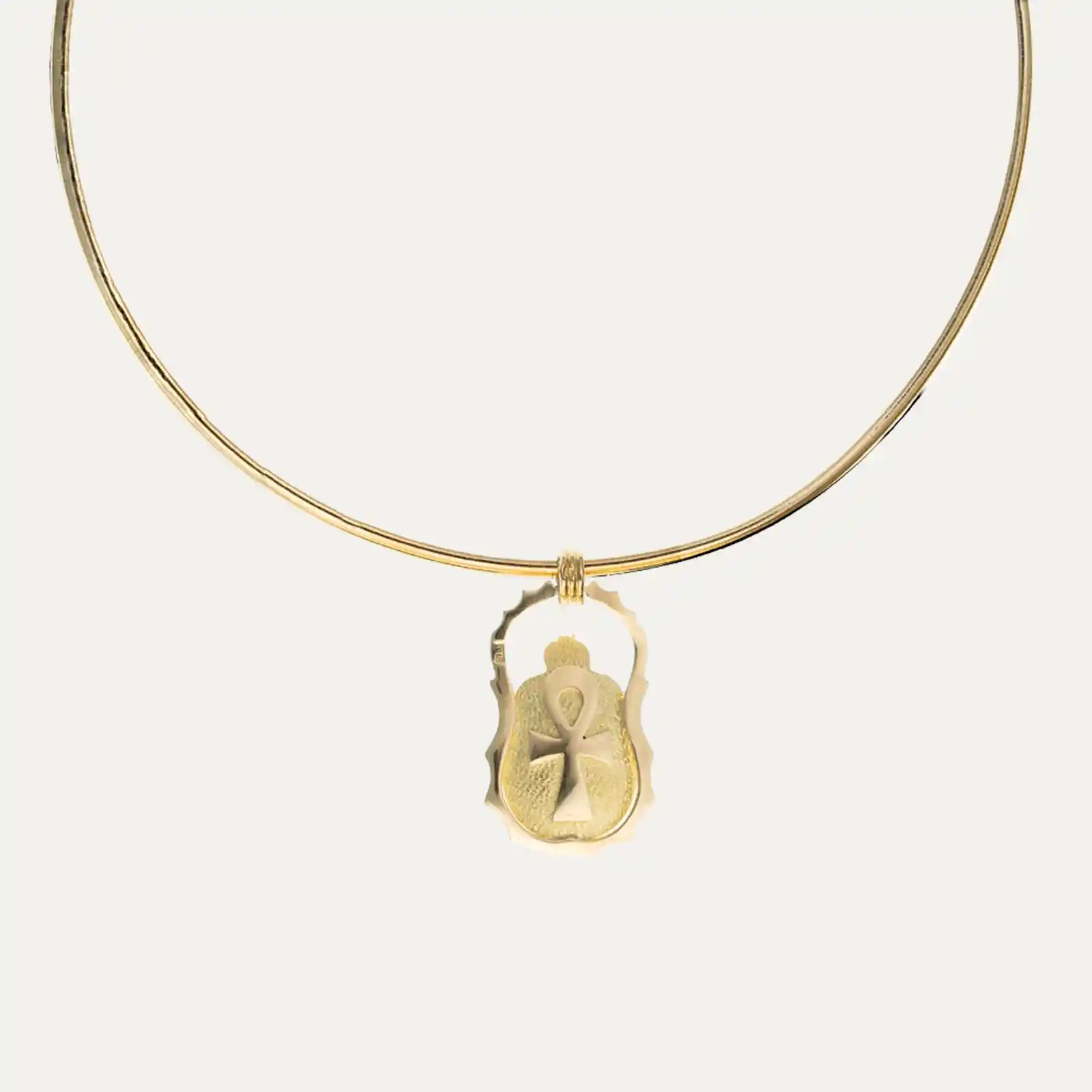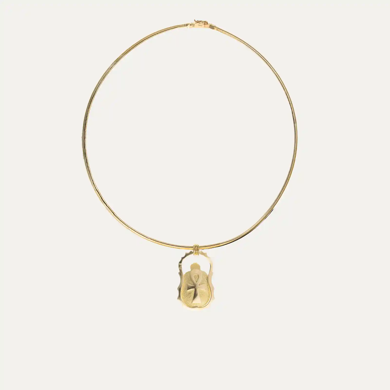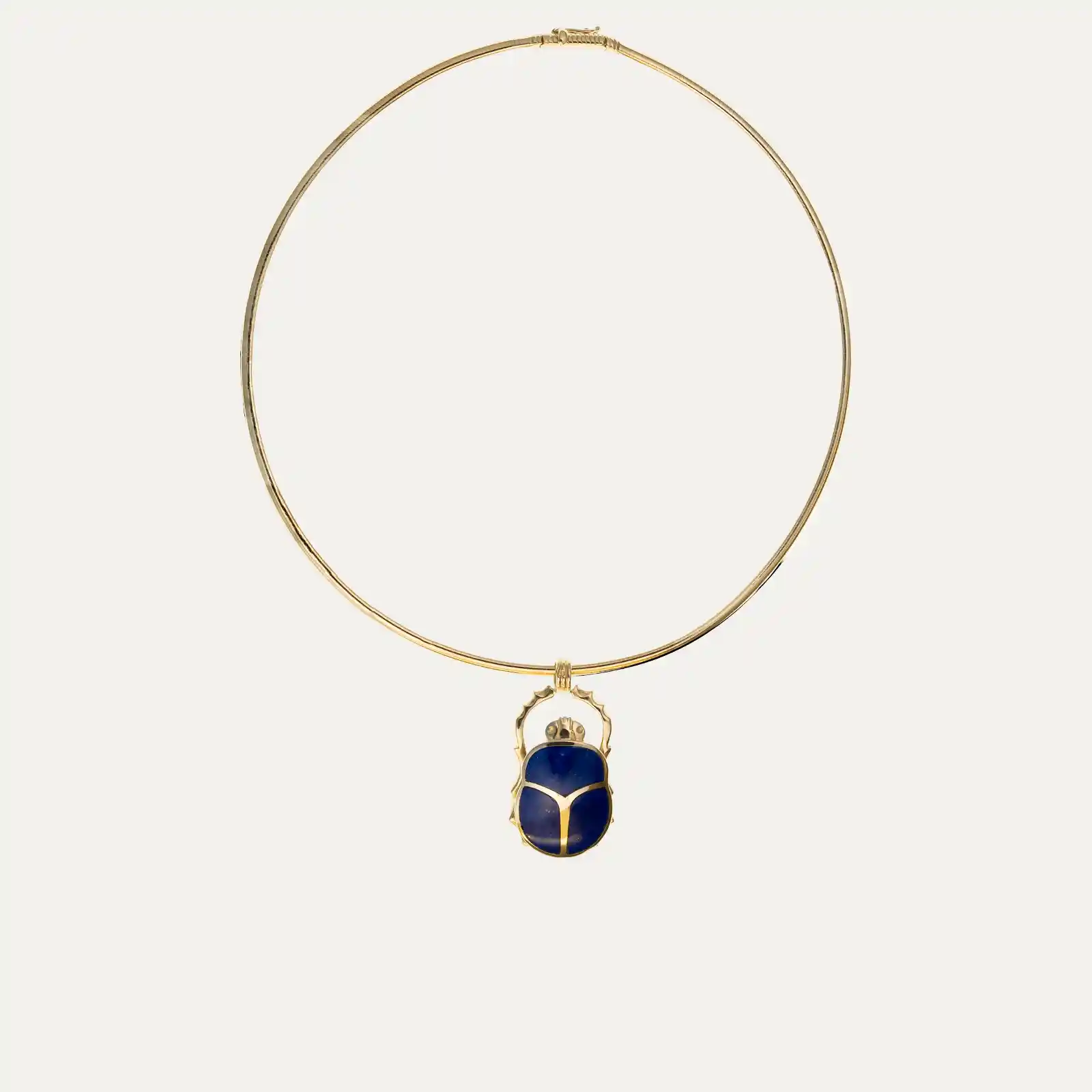 Choker with a semi-rigid mesh in 18kt (750‰) yellow gold, featuring a beetle pendant adorned with three deep, intense blue lapis lazuli. The scarab, inspired by the symbolism of Ancient Egypt, represents renewal, protection, and strength. It has a snap closure and a figure-eight safety clasp.