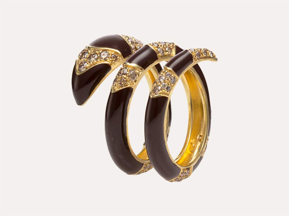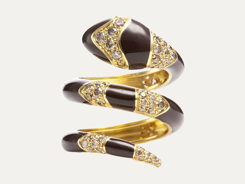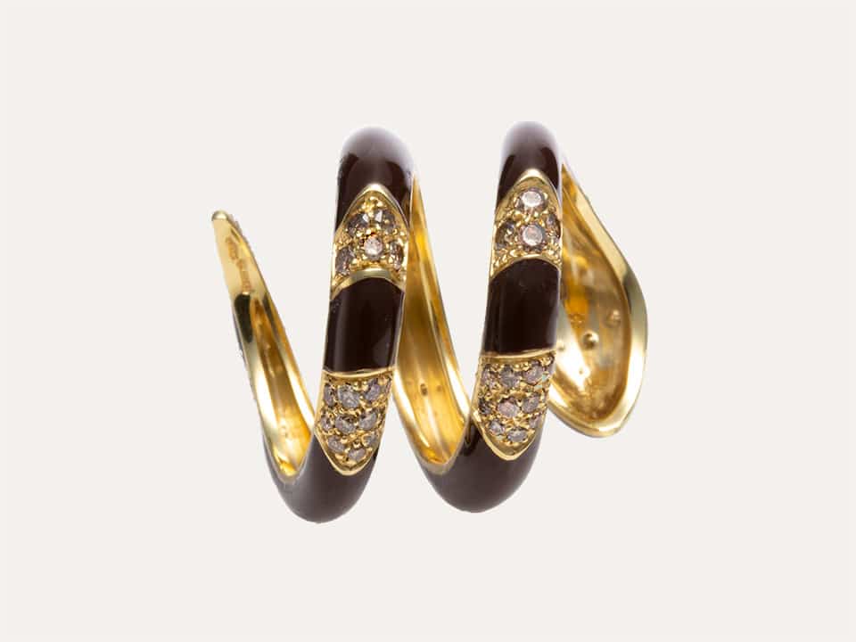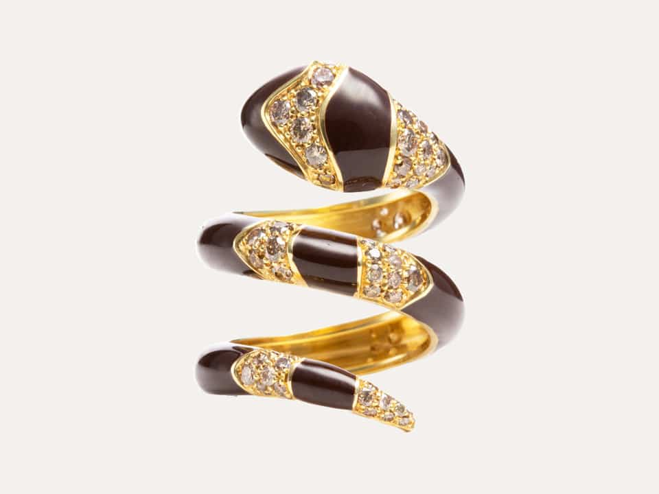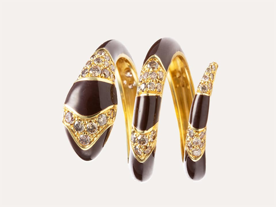 18.0 kt – 750 ‰ snake-shaped yellow gold ring with brown enamel and diamond pave. Size 51, not adjustable.