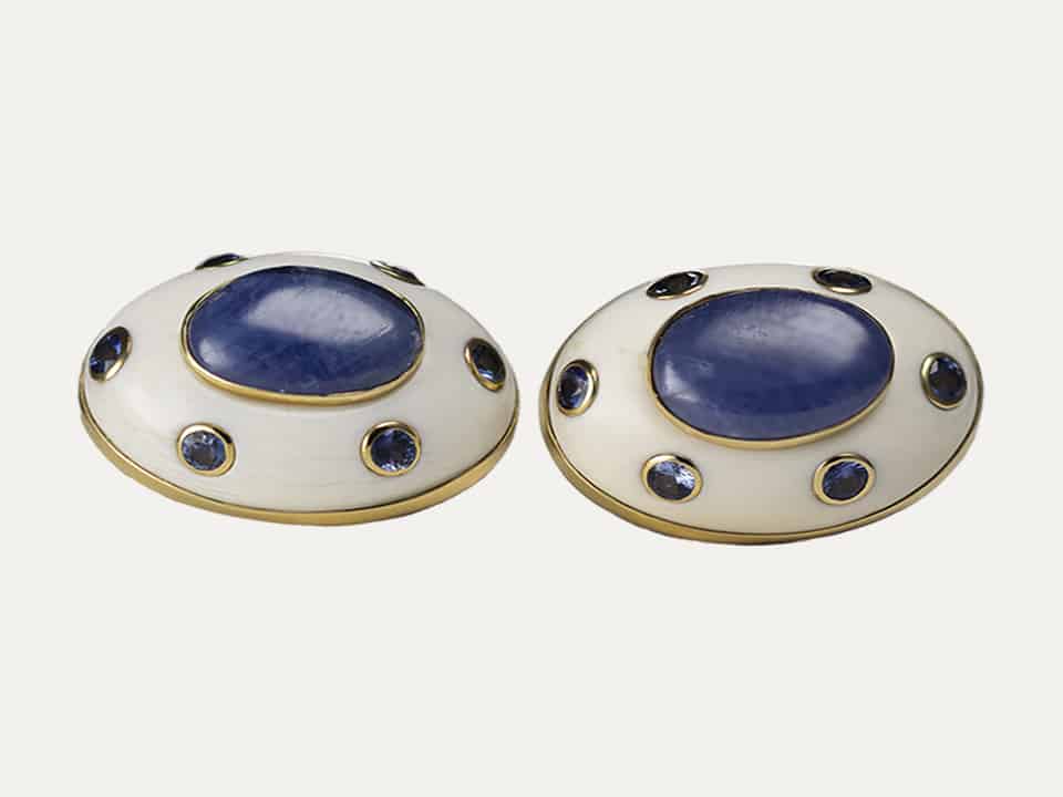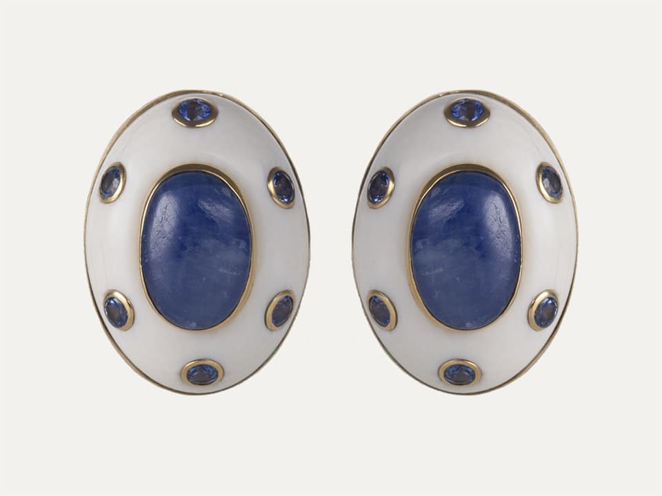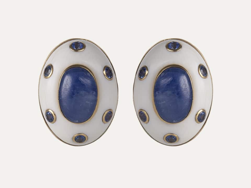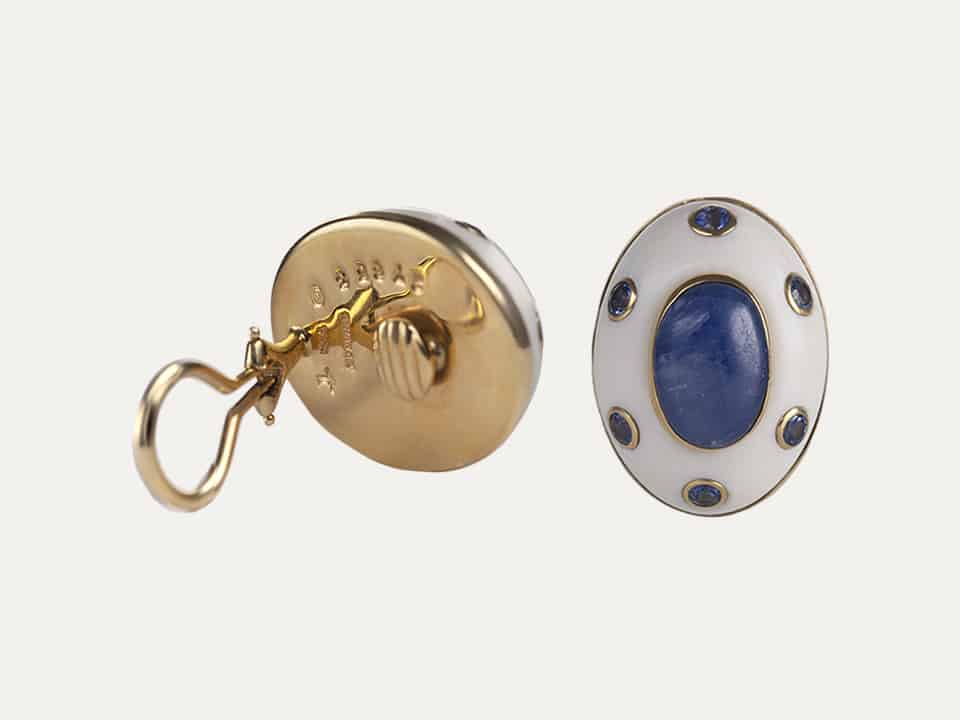 Trianon oval 18kt – 750‰ yellow gold earrings with cacholong opals, 2 oval-shaped sapphires and 12 round-shaped sapphires. Omega spring system.