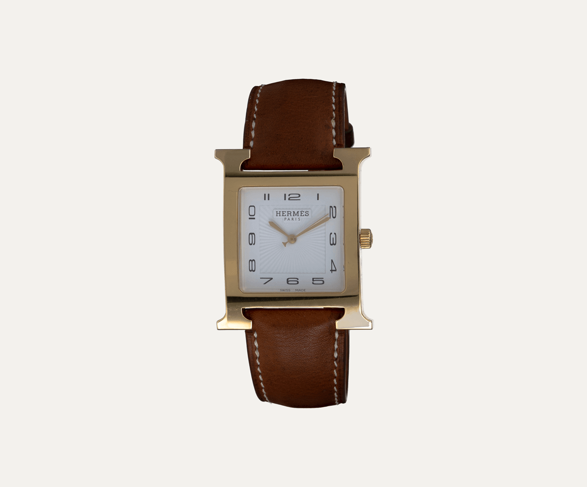 Hermès Heure H watch, quartz movement, plaqué case with 30 x 41mm and 7.8mm thick. White striped dial, Arabic numerals. Hour, minute and seconds hands. Sapphire crystal. Camel leather strap and Hermès plaqué buckle. Hermès box and documents. Includes 1 year in-house warranty.