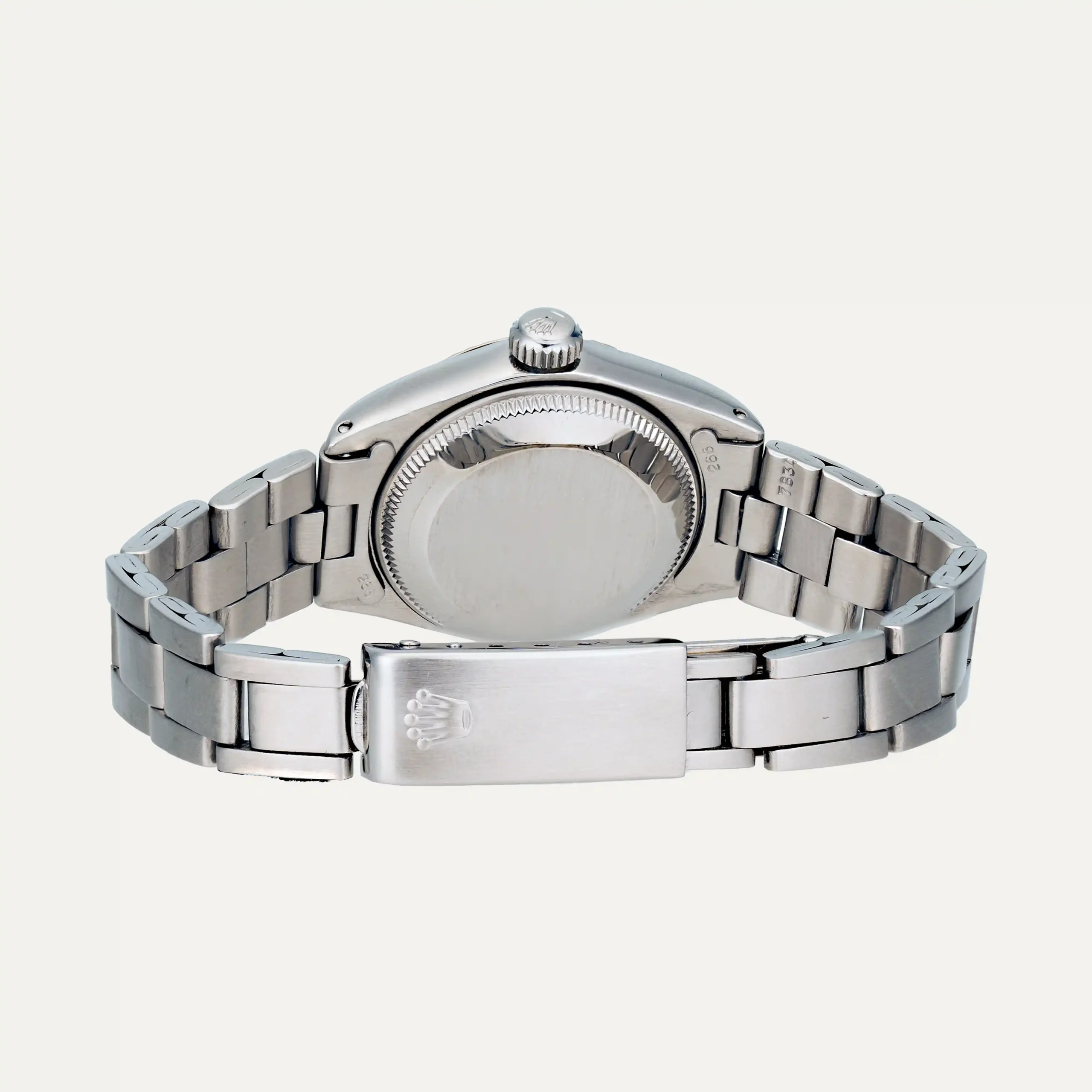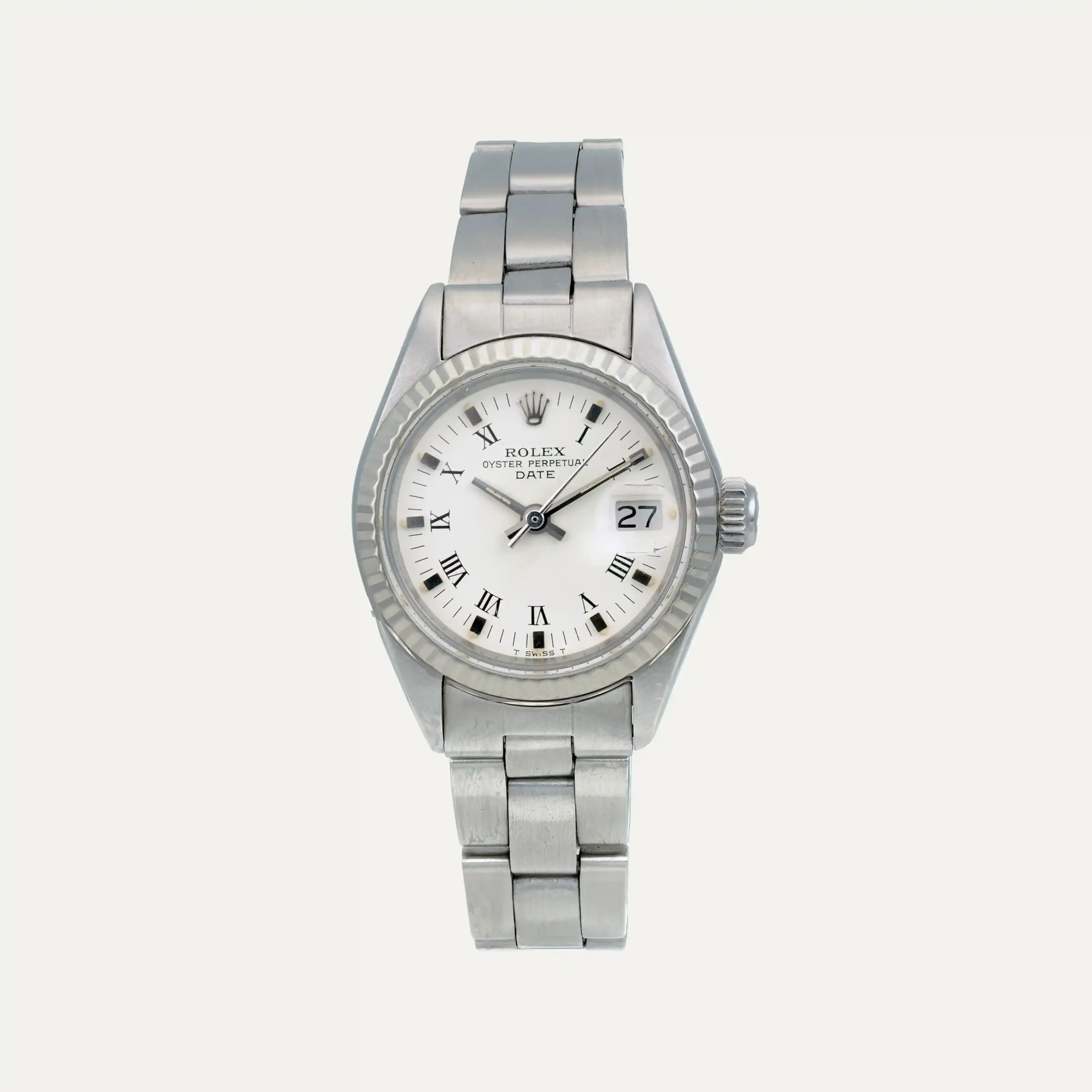 Rolex Oyster Perpetual Date watch, automatic movement, with a 26mm diameter and 11.5mm thickness. Stainless steel case, white dial with Roman numerals, hour, minute, and second hands, date at 3 o’clock. Screw-down crown with Rolex logo, 42-hour power reserve. Acrylic glass. Stainless steel bracelet with folding clasp. Comes with the original Rolex box. “The Watch Register” certified. This watch is supported by our one-year guarantee.