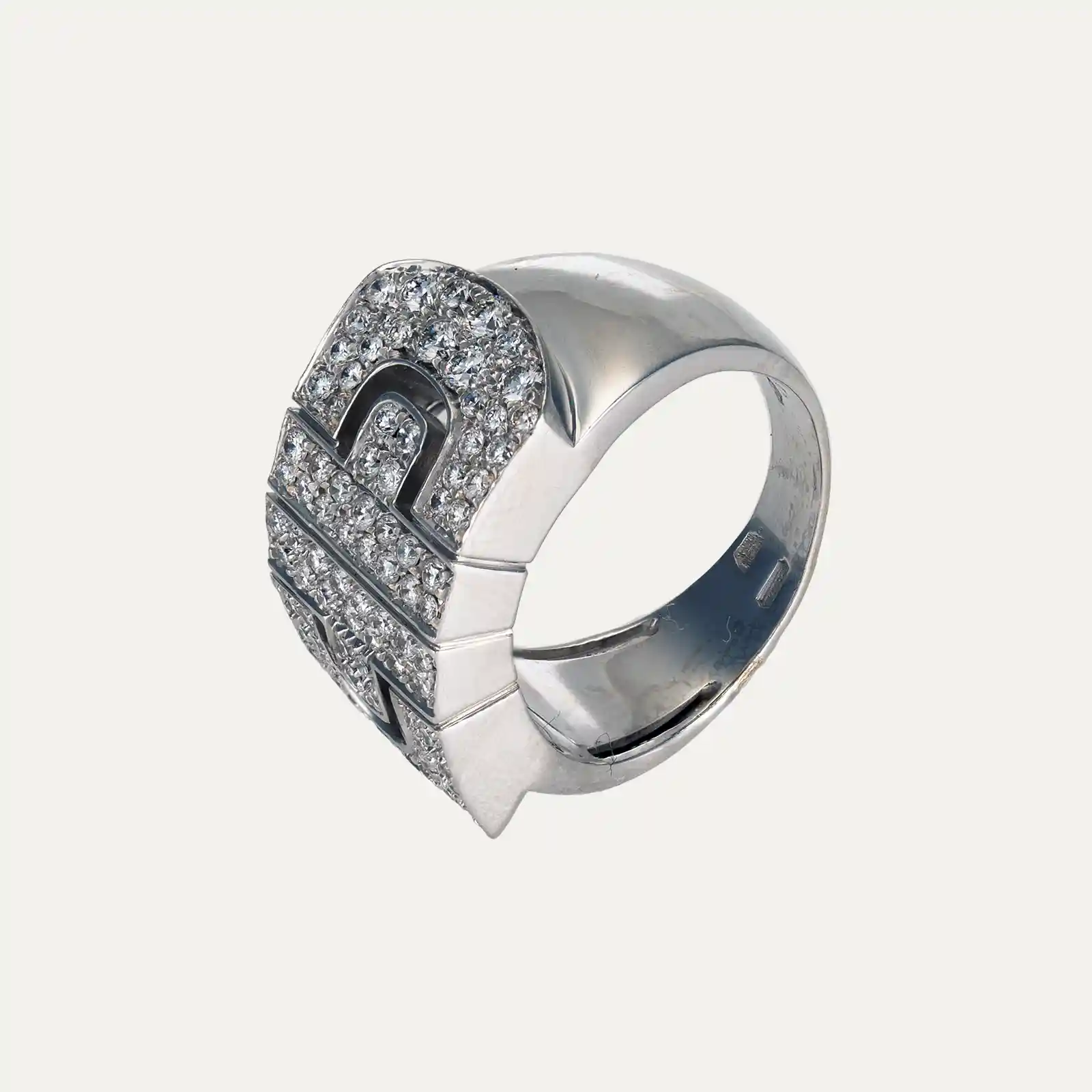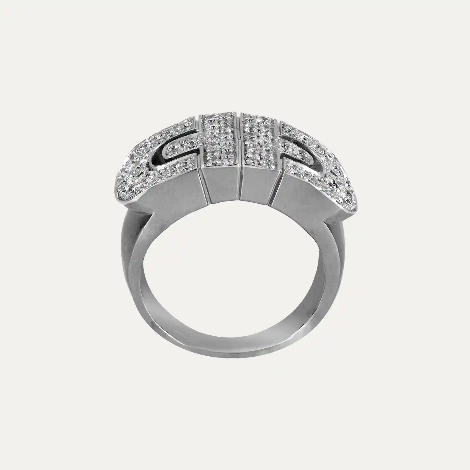 18kt – 750‰ Bulgari white gold ring, from the Parentesi collection. Inspired by the iconic Parentesi design, with an interlaced, geometric pattern that evokes the paving stones that covered the ancient roads of Rome. Set with a pave of 88 brilliant-cut diamonds totalling around 1.14ct, G colour and VS clarity. Signed Bulgari, italian hallmarks. This ring is part of a set with the necklace Ref: 9003673.