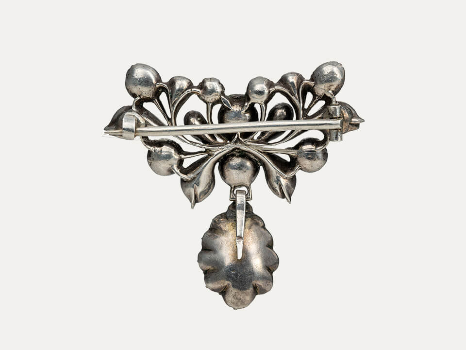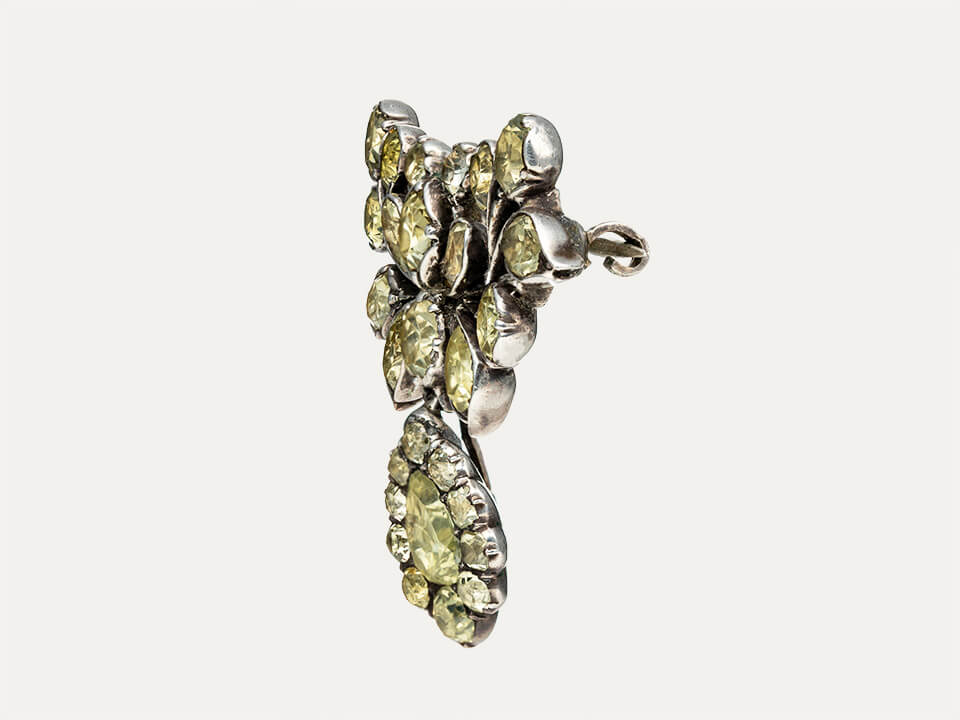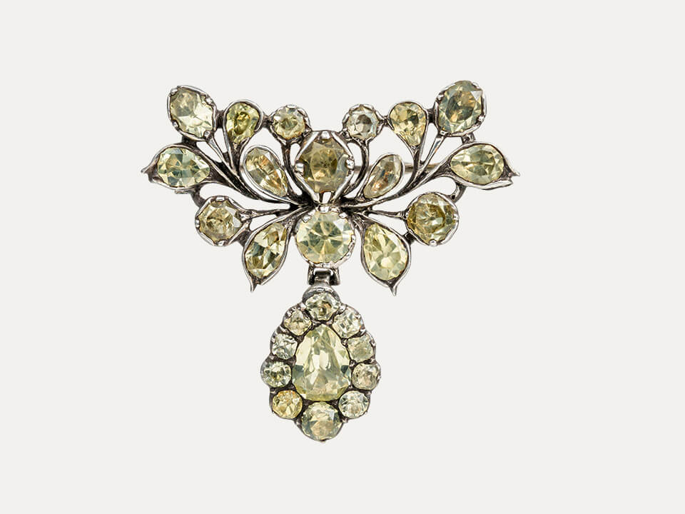 Alfinete “Laço”, em prata cravejado com crisólitas (crisoberilos), Potugueses Séc.XVIII. Com pingente girândola amovível. Sem contraste, ao abrigo do Decreto-Lei n.º 120/2017, artigo 2, nº 2, alínea C e artigo 3.