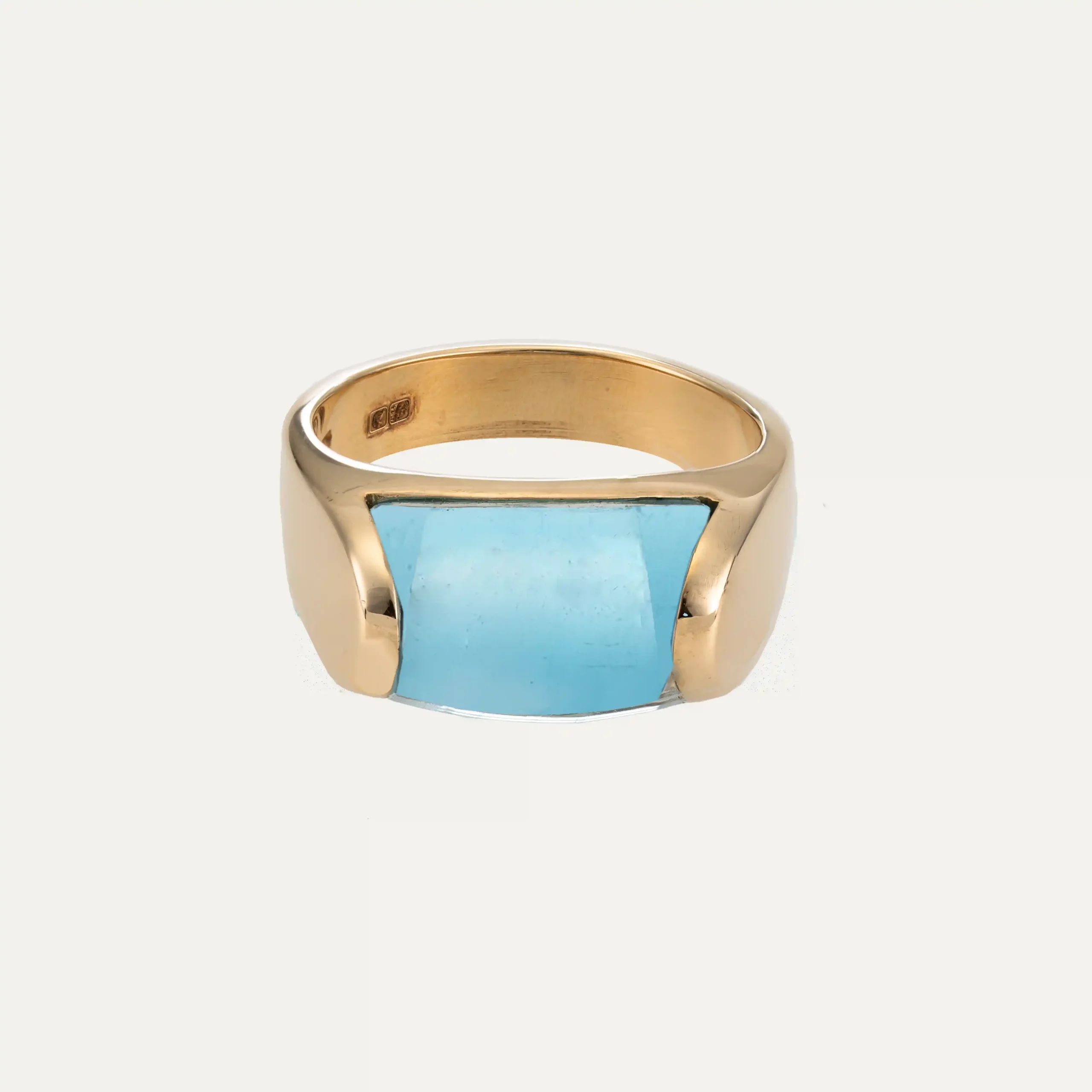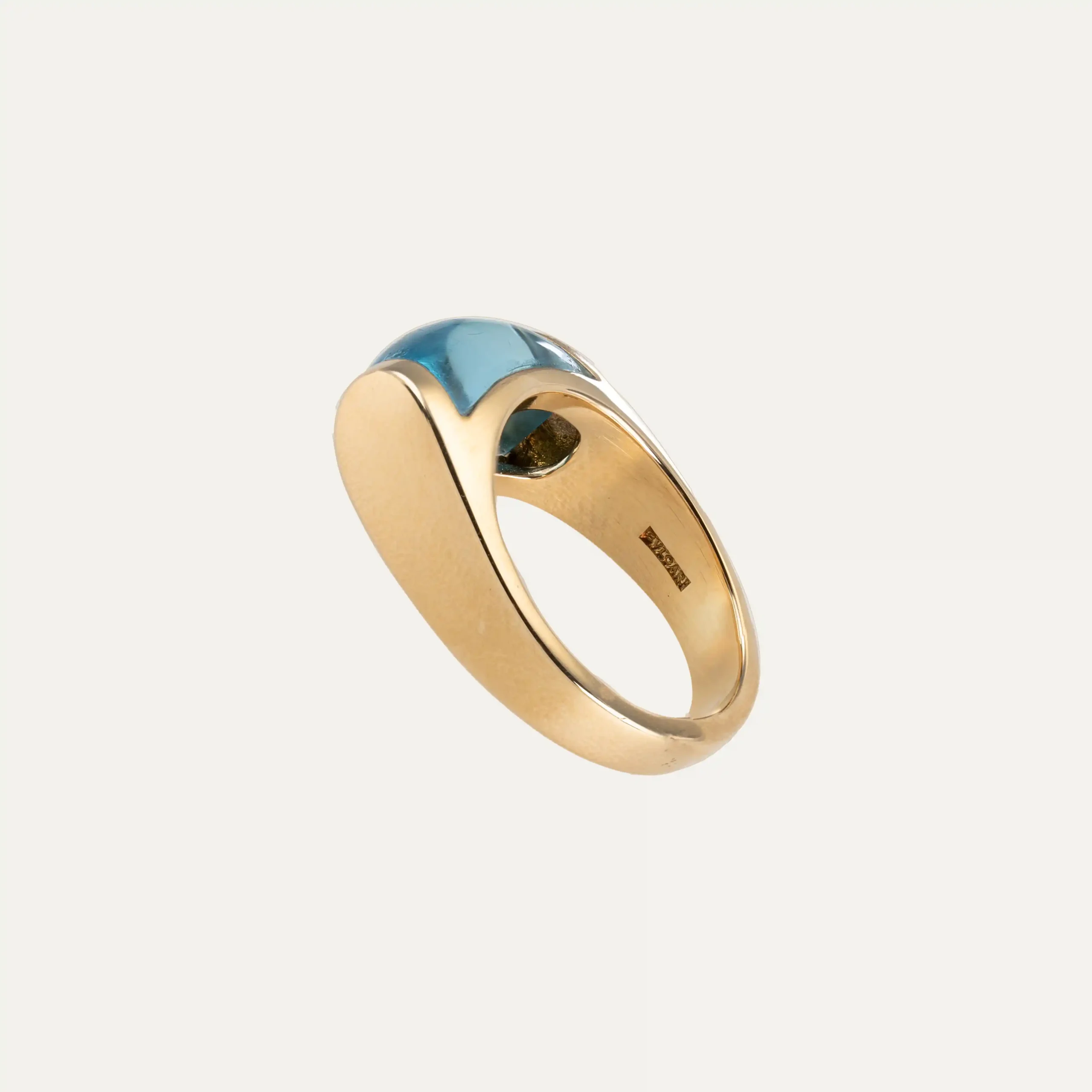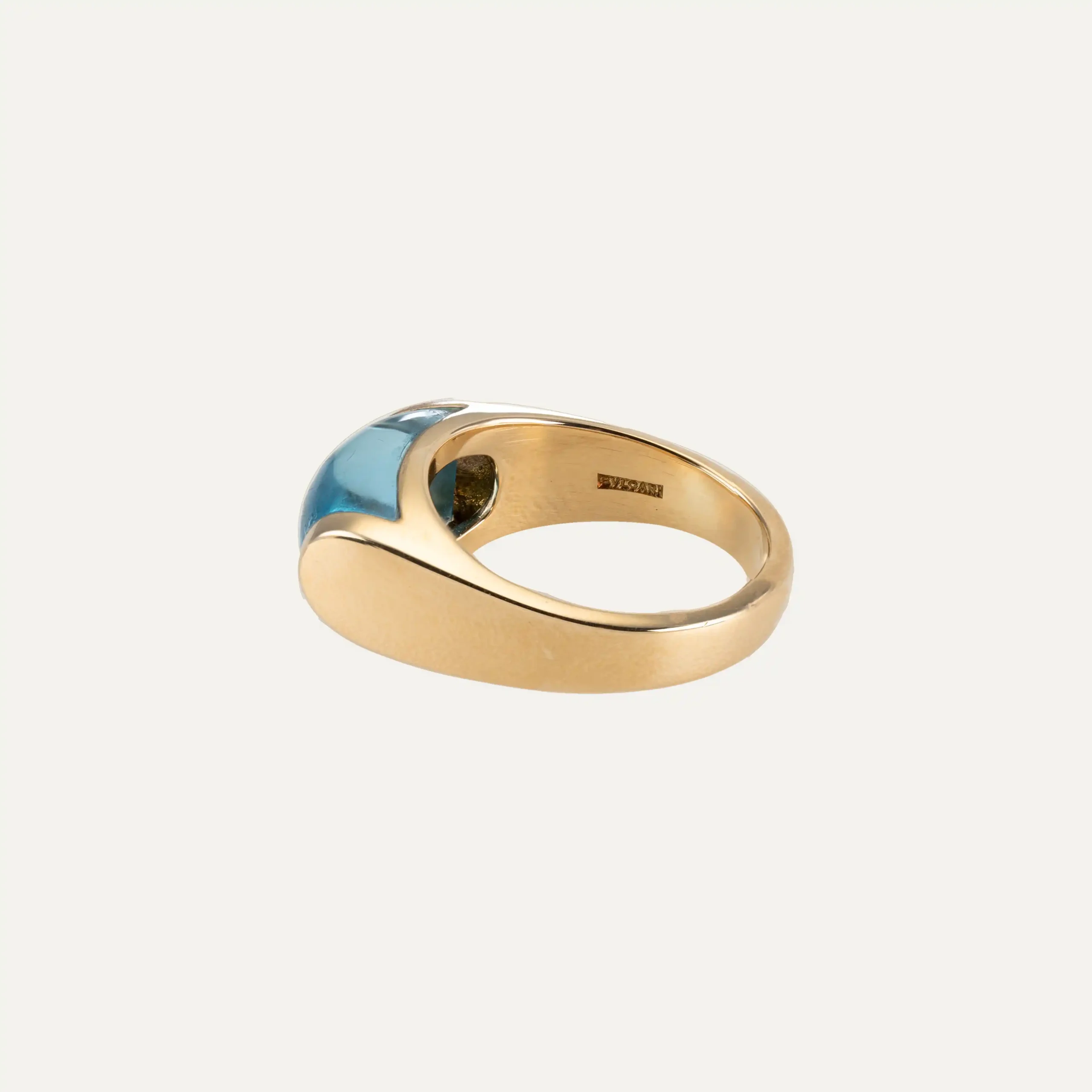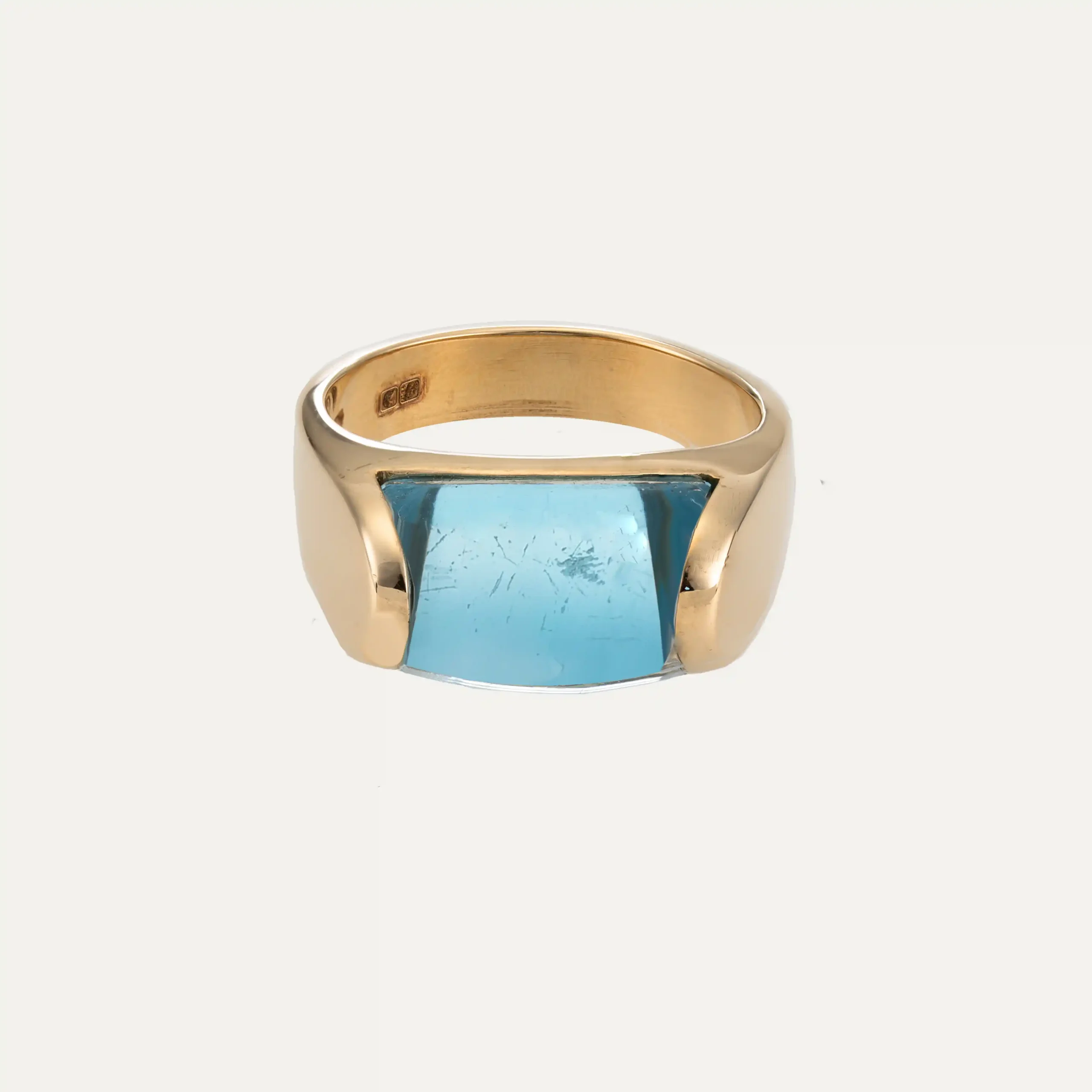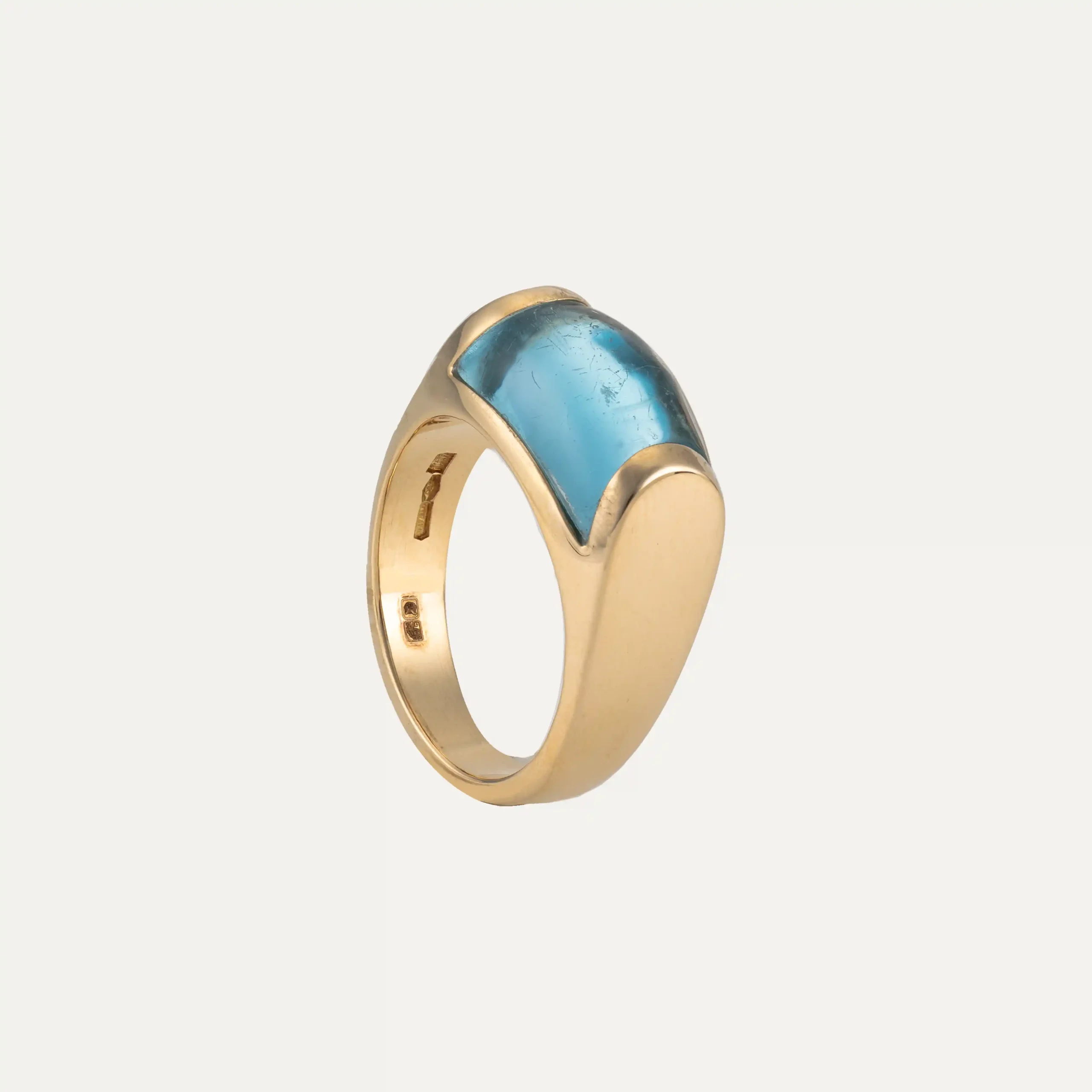 Anel Trochetto da Bulgari, em ouro amarelo 18 kt – 750 ‰, com topázio azul de corte trapezoidal. Assinado Bulgari. Acompanha documento de intervenção da Bulgari e caixa original da marca. Itália, cerca de 1980. Contraste italiano e remarcado com contrastes portugueses pós-2021.