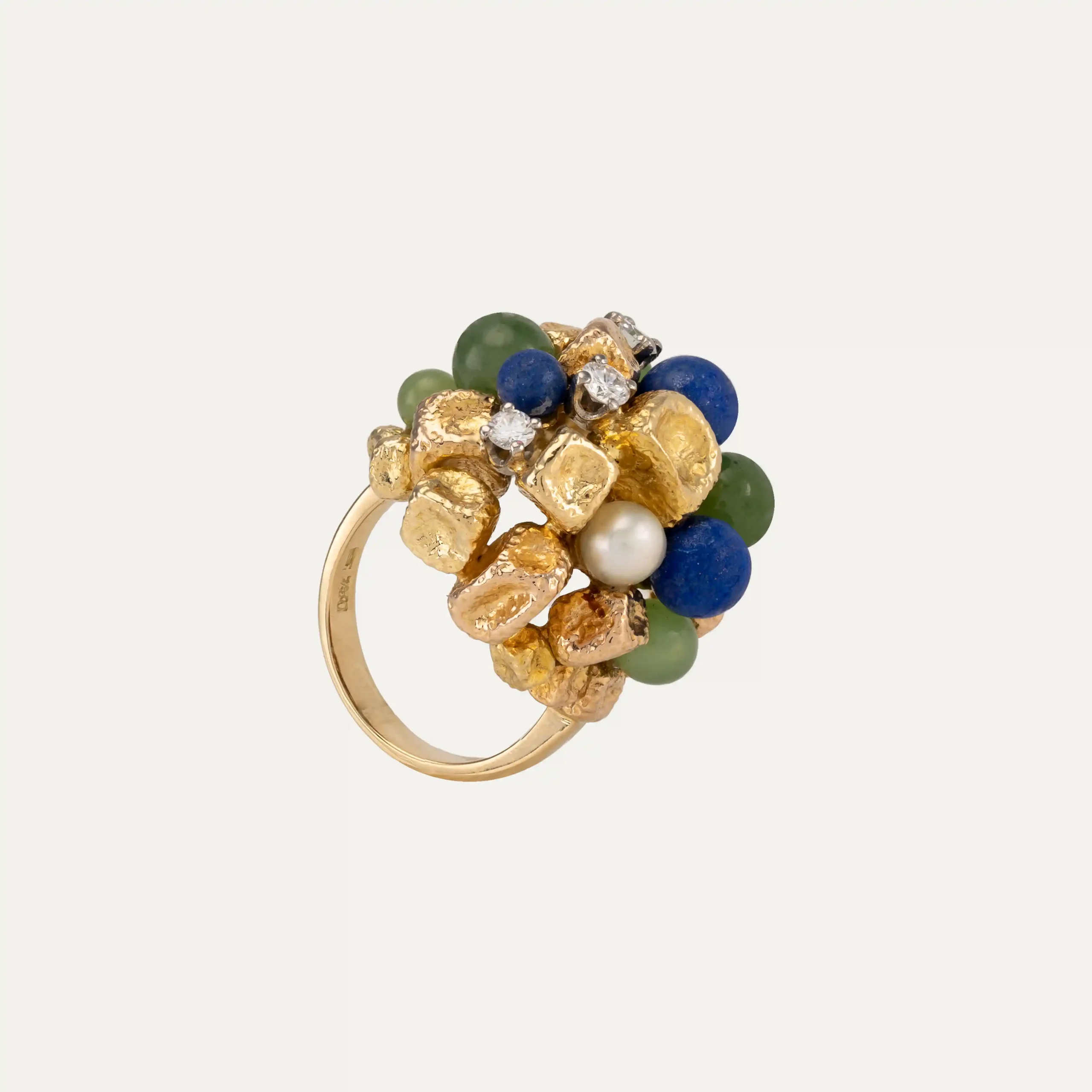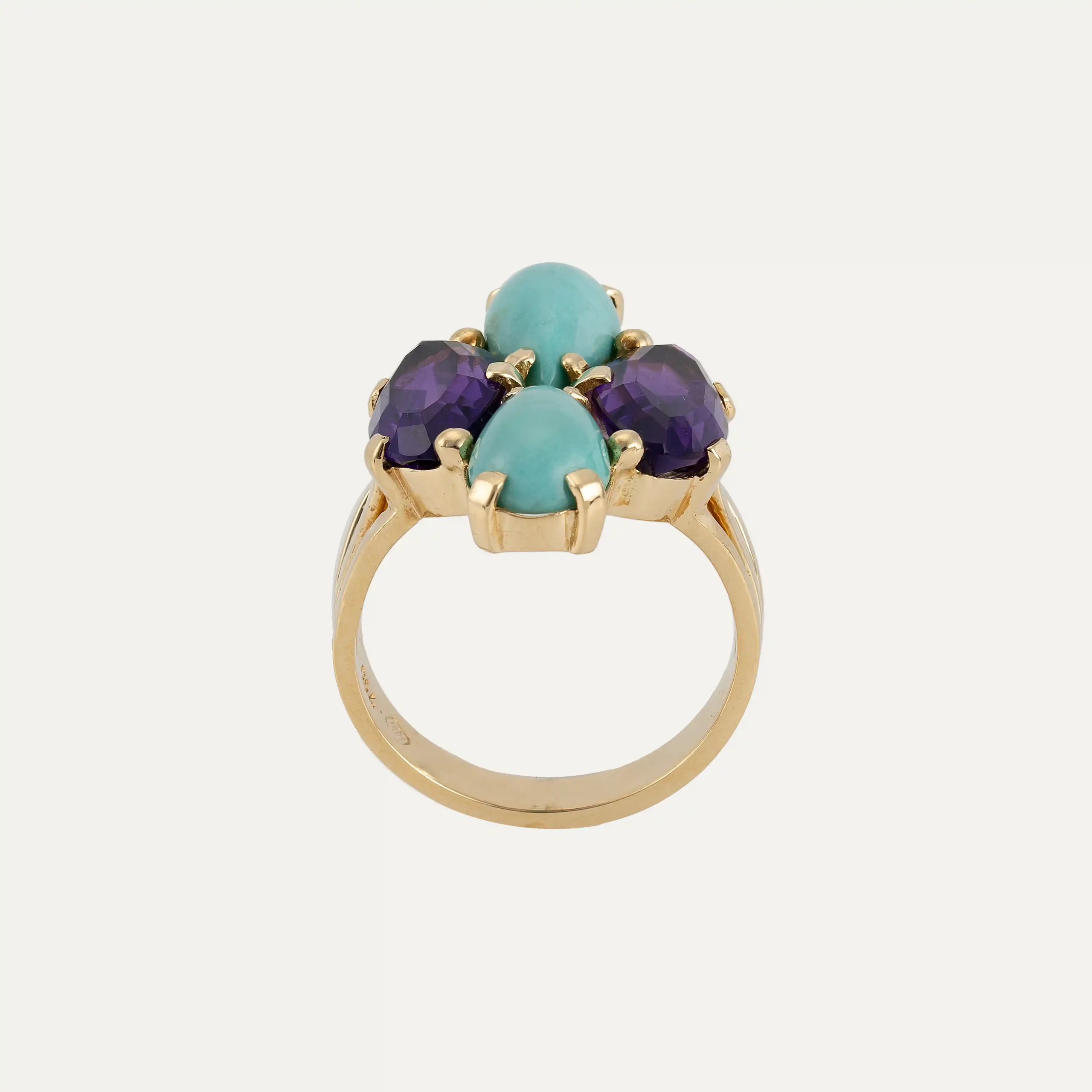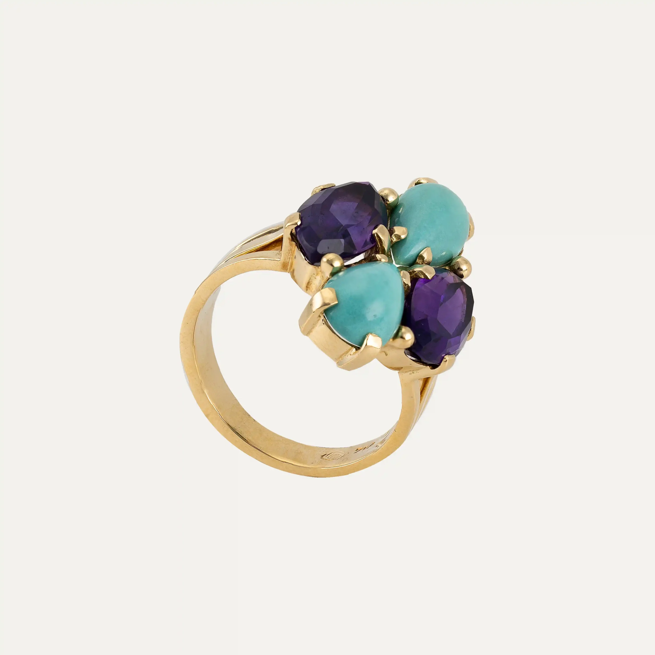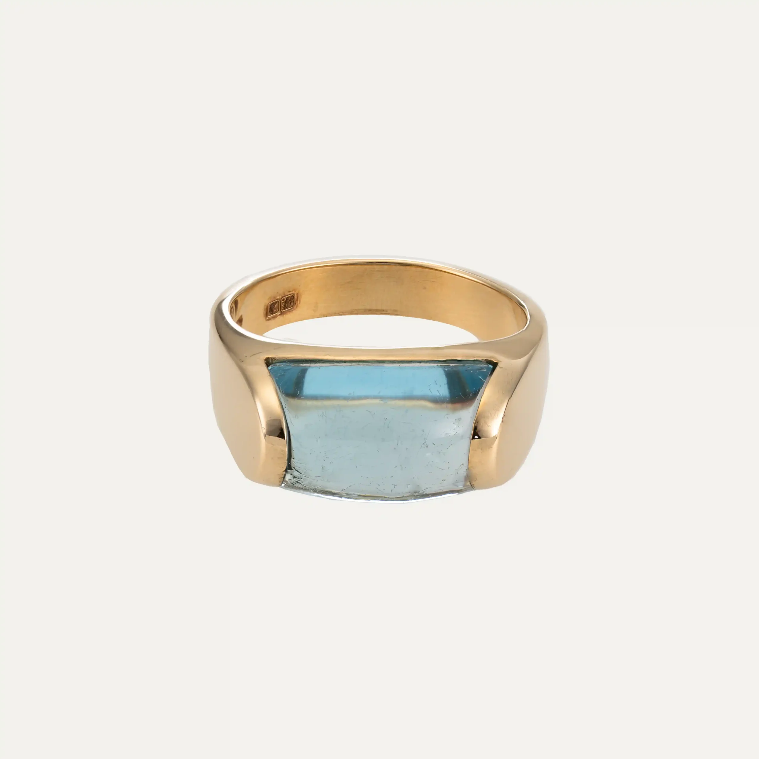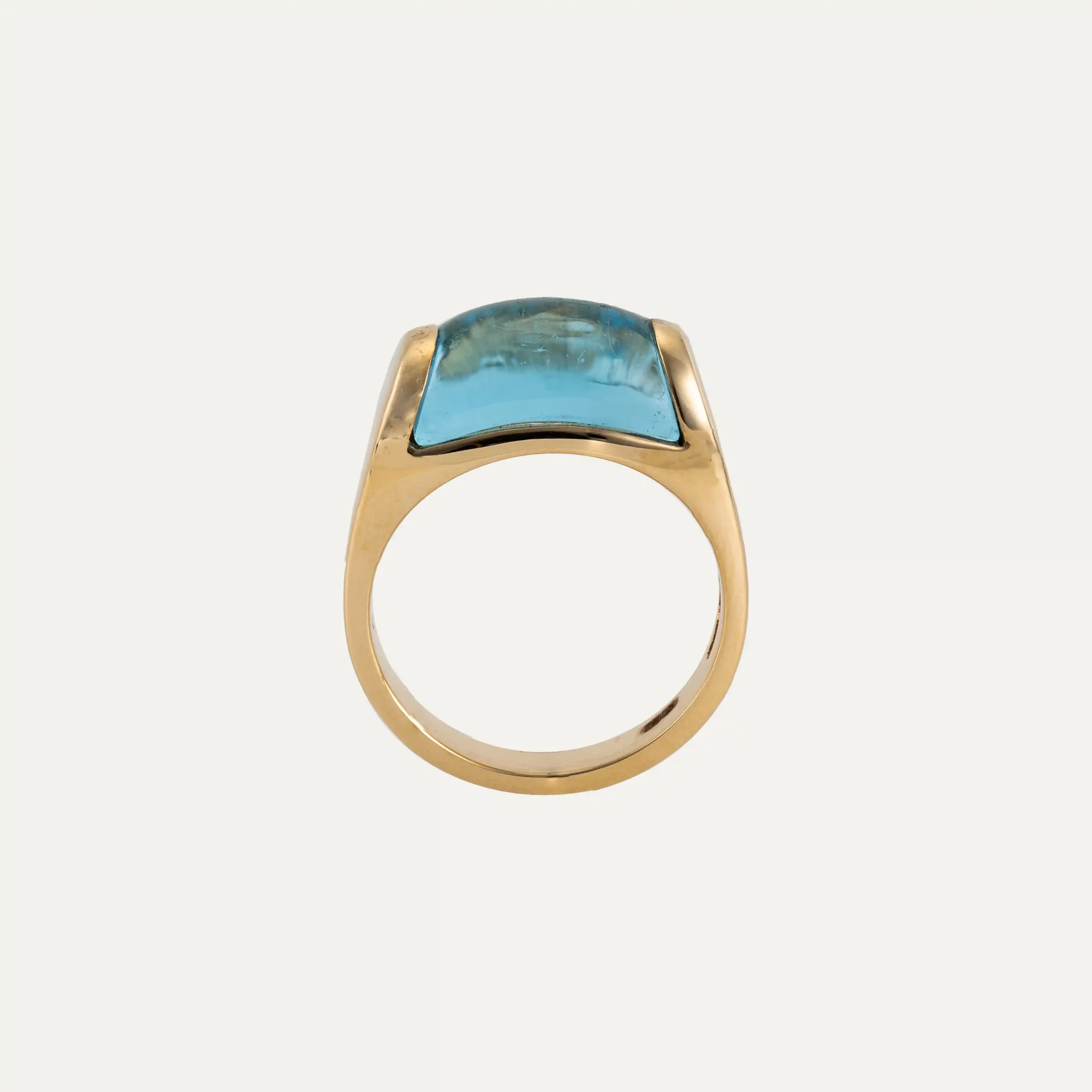 Anel Trochetto da Bulgari, em ouro amarelo 18 kt – 750 ‰, com topázio azul de corte trapezoidal. Assinado Bulgari. Acompanha documento de intervenção da Bulgari e caixa original da marca. Itália, cerca de 1980. Contraste italiano e remarcado com contrastes portugueses pós-2021.