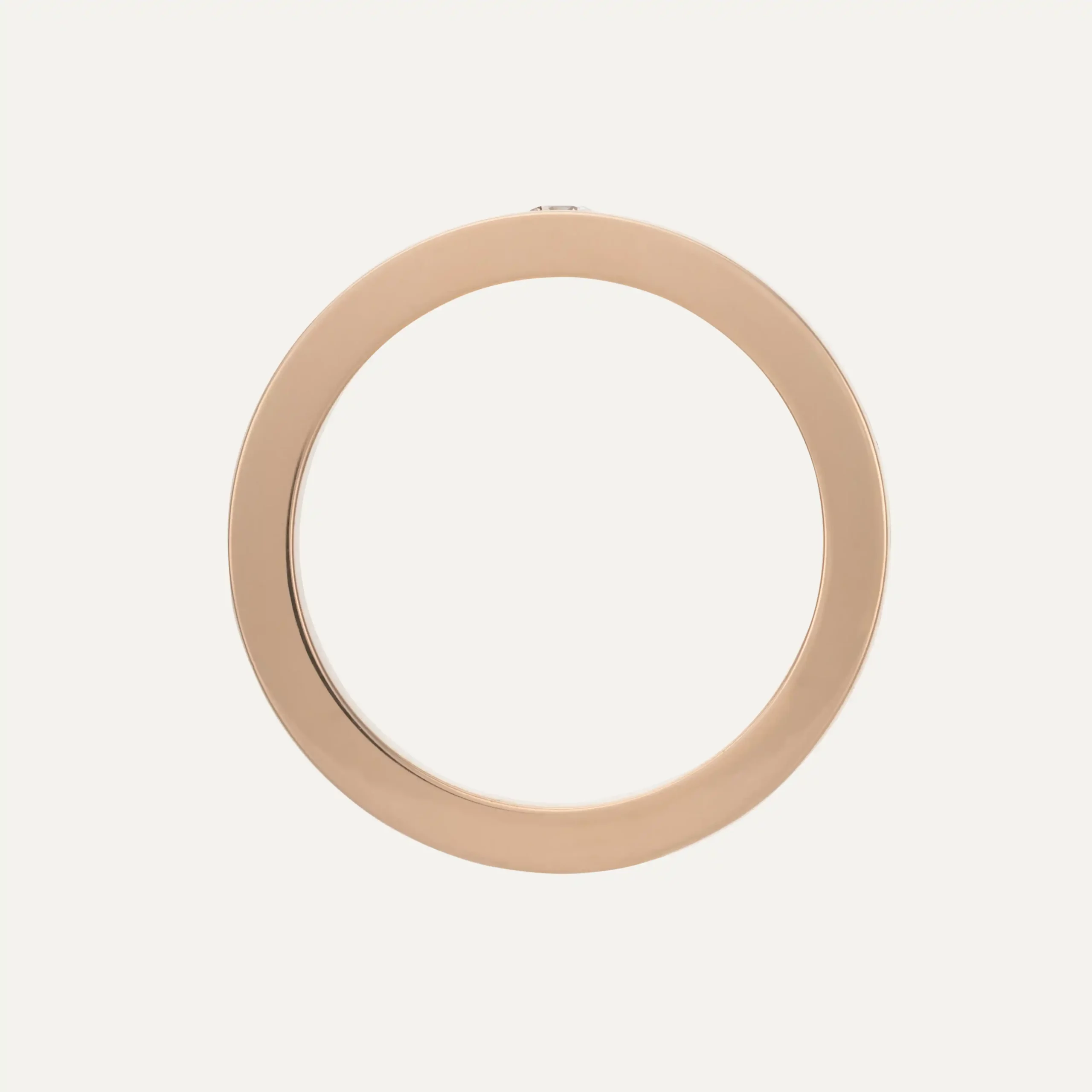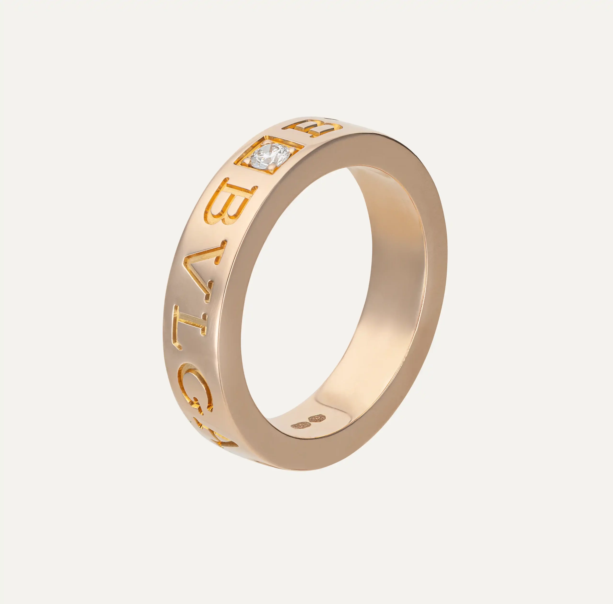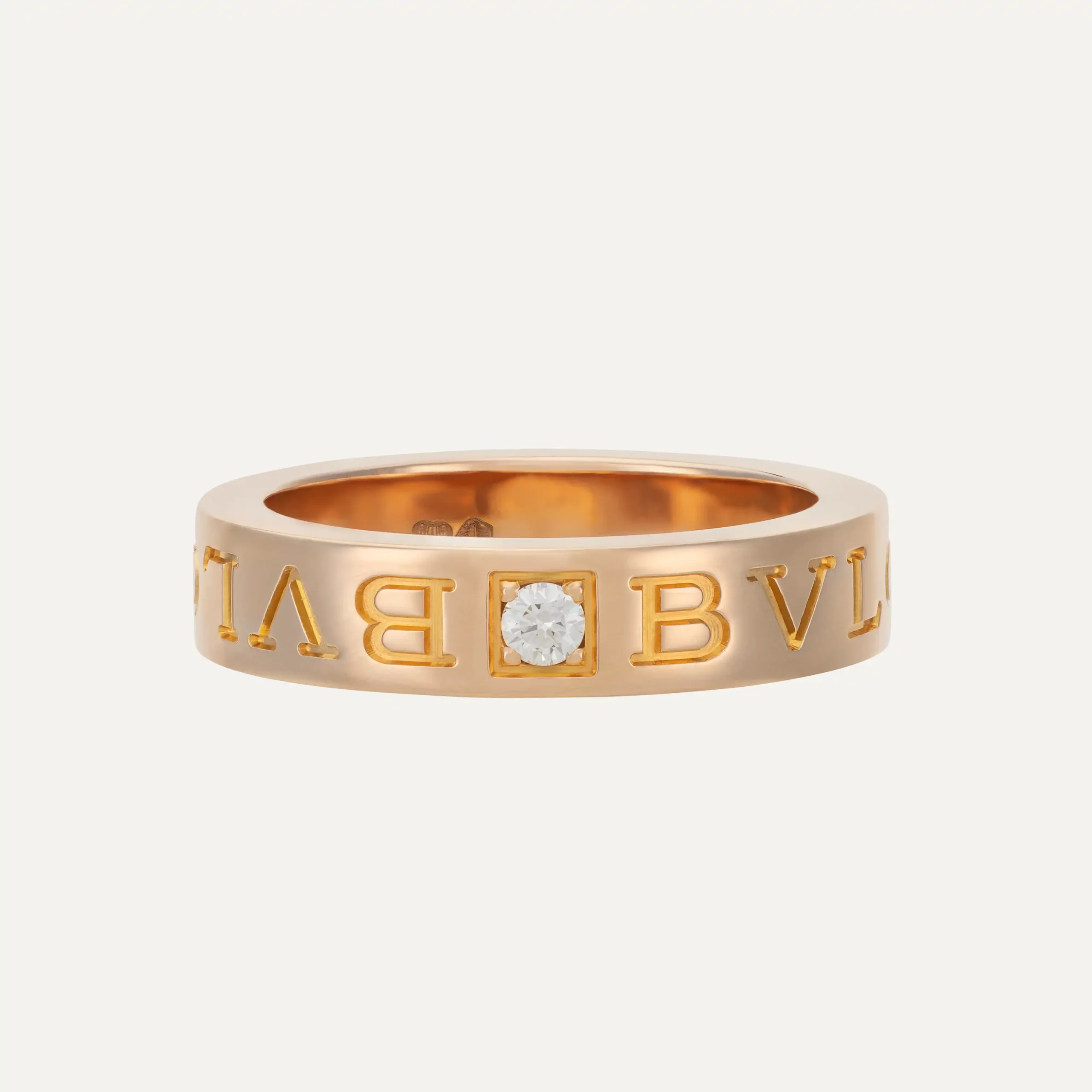 Feito em ouro rosa de 18 quilates, o anel é cravejado com um único diamante de lapidação brilhante que acrescenta um ponto de luz subtil à superfície quente do ouro. O logótipo Bulgari gravado emoldura a aliança, servindo como assinatura e elemento de design da linha B.Zero1.