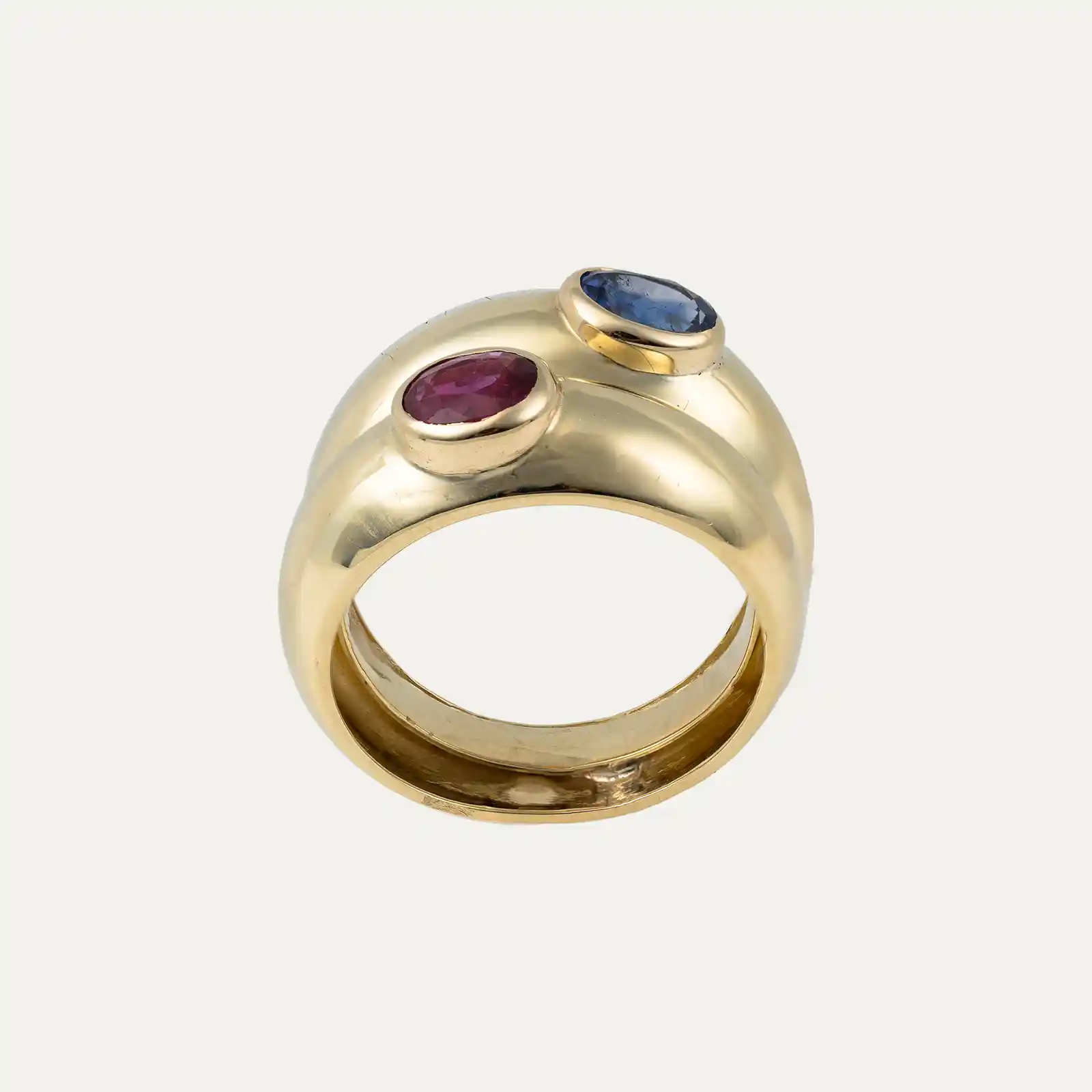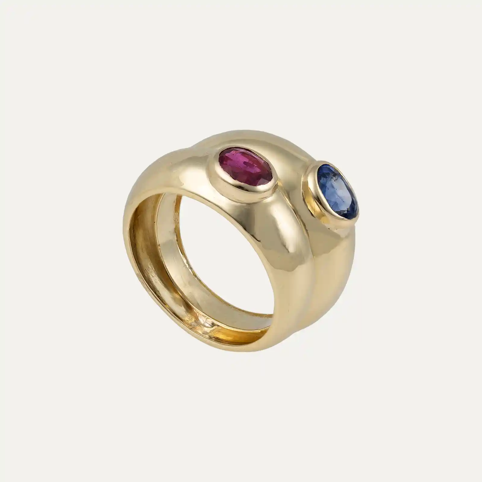 Anel duplo em ouro amarelo 14kt – 585‰, com um design volumoso e curvas suaves polidas, proporcionando um acabamento elegante. Cravado com um rubi lapidado em forma oval, com cerca de 0.50ct, e uma safira lapidada em form oval, com cerca de 0.69ct, criando um contraste sofisticado e harmonioso.