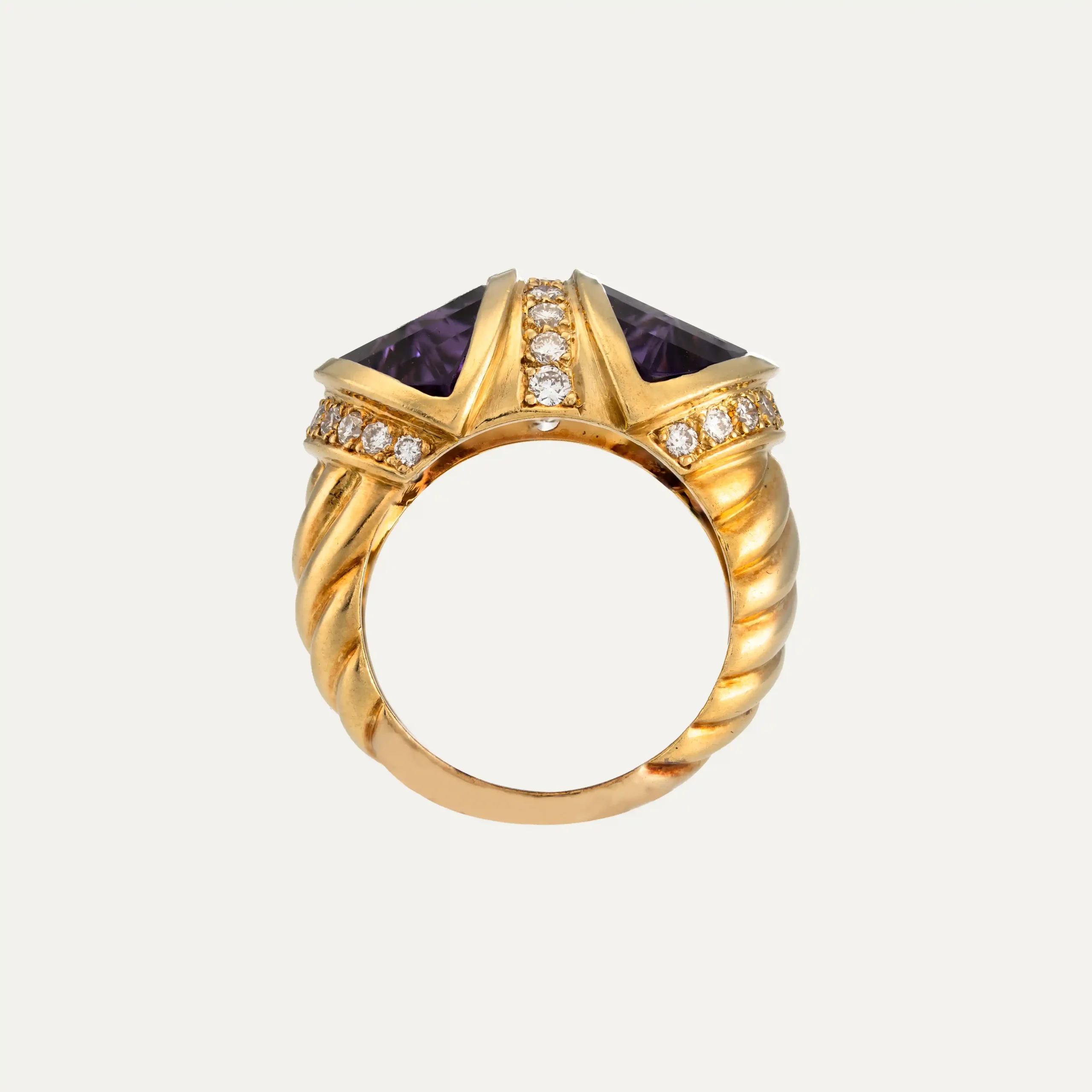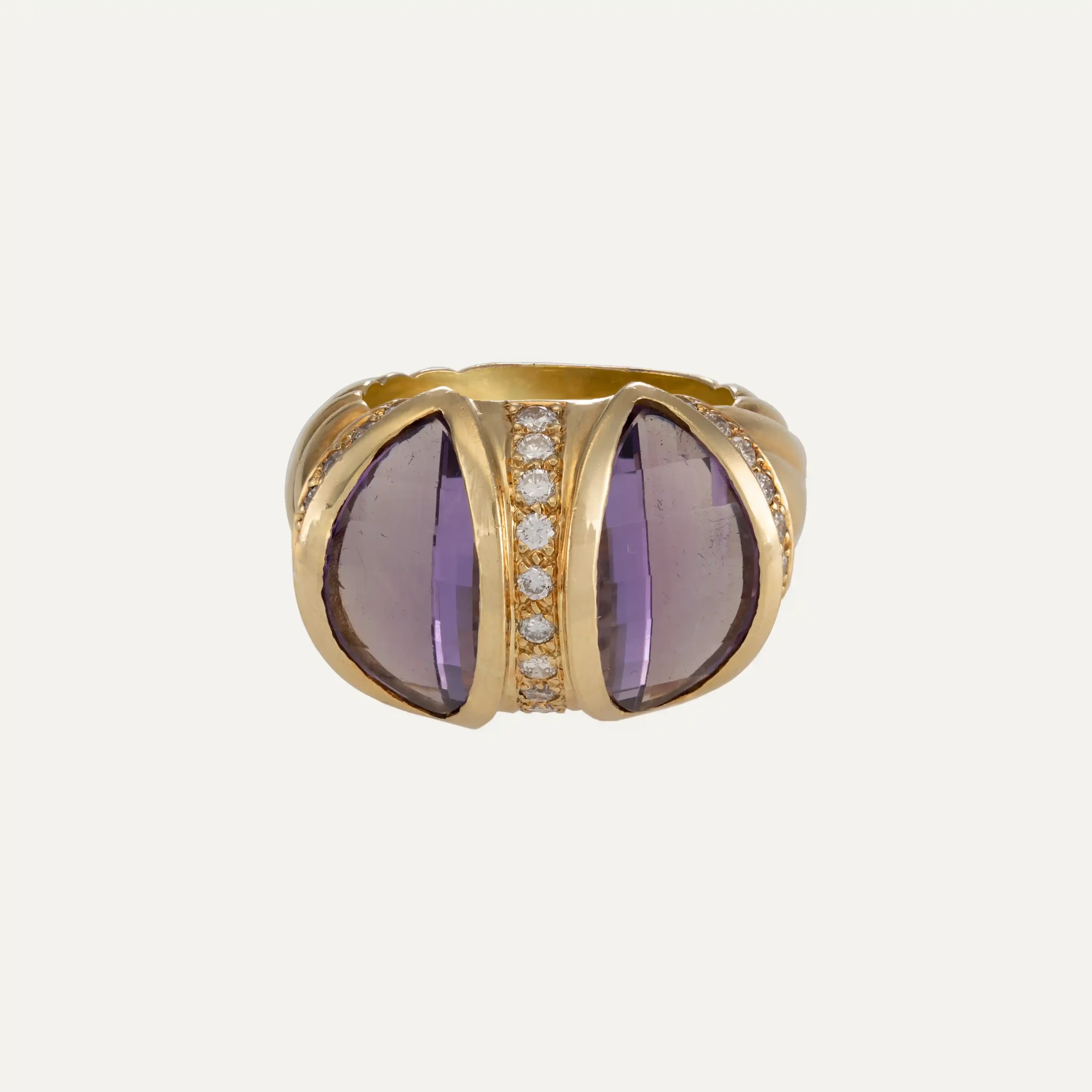 Anel em ouro amarelo de 18kt – 750‰, com design volumoso e detalhes de sulcos no aro. Enriquecida com 30 diamantes de talhe brilhante, que realçam o brilho e sofisticação, e 2 ametistas em tom violeta intenso, lapidadas em corte fantasia trapezoidal com superfície facetada, conferindo profundidade e luminosidade.