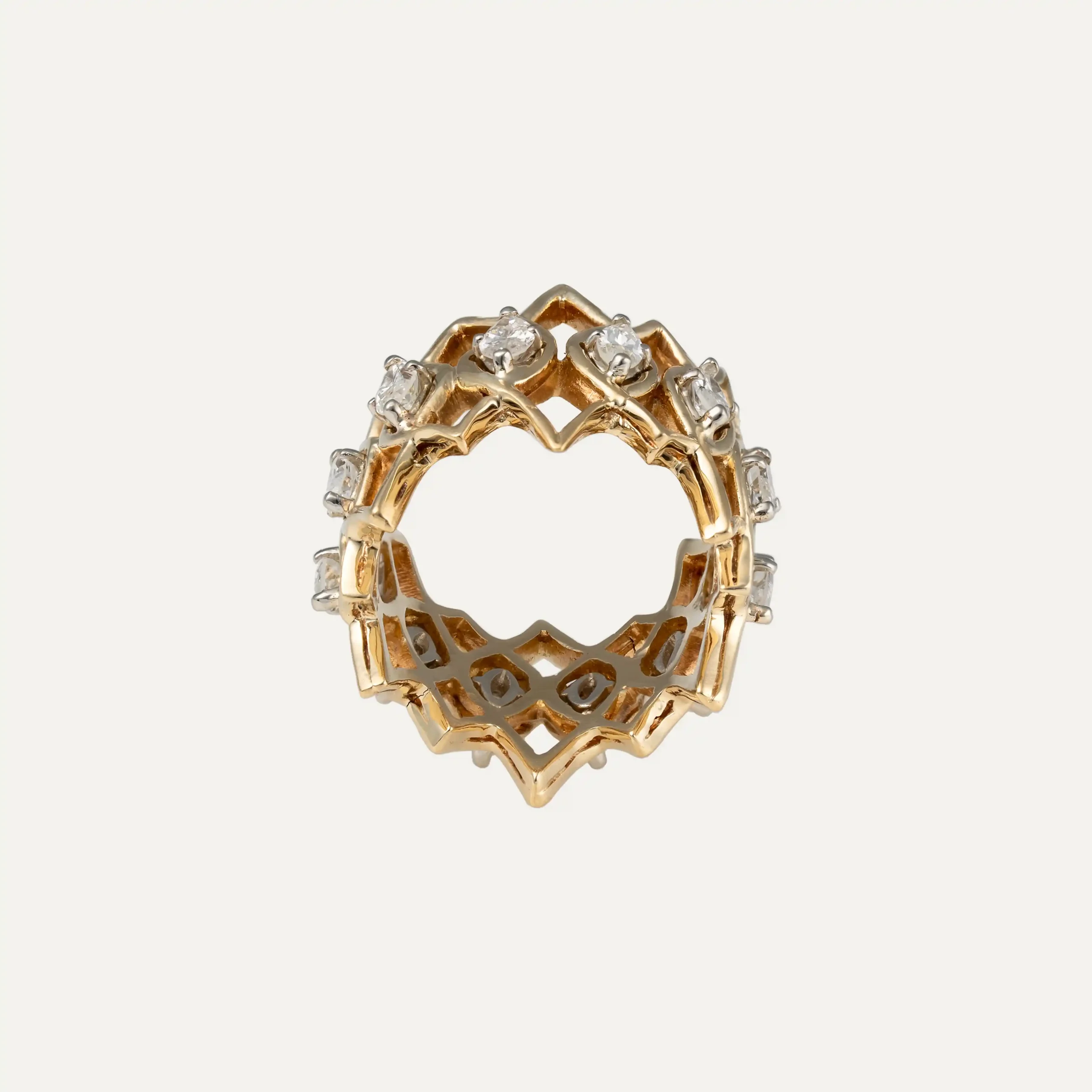 Anel em ouro amarelo 14kt – 585‰, com um design geométrico e estrutura vazada. Apresenta losangos simétricos no interior, nos quais estão cravados 12 diamantes em talhe marquise, com cerca de 1.44ct no total.