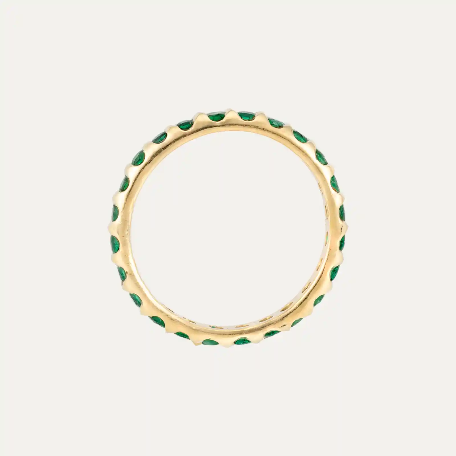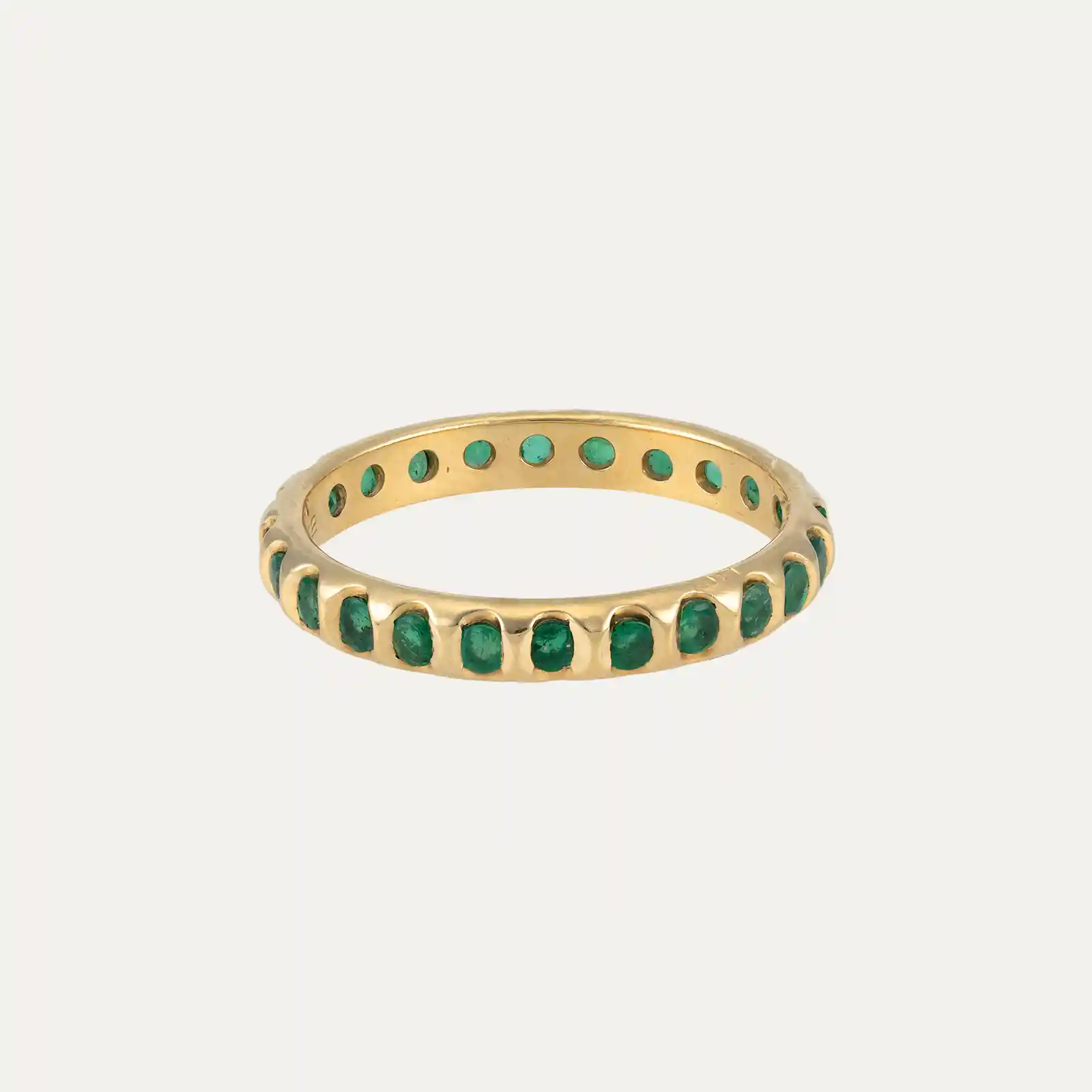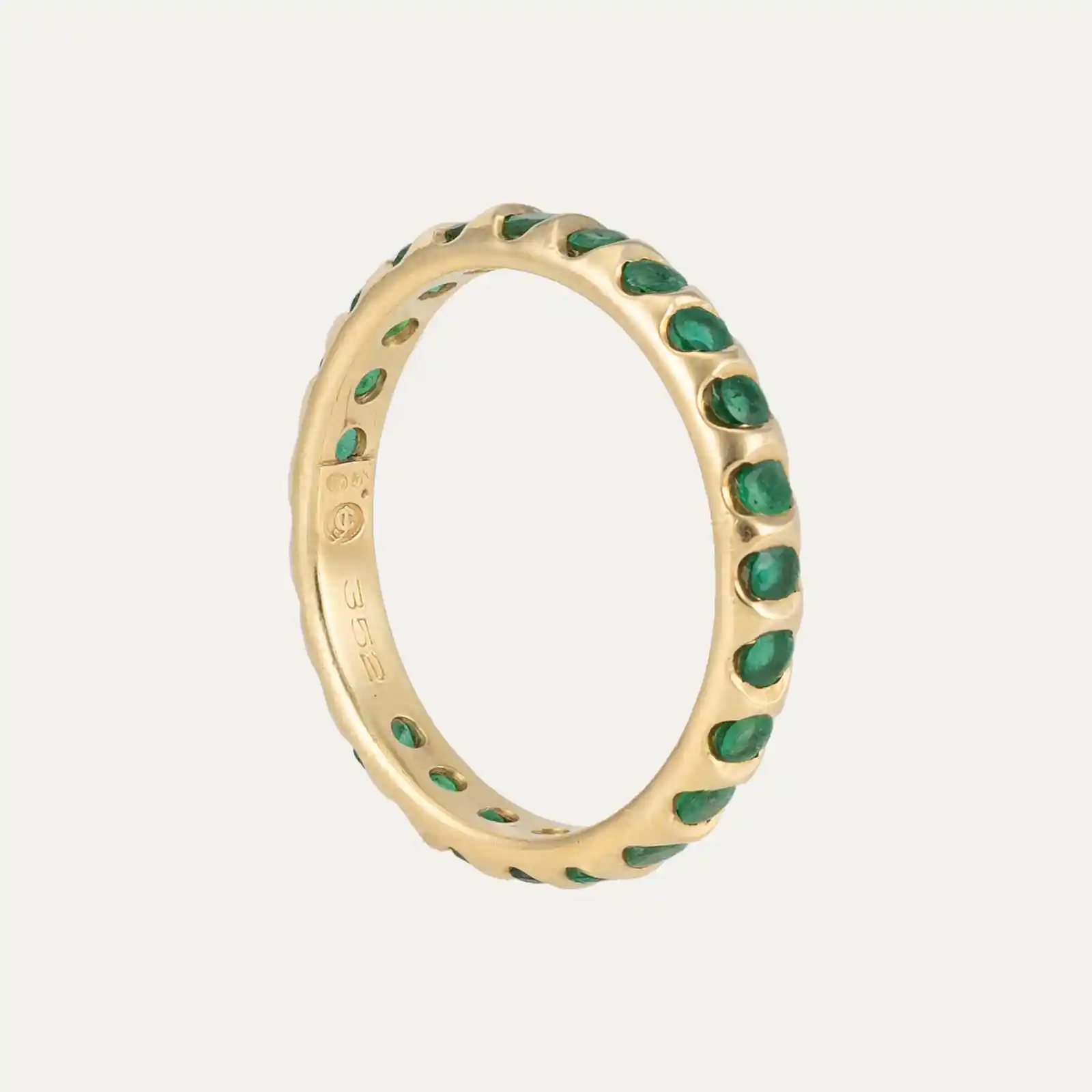 Anel em ouro amarelo 18kt – 750‰, adornado com uma fileira contínua de 24 esmeraldas, distribuídos ao longo de todo o anel.