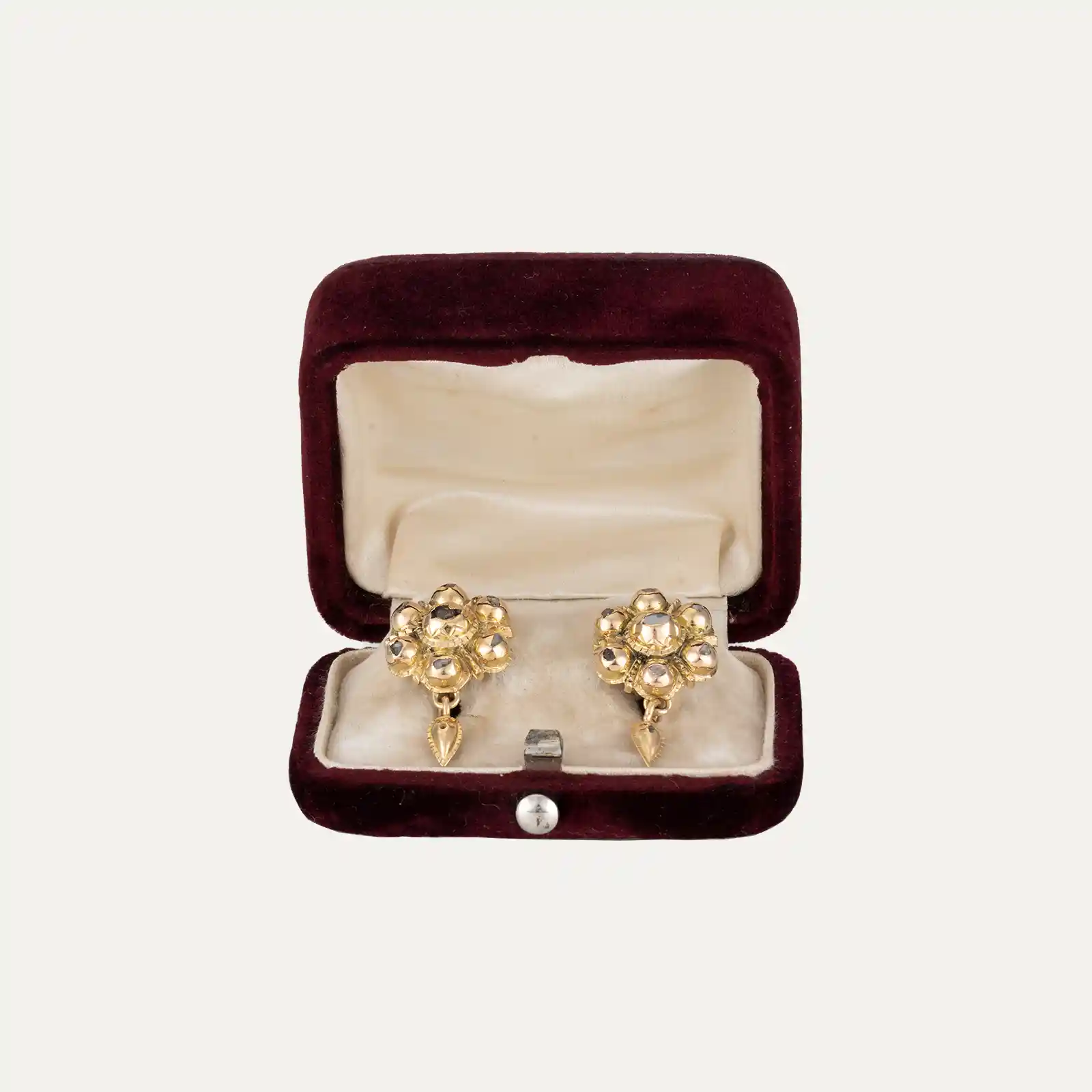 Brincos em ouro amarelo com 16 diamantes talhe rosa, séc. XVIII. Sem marcas, ao abrigo do Decreto-Lei nº 120/2017, de 15 de Setembro – art. 2º, nº 2, alínea c).