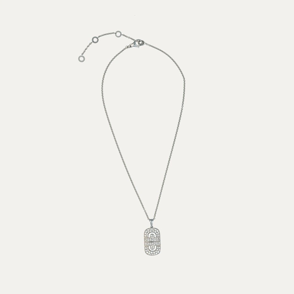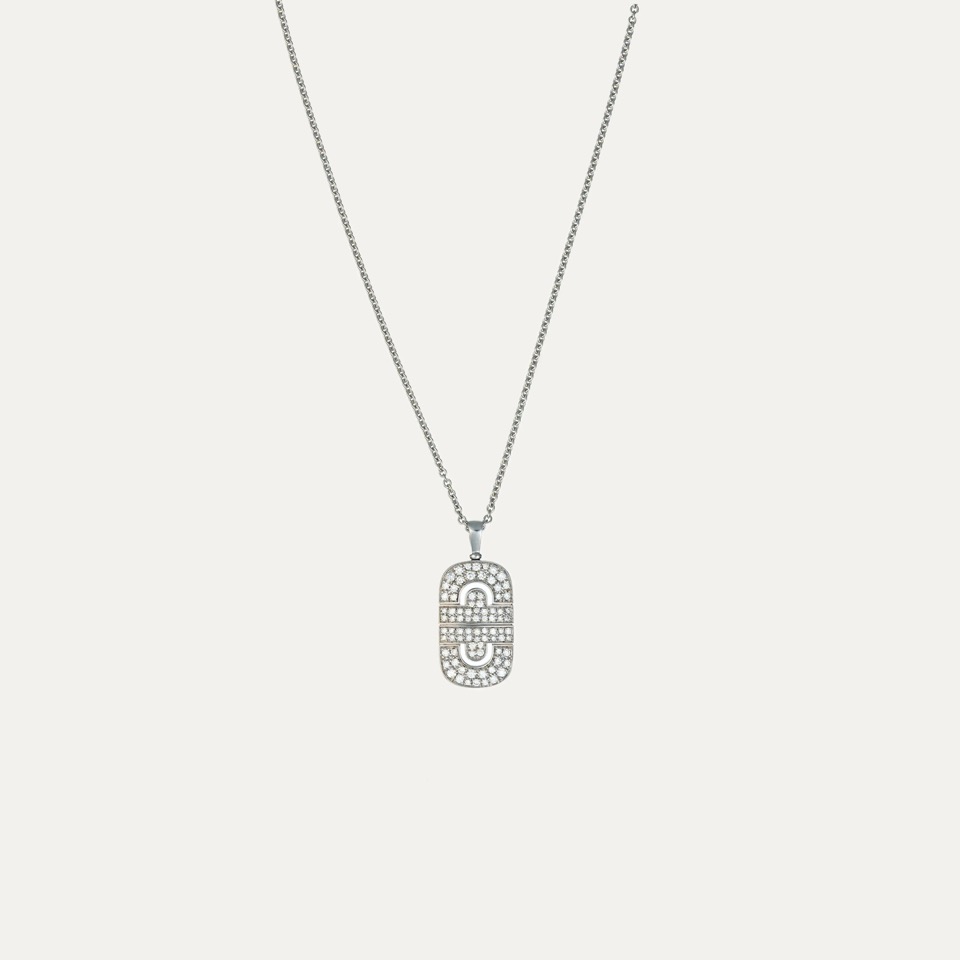Colar Bulgari ouro branco 18kt – 750‰, da coleção Parentesi. Inspirado no icónico design Parentesi, com um padrão entrelaçado e geométrico que evoca as pedras de calçada que cobriam as antigas estradas de Roma. Cravado com pavê de 84 diamantes talhe brilhante com cerca de 1.4ct no total, cor G e pureza VS. Assinado Bulgari, marcas italianas. Ajustável em 4 comprimentos 38, 40.5, 43 e 45cm. Com bolsa Bulgari. Este colar faz parte do conjunto com o anel da Ref:9003672.