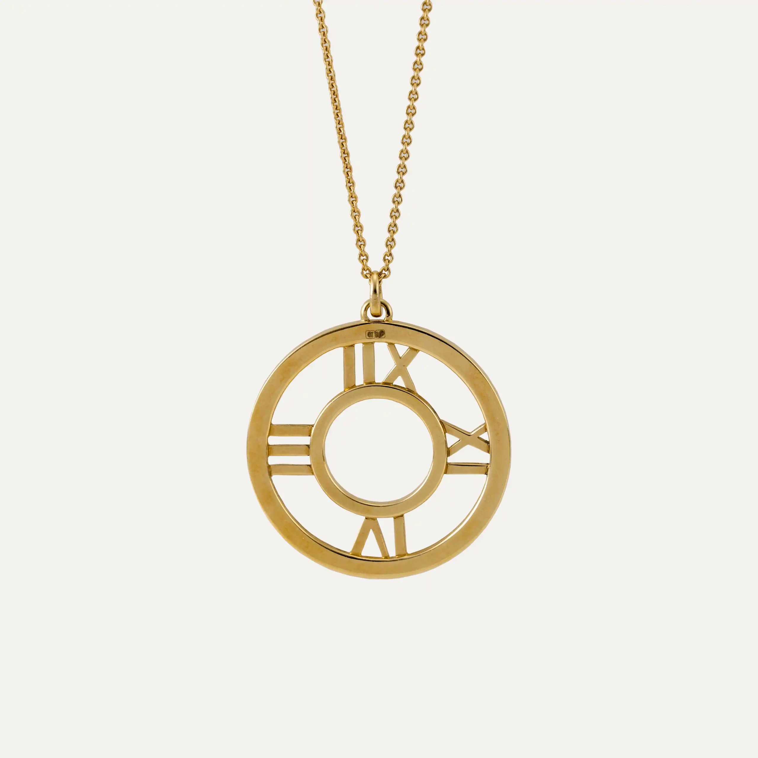Colar Tiffany & Co. ouro amarelo 18kt – 750‰, da coleção Atlas, lançada em 1995, simboliza a força e a intemporalidade da marca. Apresenta um pendente circular com algarismos romanos recortados, uma homenagem ao relógio Tiffany Atlas introduzido pela Tiffany em 1853 na fachada da loja principal na Quinta Avenida. Esta coleção alia simplicidade e sofisticação, captando a essência do tempo e transformando-a num ícone de elegância contemporânea. Caixa original Tiffany. Assinado Tiffany & Co.